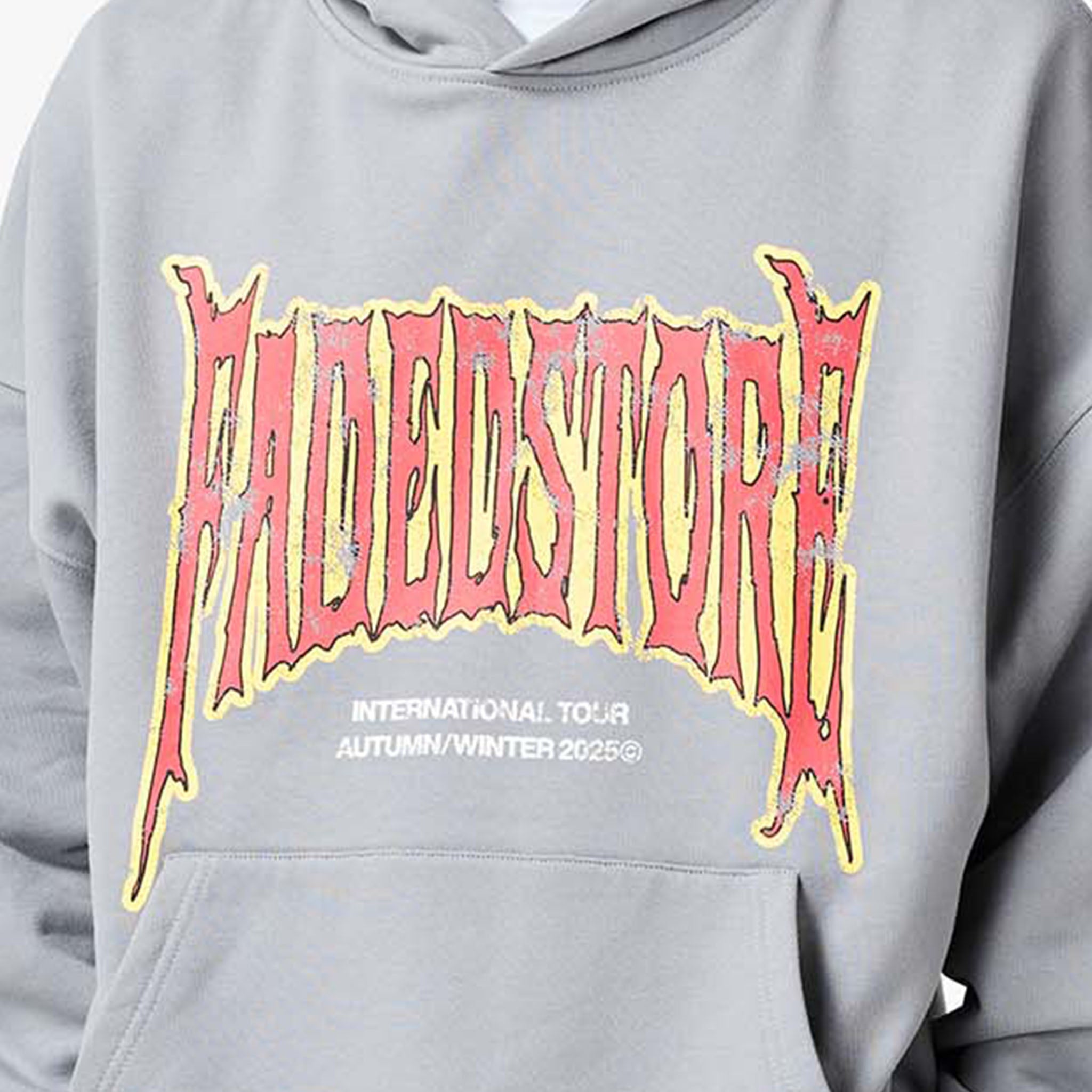 Meet your new go-to for comfort: the FadedStore Blackletter Tracksuit in sophisticated Mid Grey. Both the hoodie and joggers are crafted from heavy-duty 422 GSM cotton, promising a luxurious feel and lasting warmth. The Hoodie defines a relaxed style, featuring a prominent FadedStore chest logo, a distinctive cross-over front hood, and a comfortable dropped shoulder seam. The matching Open Hem Joggers offer a modern, clean silhouette with an internal poly drawcord integrated into a neat cut-and-sew waistband for a personalized fit. Practicality is built in with curved side pockets and rear pockets. Signature branding, including the bold Blackletter graphic on the jogger side and the subtle 'F' logo accent, underscores the premium quality of this essential set.