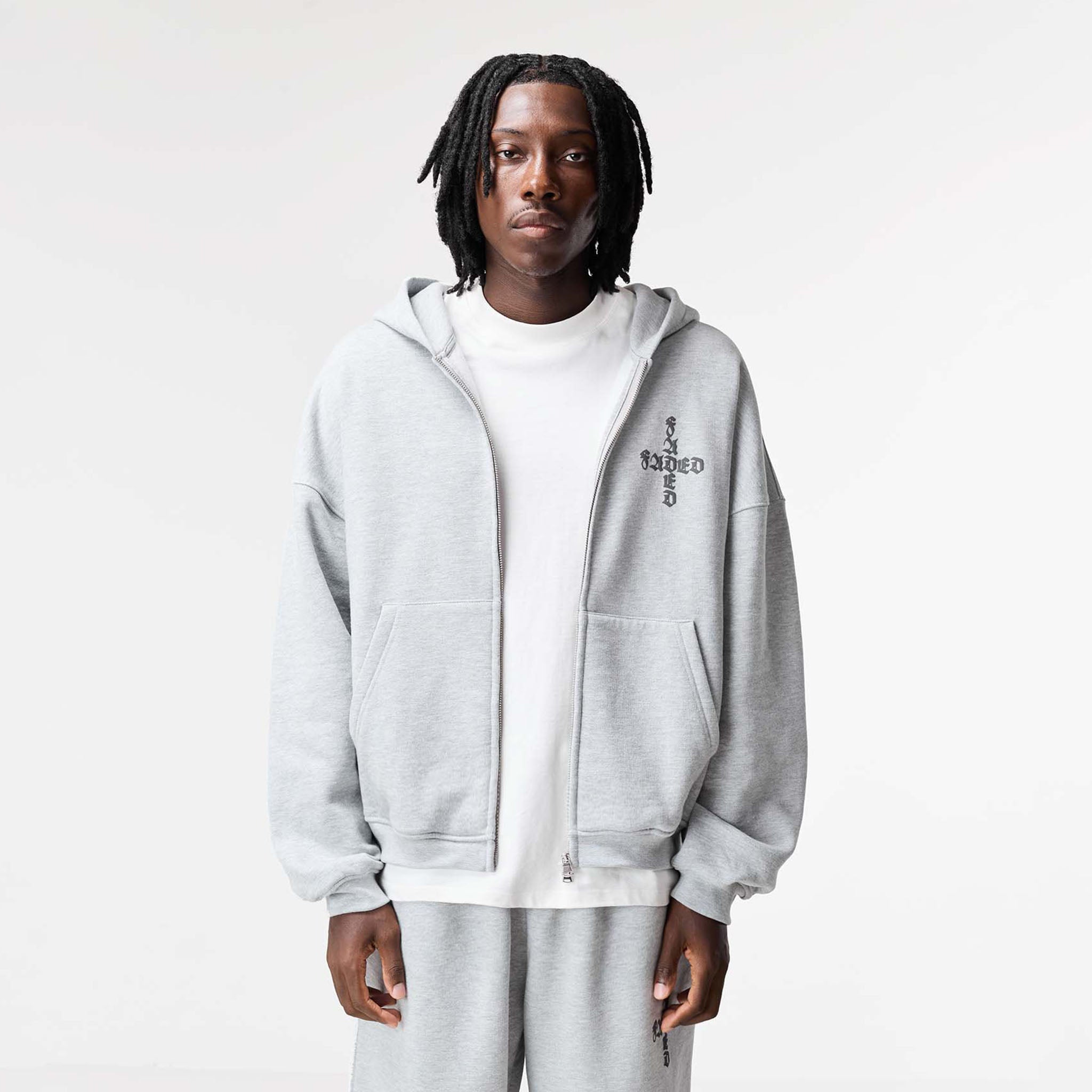 Upgrade your streetwear style with the FadedStore Gothic 2.0 Full Zip Hoodie, now in a sophisticated grey marl and showcasing our iconic Gothic 2.0 print. This hoodie is cut for a modern relaxed-fit silhouette, featuring a seamlessly lined hood for unparalleled comfort and warmth. It's equipped with a dual-zip closure for adaptable styling, while the ribbed cuffs and hemline provide a secure, tailored feel. Concealed zip pockets offer practical storage for your essentials. Completed with our signature FadedStore embroidered logo on the sleeve, complemented by distinct branding details on both the chest and back, ensuring your style is recognised from every angle. Constructed from substantial 422GSM cotton, this piece delivers both enduring style, comfort and warmth. Team with the matching loose fit open hem joggers to complete the look.