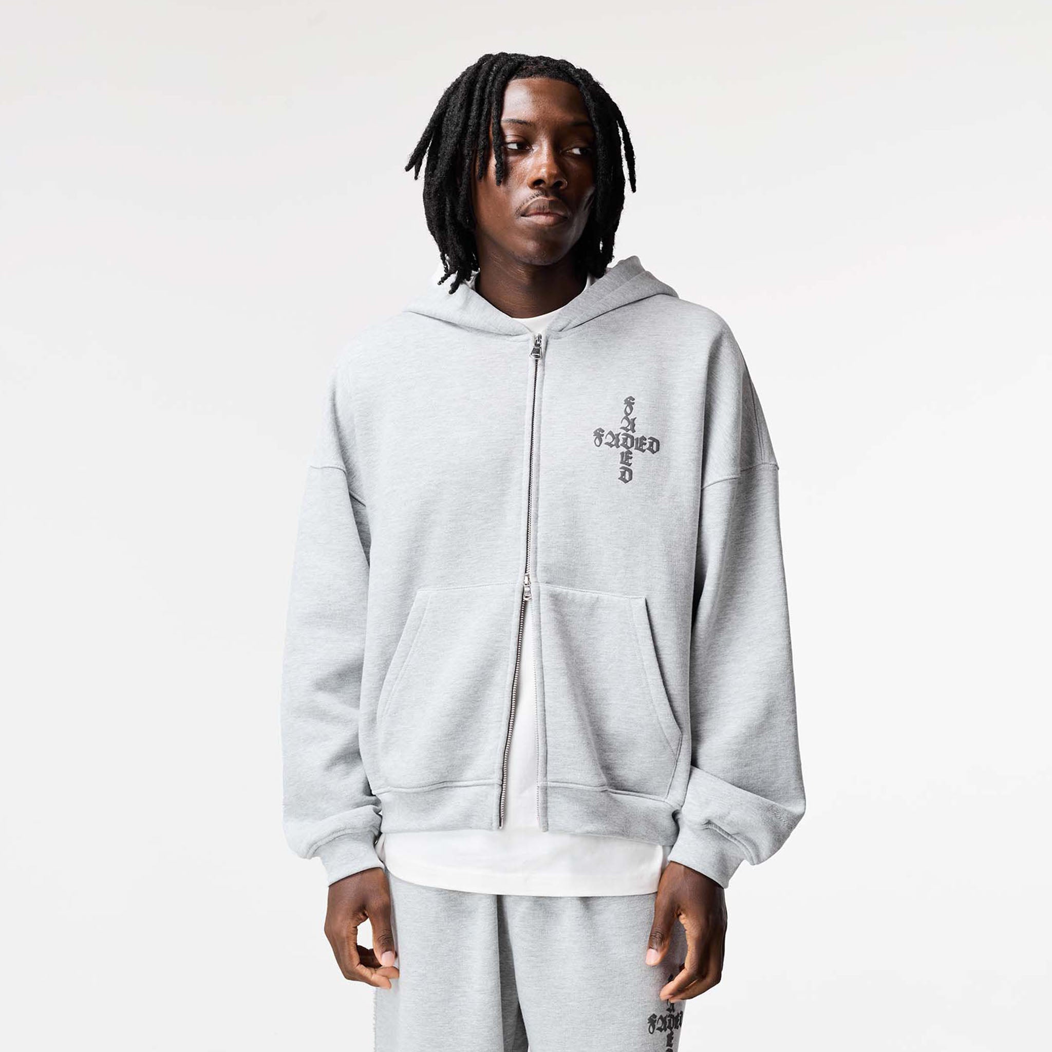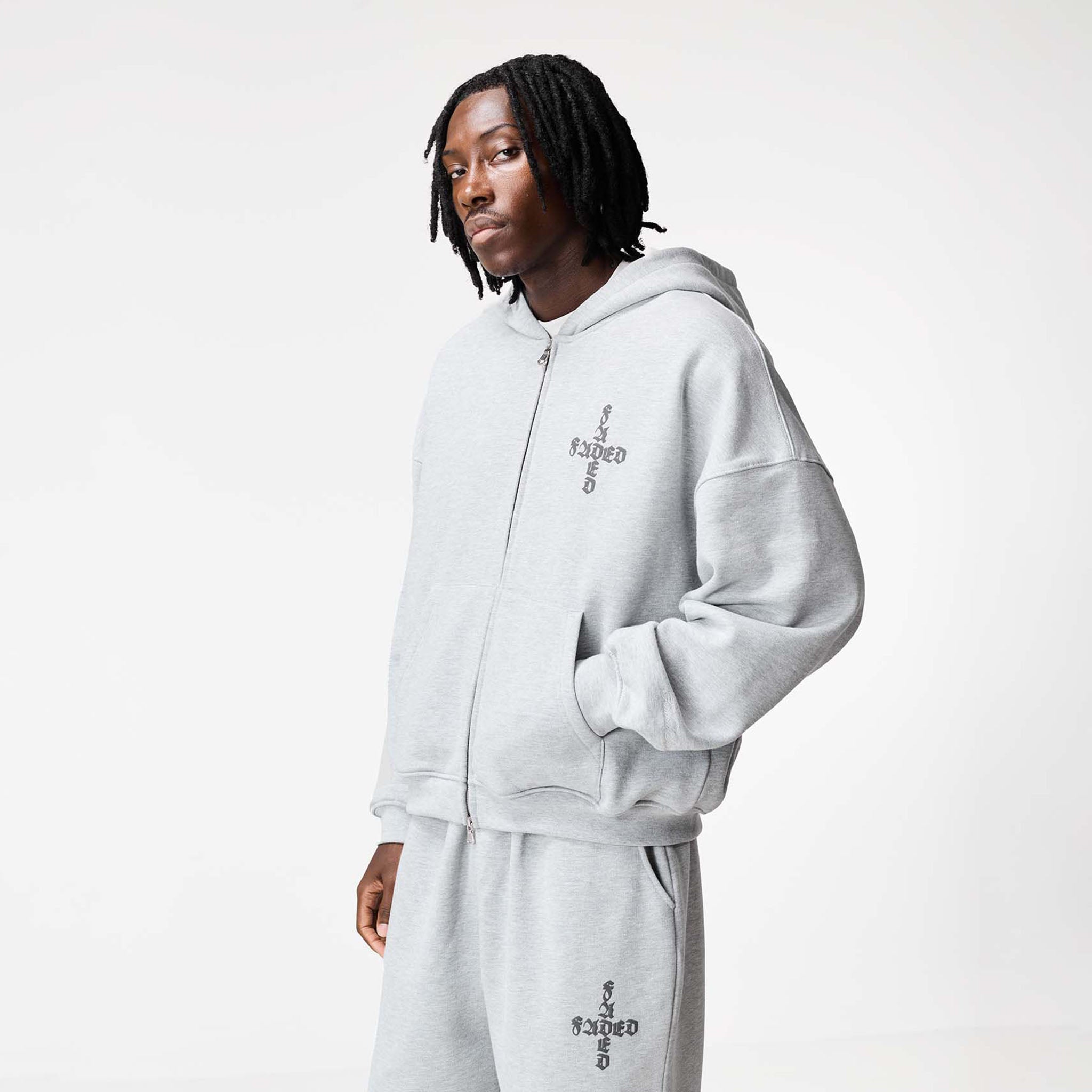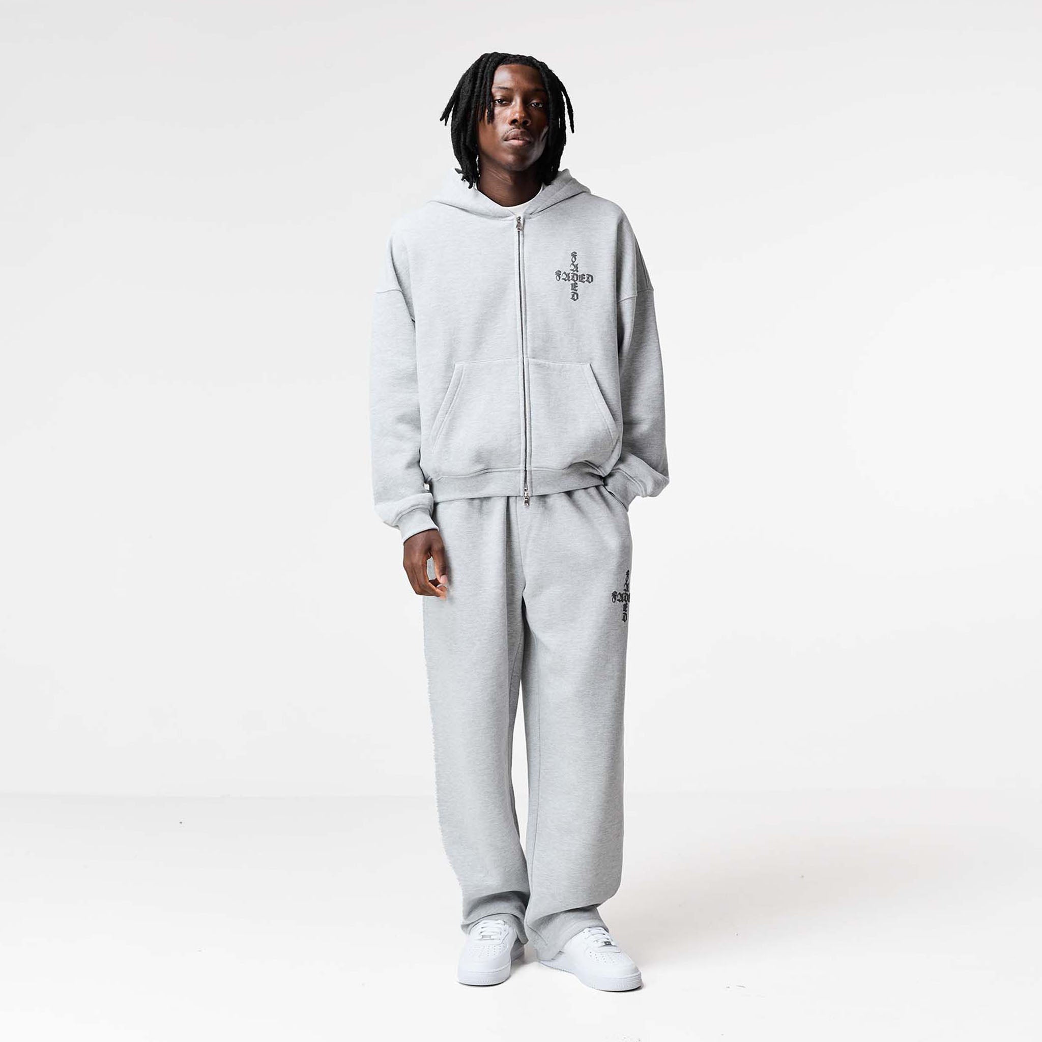 Elevate your casual wear with the FadedStore Gothic 2.0 Tracksuit in Grey Marl. Featuring our iconic Gothic 2.0 design, this tracksuit is a statement from every angle. The Full Zip Hoodie has a modern box fit with a concealed double zipper for versatile styling and a one-piece lined hood for ultimate comfort. Ribbed cuffs, a hem, and zipped pockets provide a premium feel and secure storage. Branded with the FadedStore embroidered logo on the sleeve, chest, and back, this piece delivers on both style and warmth. The matching Loose Fit Open Hem Joggers offer a contemporary take on classic comfort. Designed with a relaxed silhouette, they feature a stylish open hem and an integrated waistband with internal drawcords for a perfect fit. The embroidered Gothic logo on the pocket adds an authentic touch. Both pieces are crafted from a substantial 422GSM cotton, ensuring a soft feel, enduring quality, and lasting warmth.
