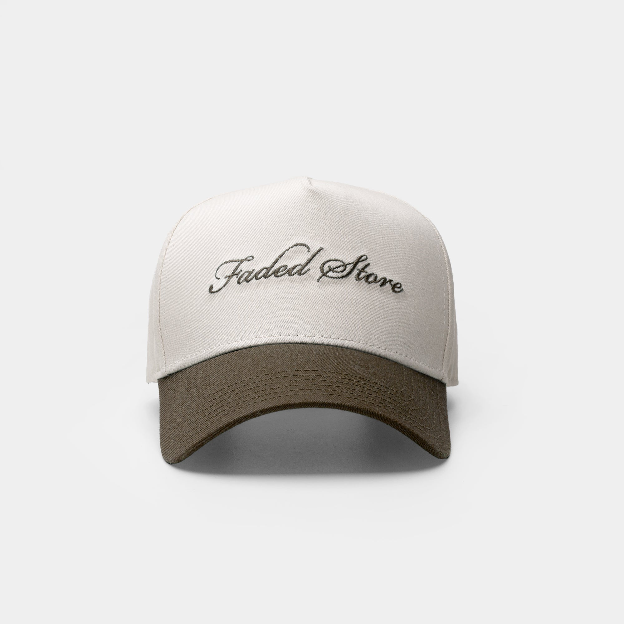 Discover the iconic Faded Script Cap in Off White/Tauope. Sporting a curved contrast peak and top panel, this cap boasts a flat-embroidered Fadedstore logo across the front. It includes rear eyelets for breathability and a snapback adjuster for the perfect fit, complete with a Fadedstore woven label.