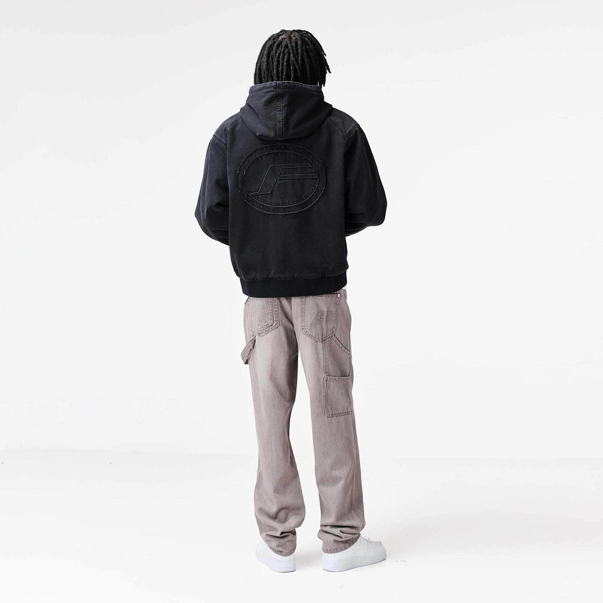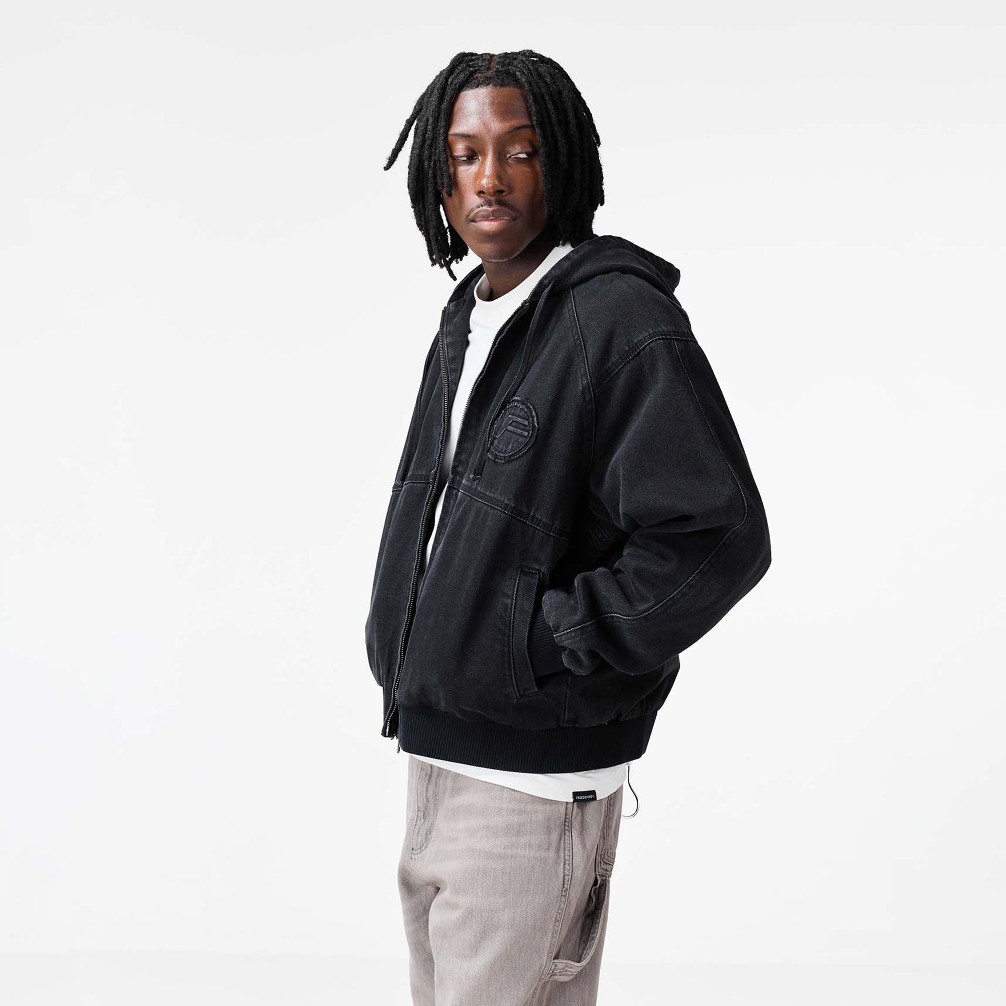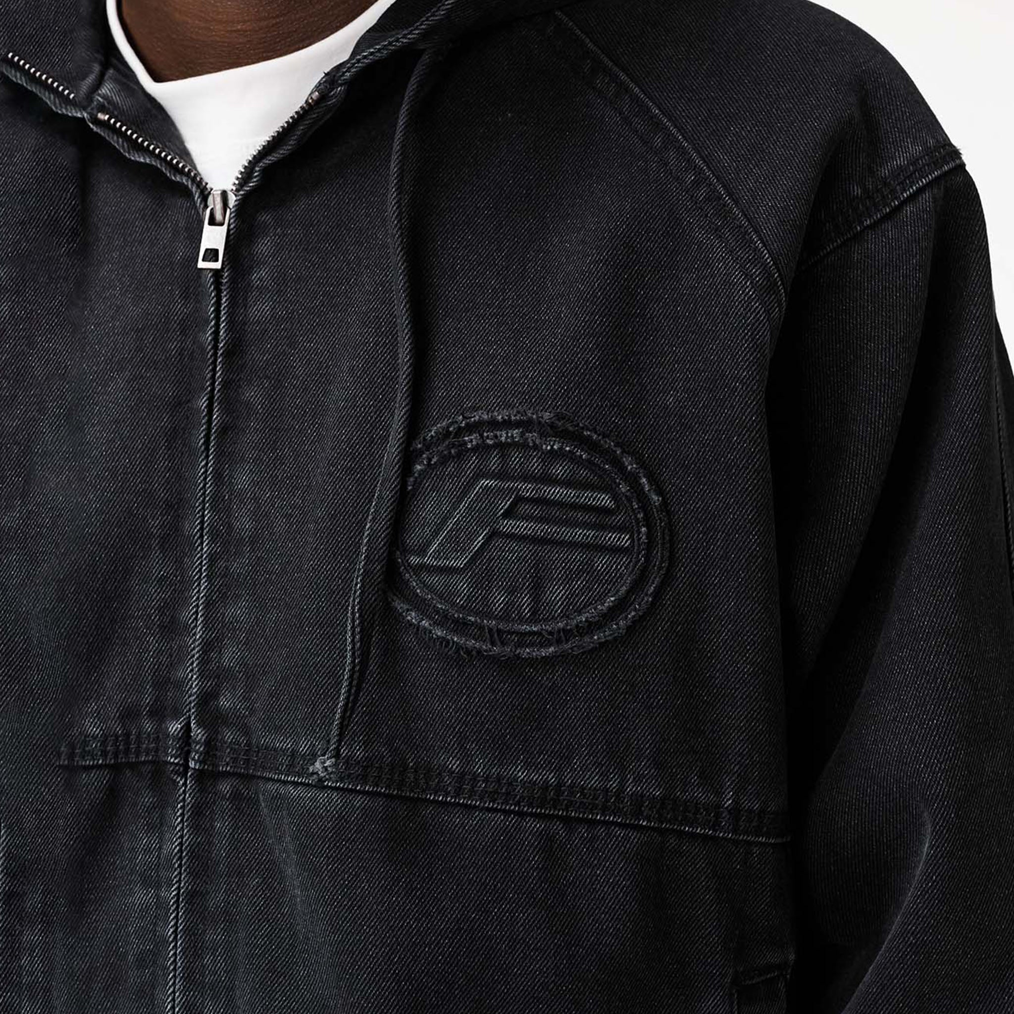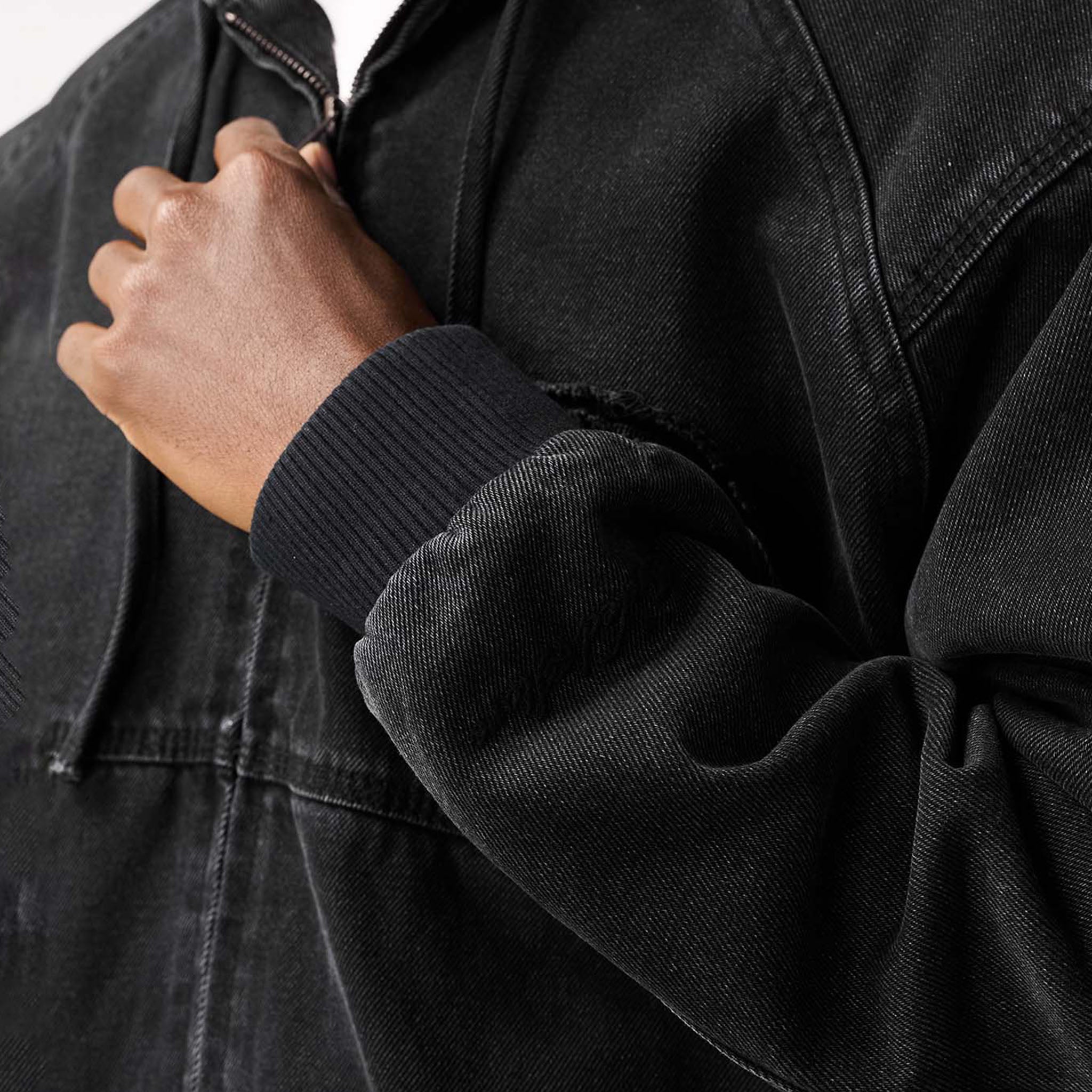 Elevate your casual outerwear with the signature Denim Hooded Detroit Jacket in black wash. This style captures a classic denim aesthetic in a comfortable, versatile denim effect canvas. Designed for effortless style, it features a practical hood with flat drawcords for an adjustable fit. Unique frayed seams on the body and shoulder add a touch of streetwear authenticity, complemented by a snug ribbed hem and cuff. Built for durability, it boasts a three-needle stitch construction. The front includes a concealed double-ended zip for versatile styling and clean lines, along with convenient front welt pockets. Signature branding comes in the form of a subtle Fadedstore embroidered logo on the sleeve and bold appliqué embossed 'F' branding on the chest and rear, cementing its iconic look.