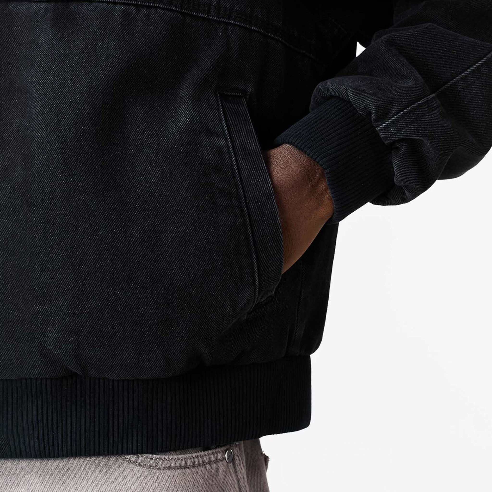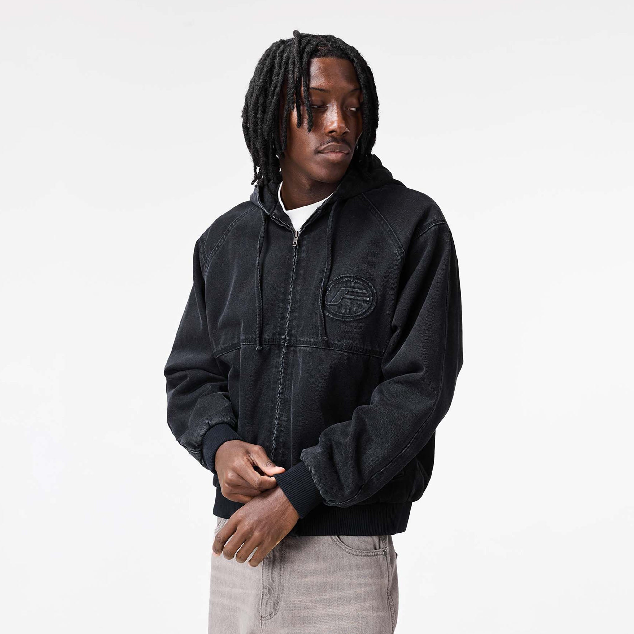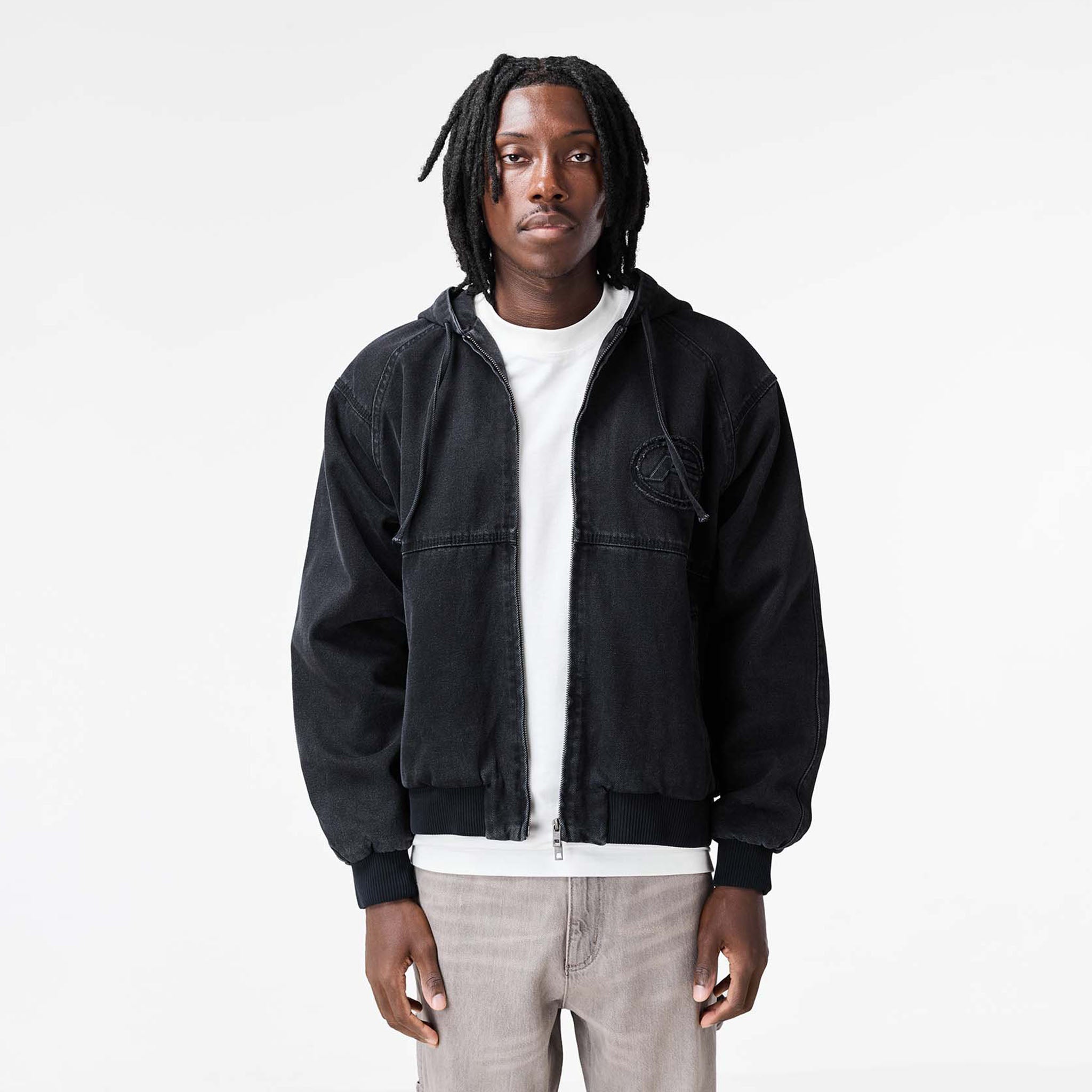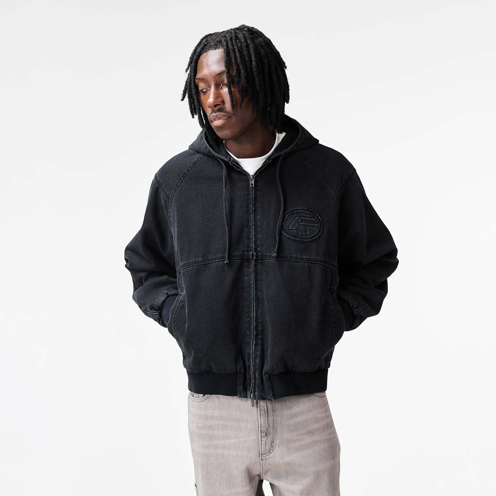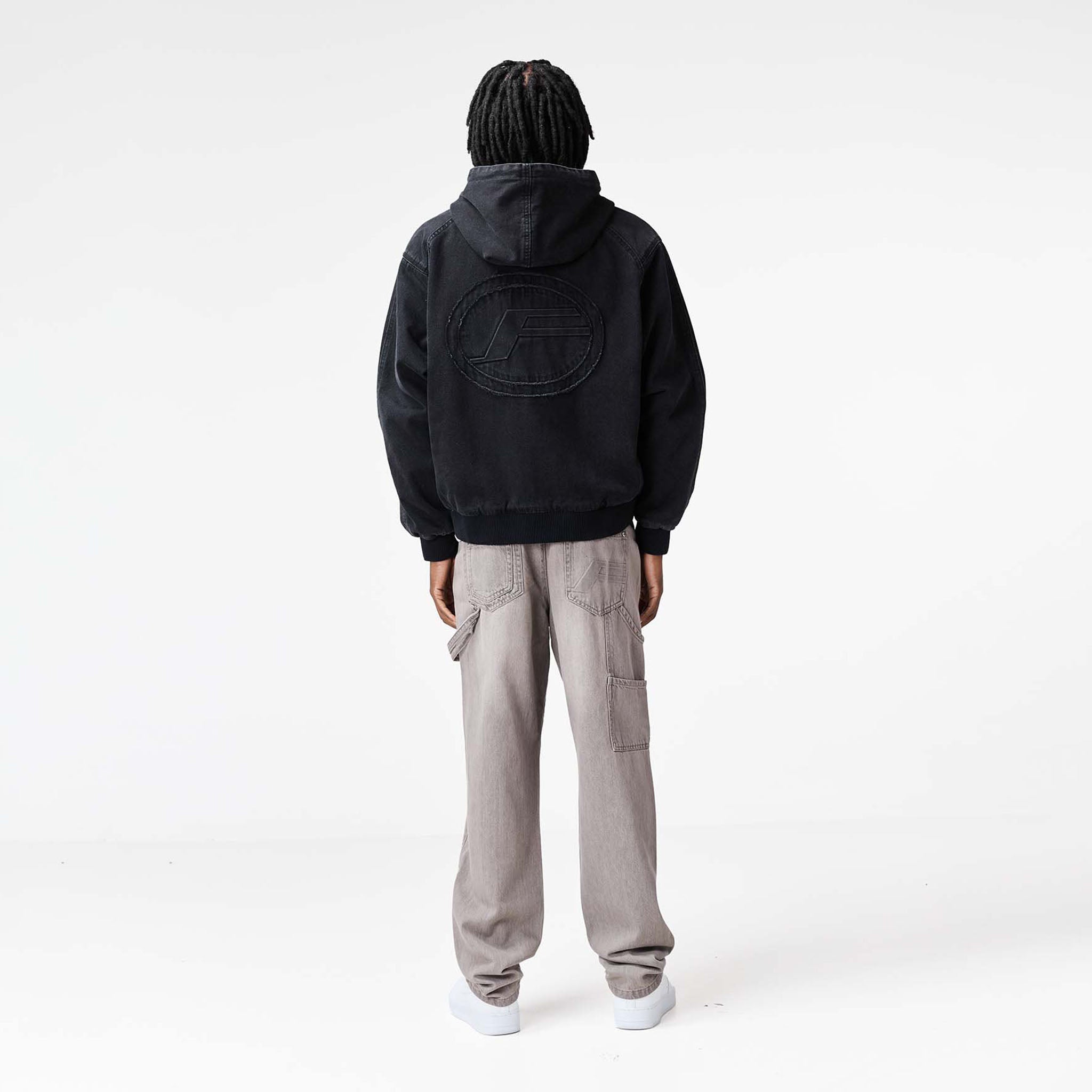 Elevate your casual outerwear with the signature Denim Hooded Detroit Jacket in black wash. This style captures a classic denim aesthetic in a comfortable, versatile denim effect canvas. Designed for effortless style, it features a practical hood with flat drawcords for an adjustable fit. Unique frayed seams on the body and shoulder add a touch of streetwear authenticity, complemented by a snug ribbed hem and cuff. Built for durability, it boasts a three-needle stitch construction. The front includes a concealed double-ended zip for versatile styling and clean lines, along with convenient front welt pockets. Signature branding comes in the form of a subtle Fadedstore embroidered logo on the sleeve and bold appliqué embossed 'F' branding on the chest and rear, cementing its iconic look.
