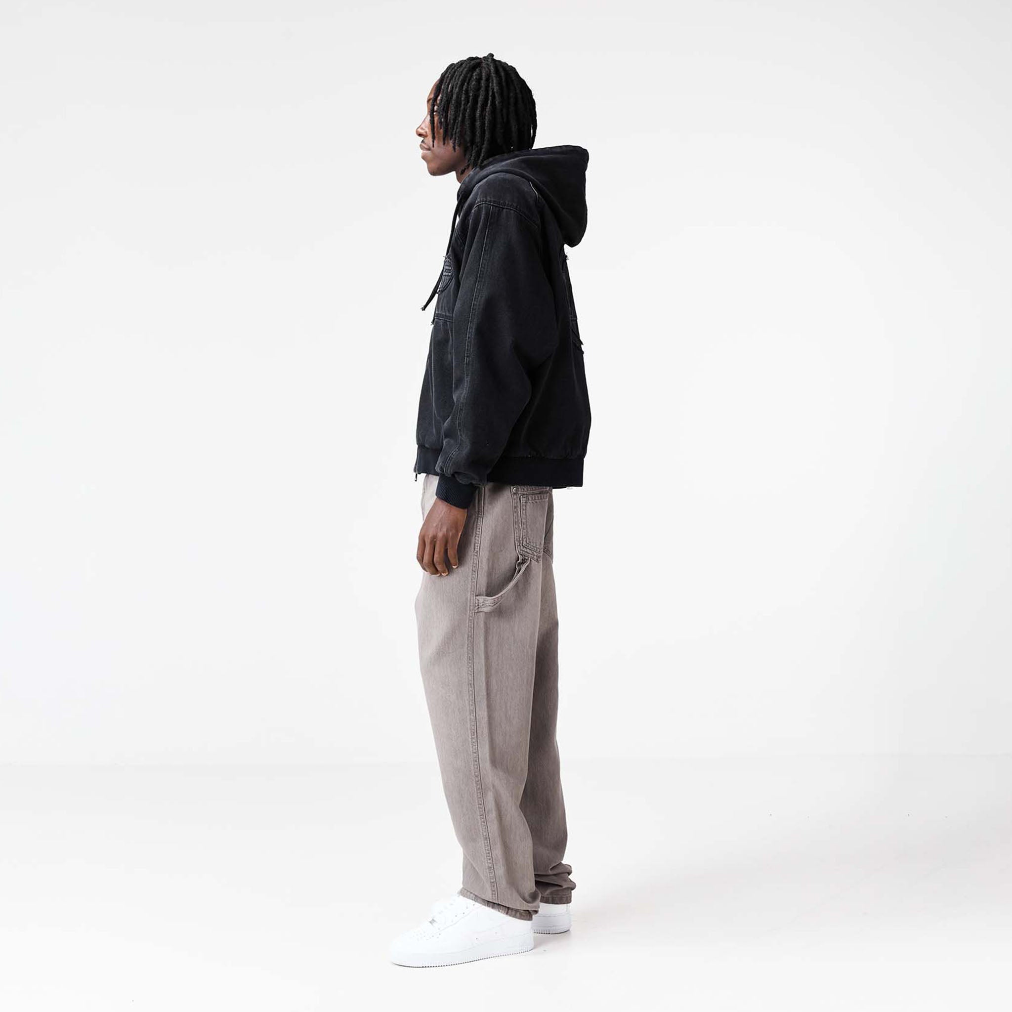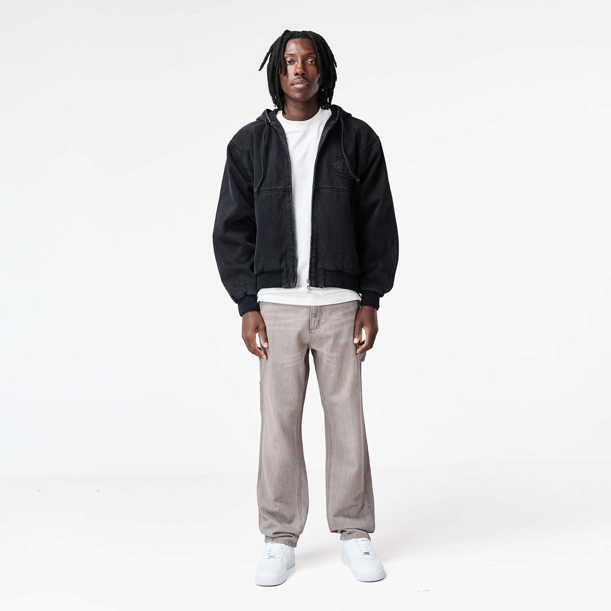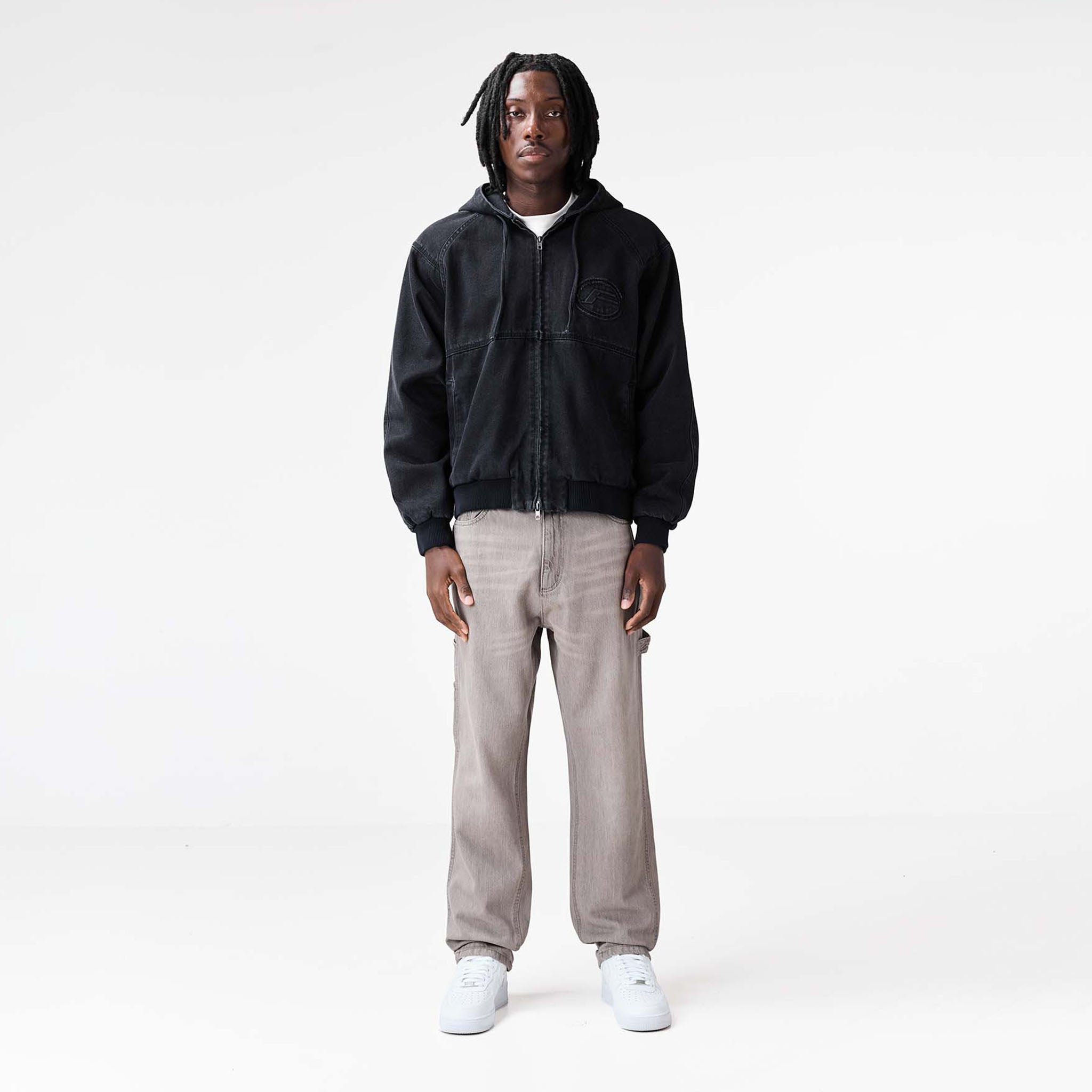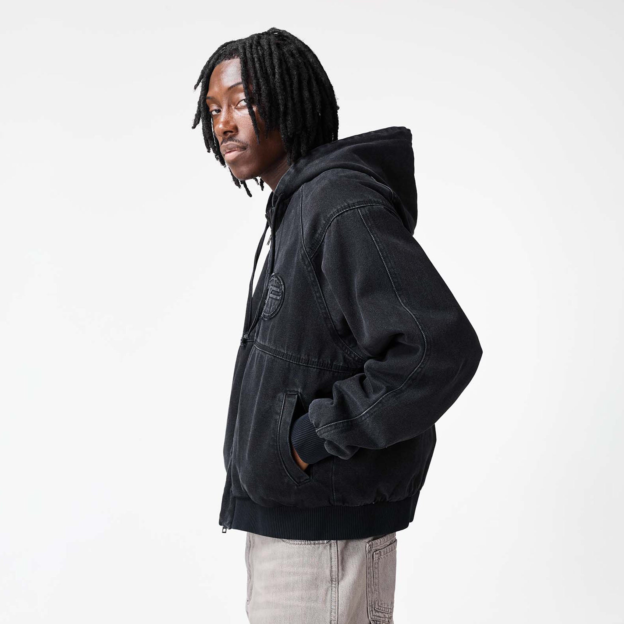 Elevate your casual outerwear with the signature Denim Hooded Detroit Jacket in black wash. This style captures a classic denim aesthetic in a comfortable, versatile denim effect canvas. Designed for effortless style, it features a practical hood with flat drawcords for an adjustable fit. Unique frayed seams on the body and shoulder add a touch of streetwear authenticity, complemented by a snug ribbed hem and cuff. Built for durability, it boasts a three-needle stitch construction. The front includes a concealed double-ended zip for versatile styling and clean lines, along with convenient front welt pockets. Signature branding comes in the form of a subtle Fadedstore embroidered logo on the sleeve and bold appliqué embossed 'F' branding on the chest and rear, cementing its iconic look.