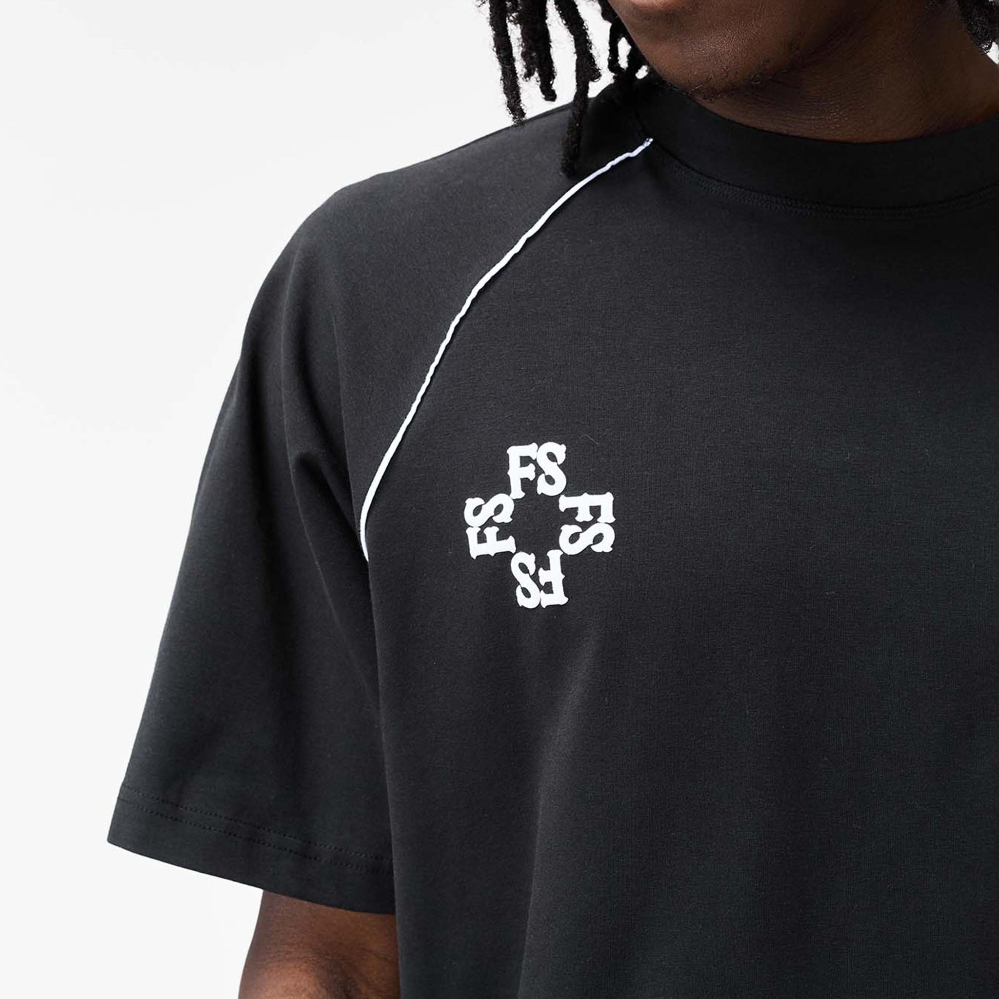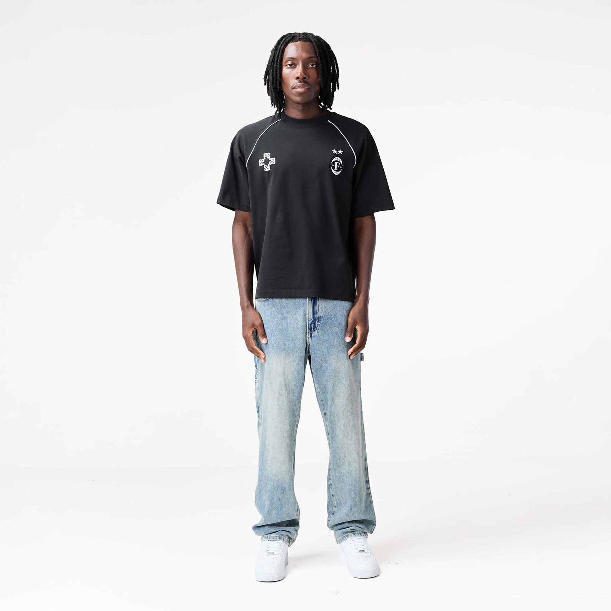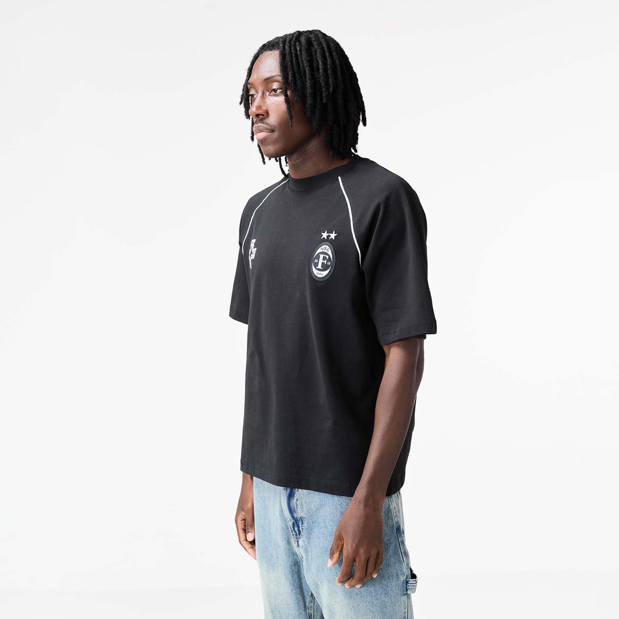 Add an understated edge to your casual style with our Men's Jersey Football Tee in a stylish washed black. This short-sleeve crew neck blends athletic inspiration with everyday comfort, featuring a comfortable neck trim and clean self-turn details on the cuffs and hem. Crafted from soft cotton with a touch of stretch, it provides a great fit. Signature branding elements include a refined chest monogram logo and a stylish chest badge logo. The versatile washed black hue makes it an ideal base for numerous casual looks, paired with jeans, shorts or tracksuits.
