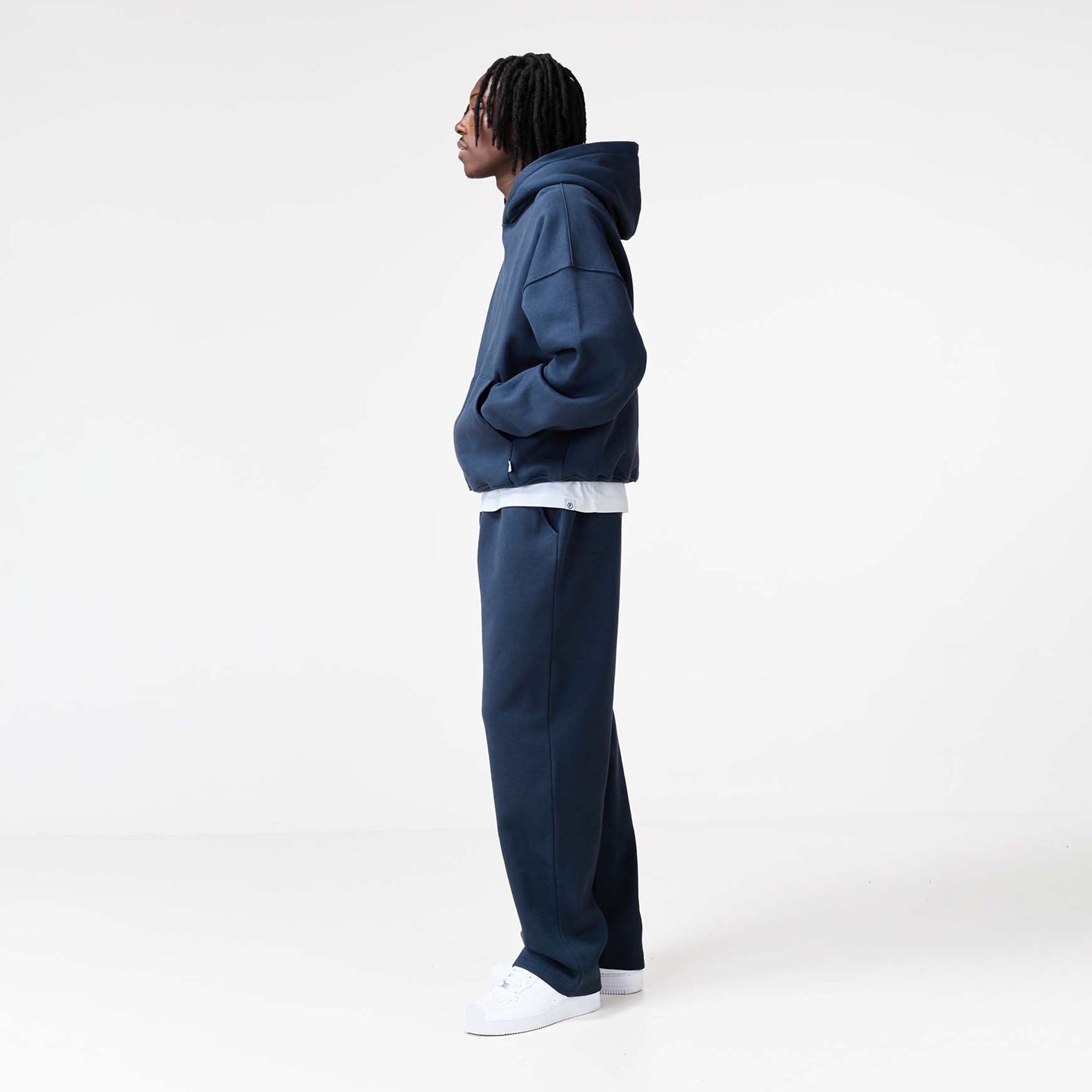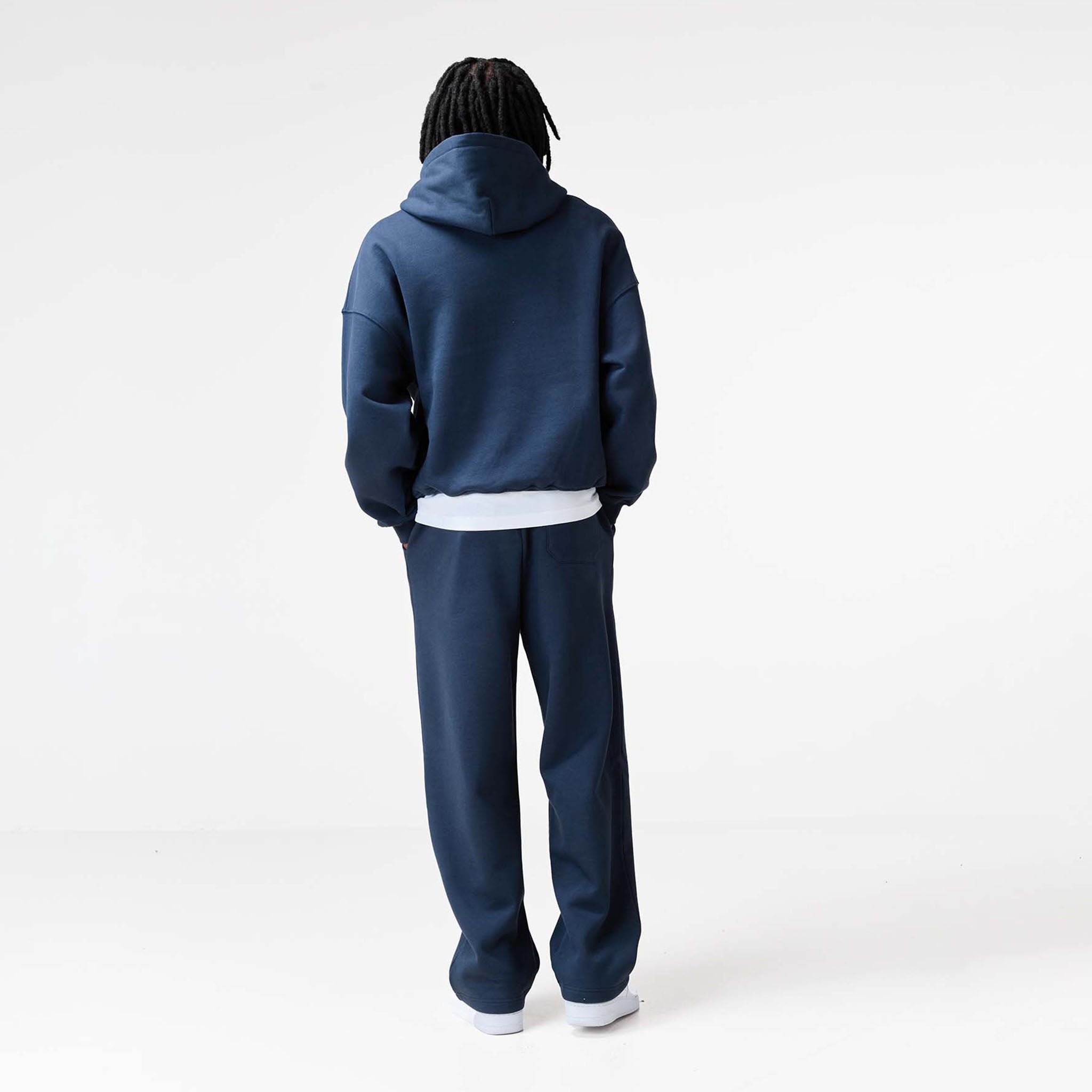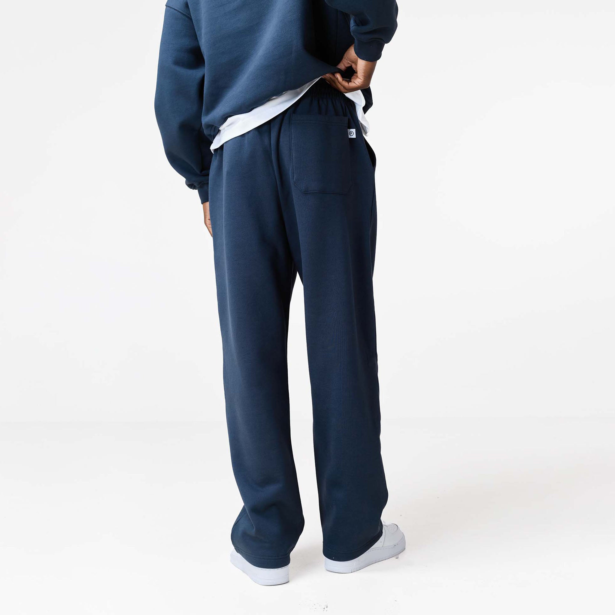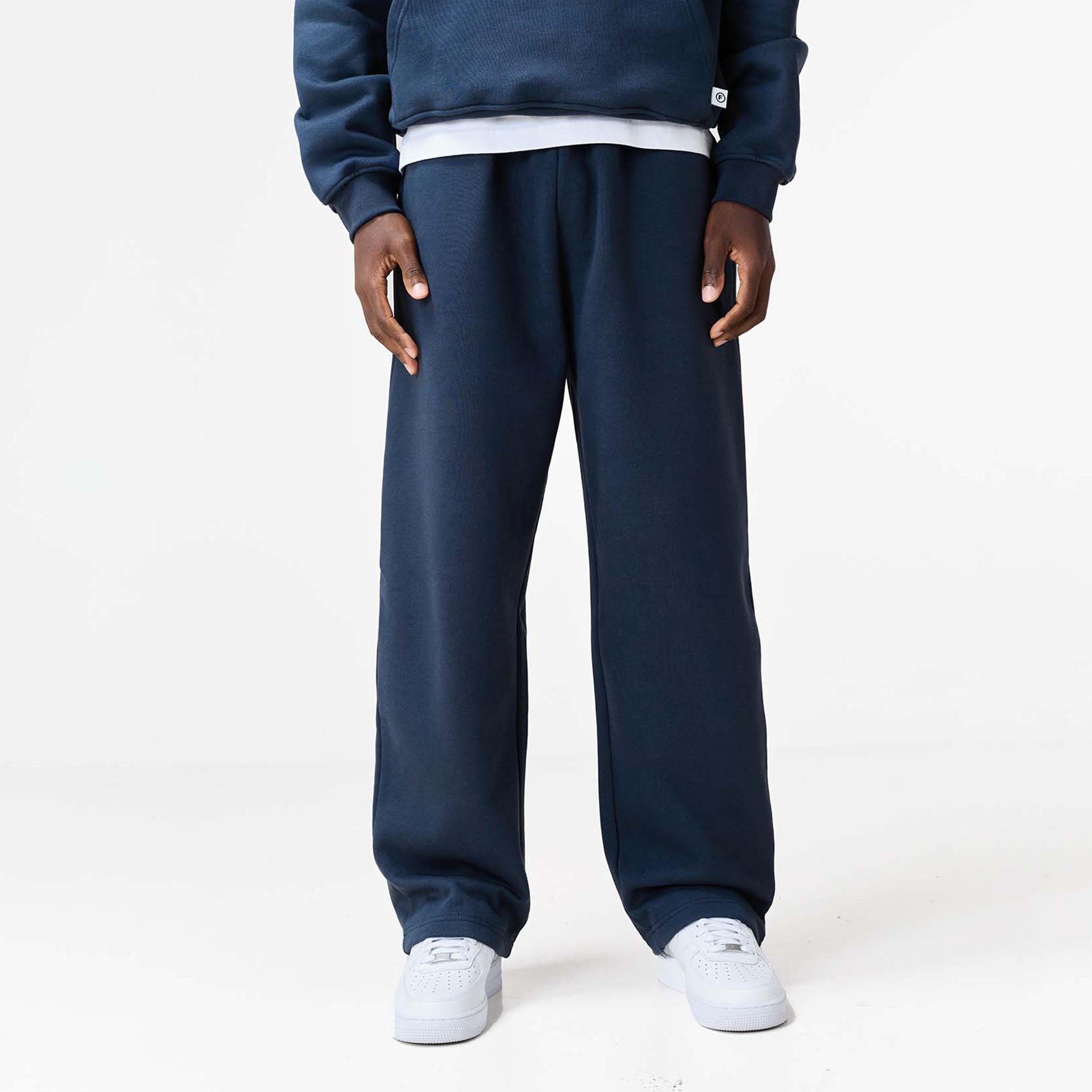 Introducing the Loose Fit Open Hem Joggers in navy, a refined casual staple that blends the comfort of fleece with a clean, structured finish. Engineered for movement and durability, these ultimate everyday bottoms are constructed from heavy-duty 422 GSM Cotton for superior substance, warmth, and a premium drape. They feature a modern, relaxed silhouette with a clean open hem for an elevated look, secured by an expertly crafted cut and sew waistband with internal poly drawcords for a personalised fit. Enhanced utility comes from sleek, curved side pockets and two rear pockets for secure storage, with the design subtly finished by the signature 'F' logo woven label placed discreetly on one rear pocket as a mark of quality and distinction. Team with a box fit t-shirt and matching cropped hoodie for the ultimate ensemble.