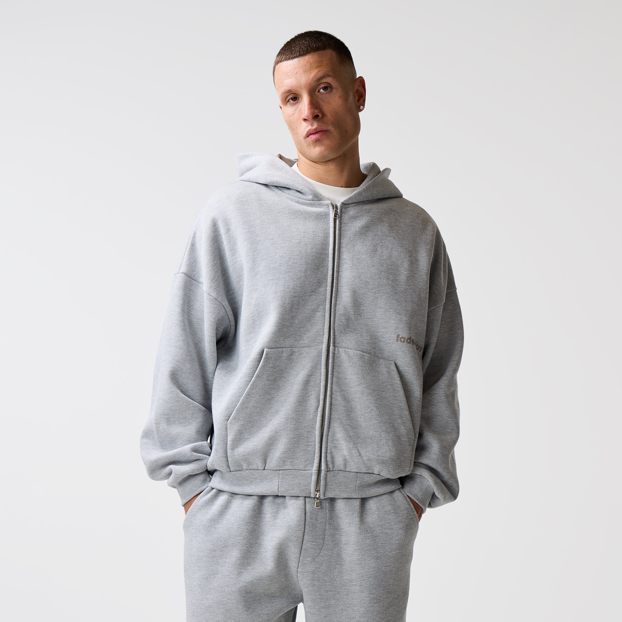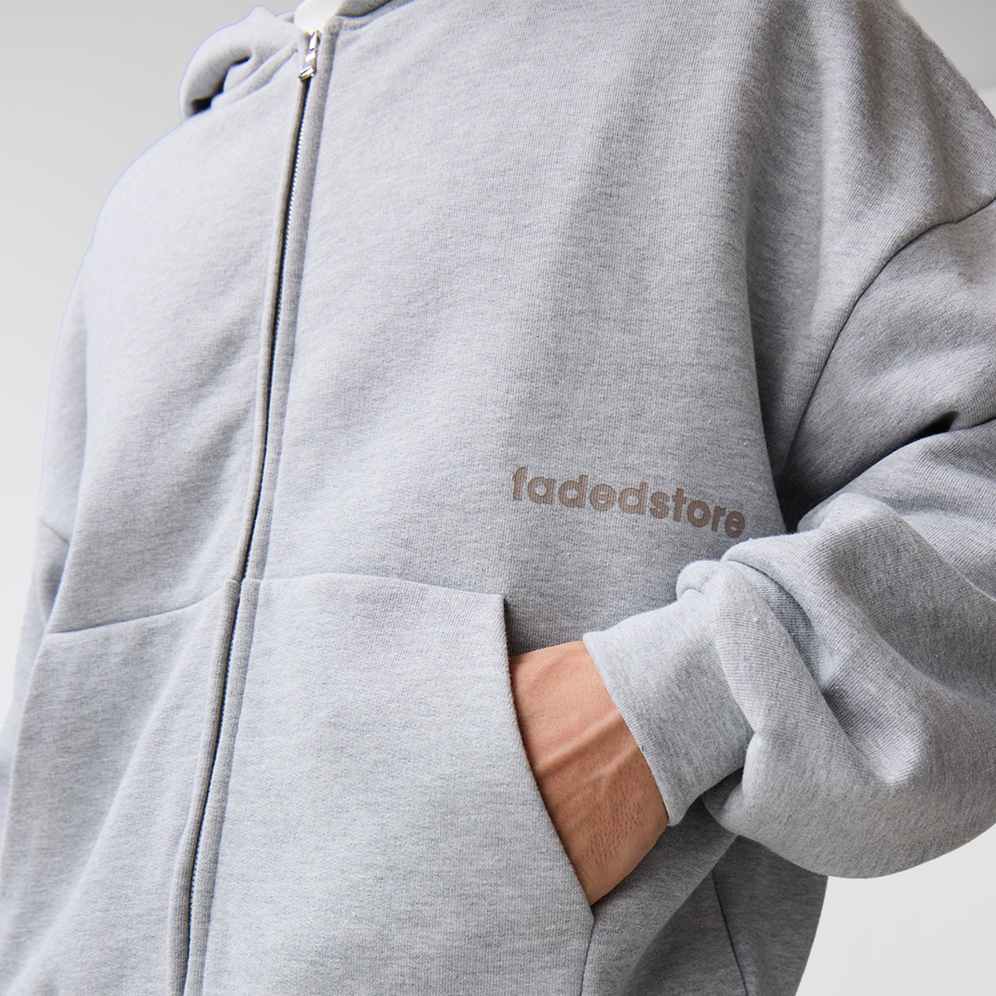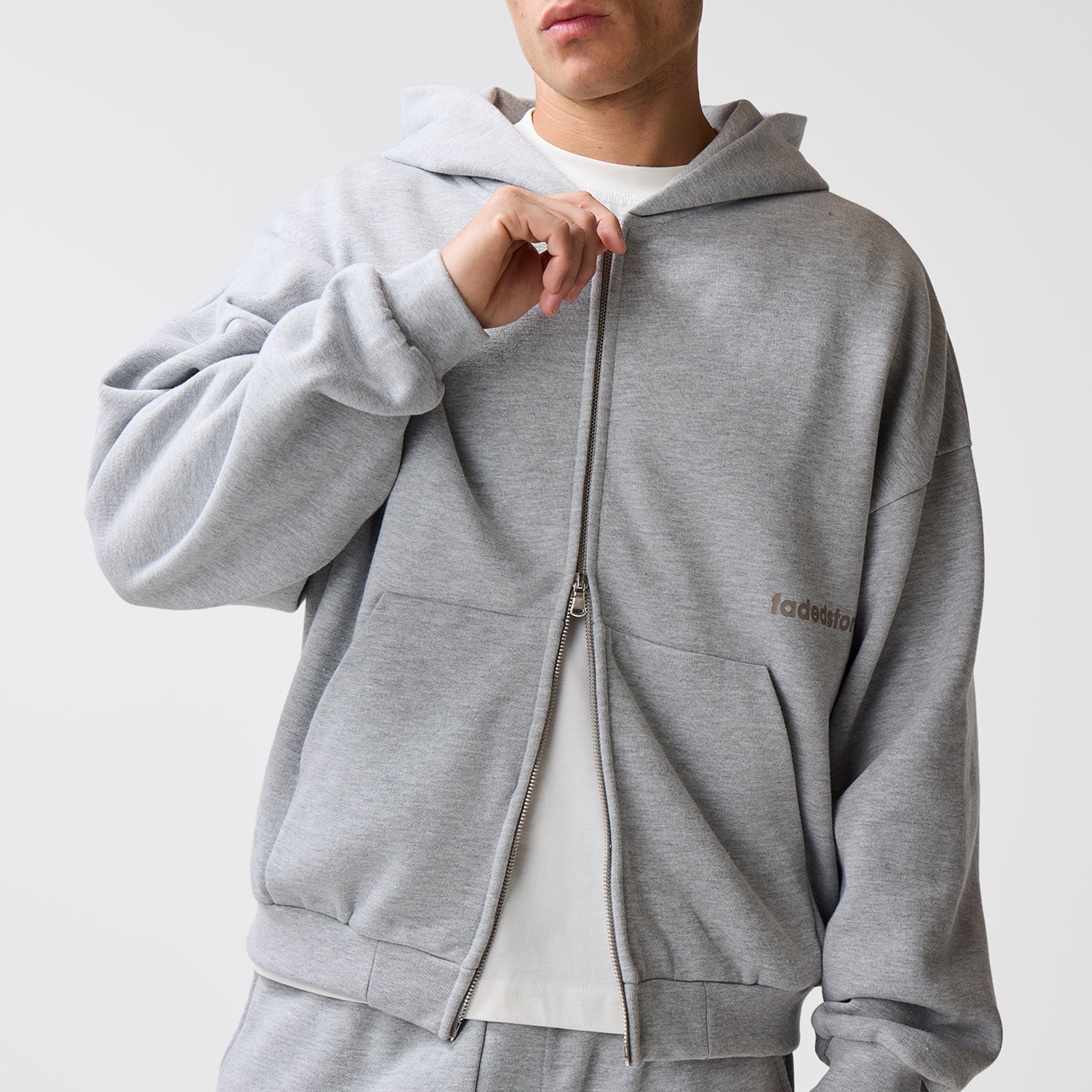 Discover the Space For Clarity Cropped Zip Hoodie in Grey Marl, a new season staple which delivers an effortlessly sharp aesthetic. Crafted an ultra-heavyweight cotton for a substantial, structured drape, this hoodie redefines streetwear essentials through expert construction. The silhouette is anchored by a double-headed silver centre front zip for versatile styling, complemented by set-in sleeves and heavy-duty ribbing at the cuffs and waistband to maintain a sharp, consistent fit. Every detail is considered, from the ergonomic dart at the centre back of the hood and the clean finish of the bound back neck tape to the self-fabric hood lining. Subtle branding via the FadedStore logo sits above a blind-stitched kangaroo pocket, while the rear features a high-impact logo and graphic that commands attention. This is a piece built to centre your look around, balancing high-end internal finishes with a streetwear aesthetic.