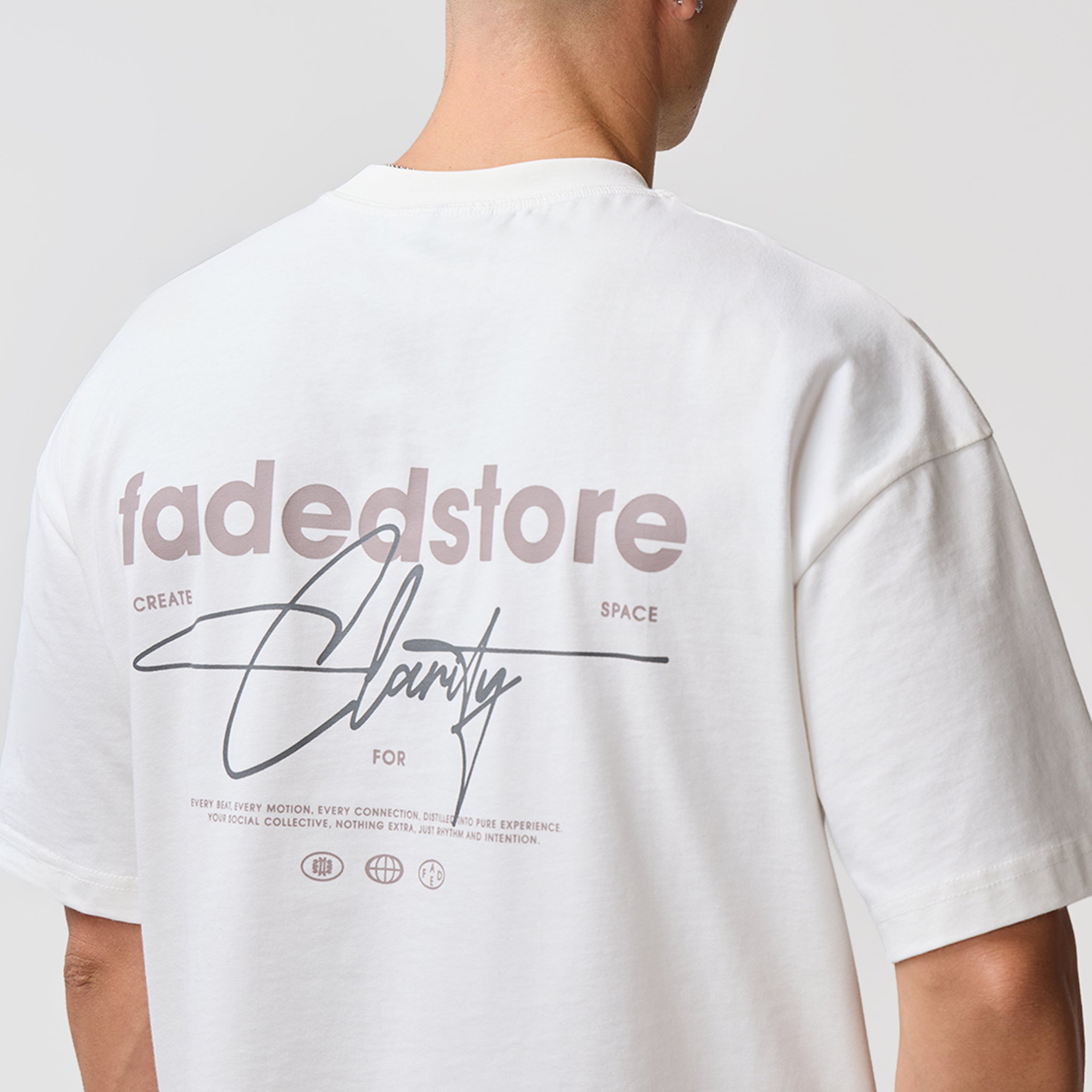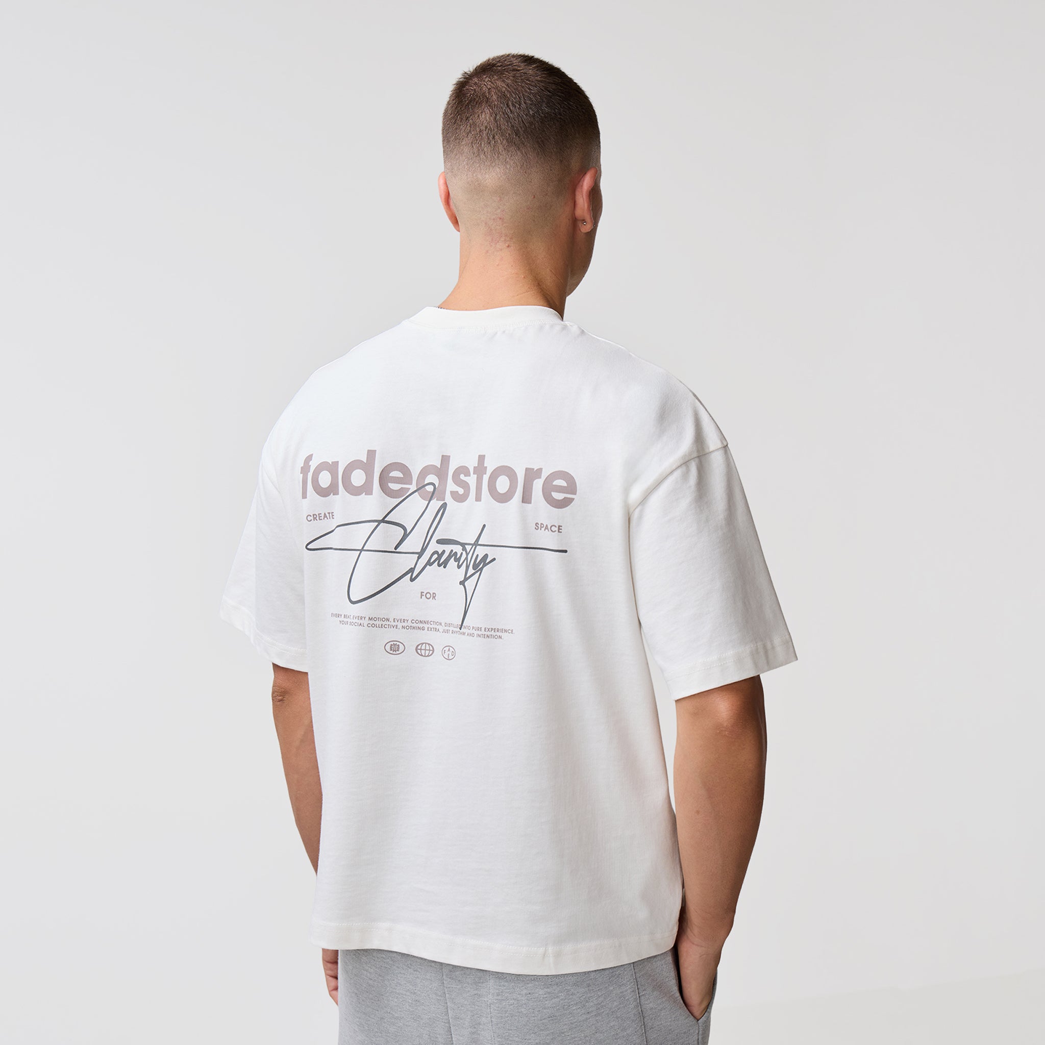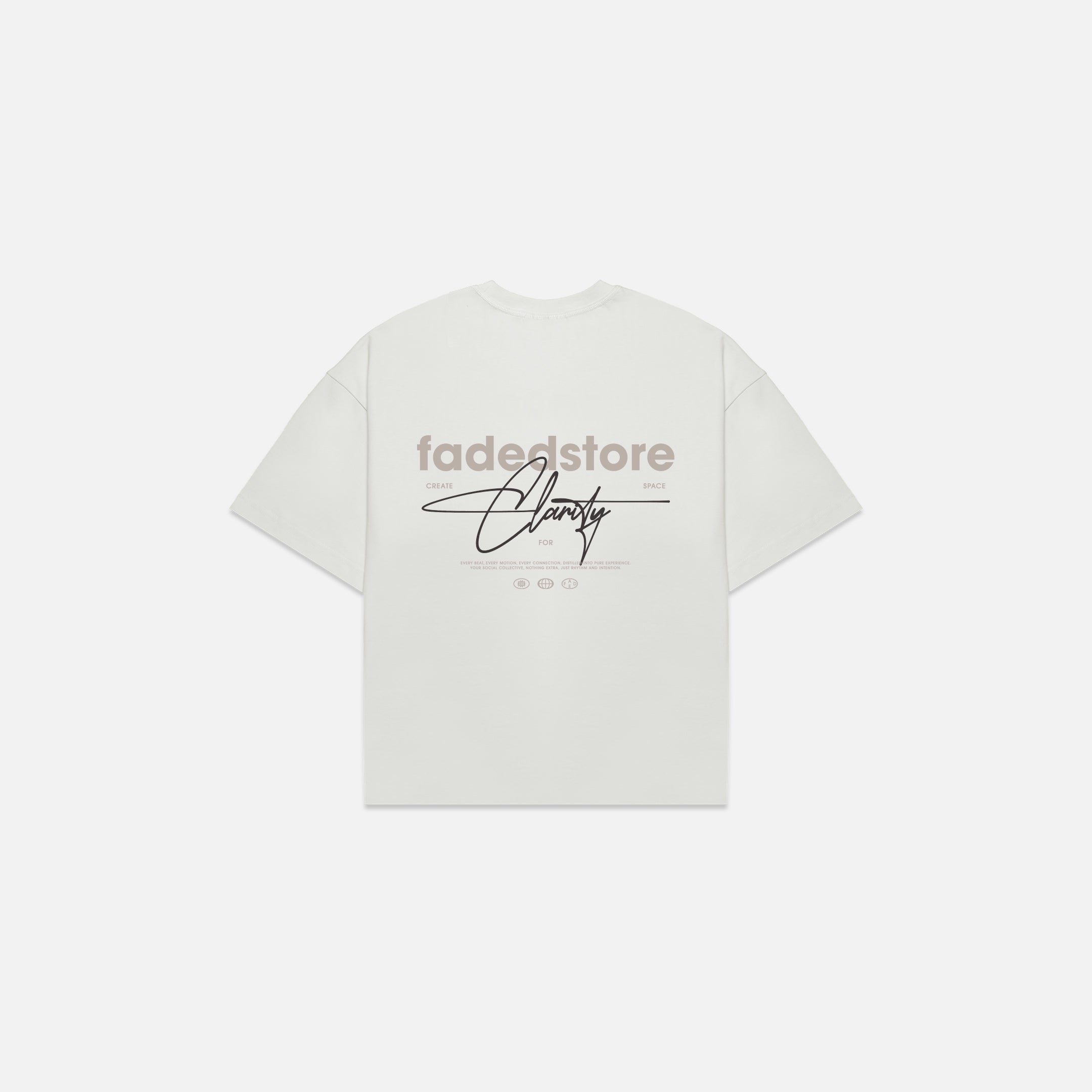 Redefine your core wardrobe with the Space For Clarity Graphic Tee in Chalk, a crisp and versatile staple with an understated streetwear aesthetic. This piece is defined by its intentional cropped boxy silhouette, engineered to provide a structural drape that deviates from the standard fit. Constructed for longevity, the tee features a heavy-duty ribbed crew neck and flatlock stitching, ensuring a clean, reinforced finish. Minimalist branding is achieved through a discreet logo on the lower chest, contrasted by the bold, high-impact "Fadedstore Clarity" graphic on the reverse. For a cohesive statement, pair this Chalk edition with the coordinating Space For Clarity hoodie and joggers, or style it alongside our signature denim shorts for a polished, off-duty look.