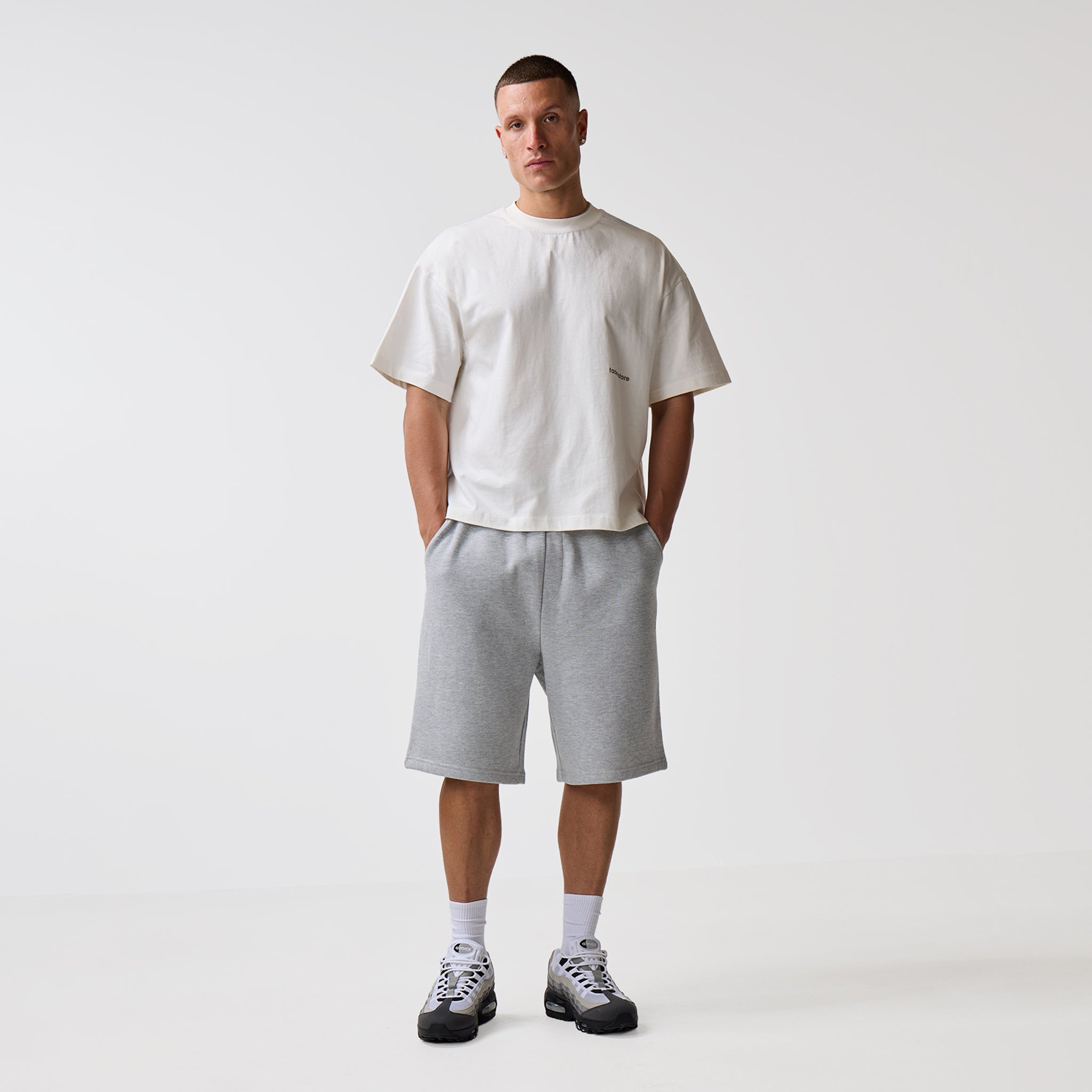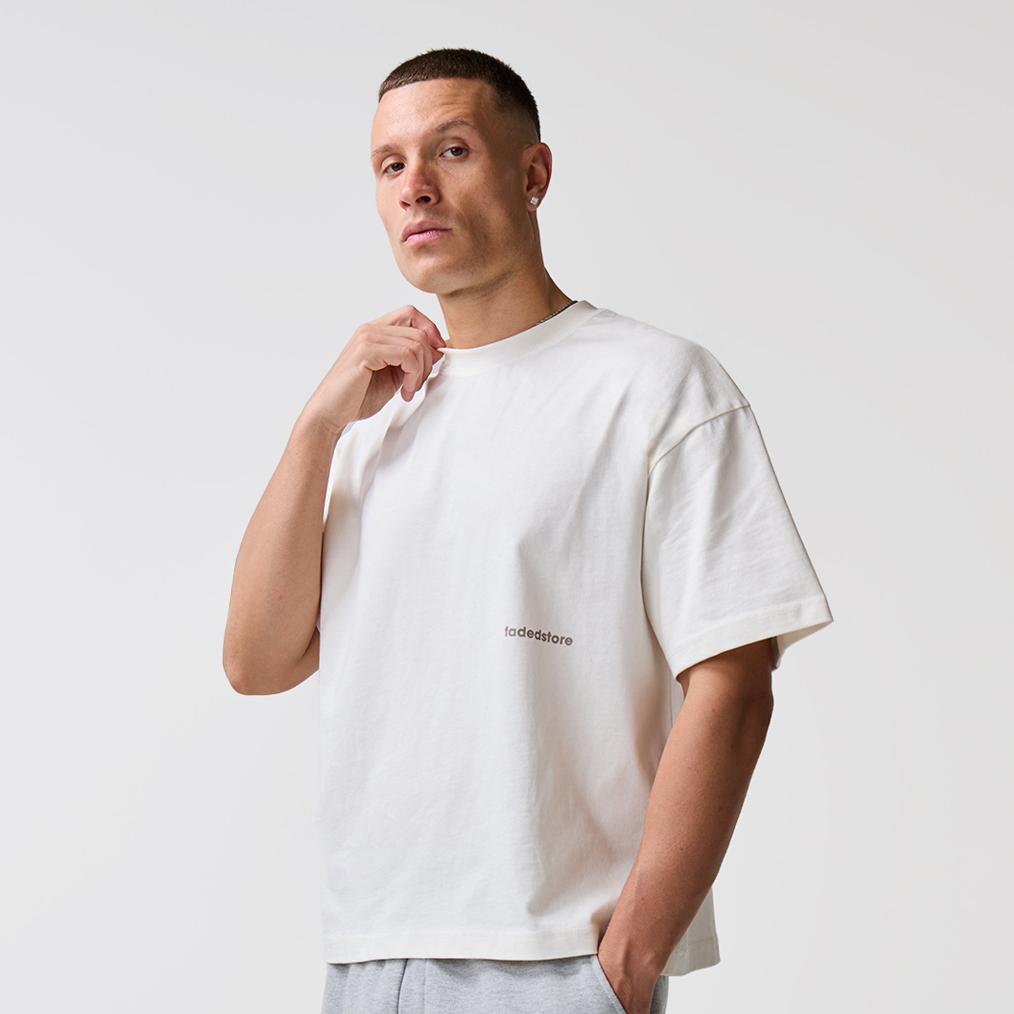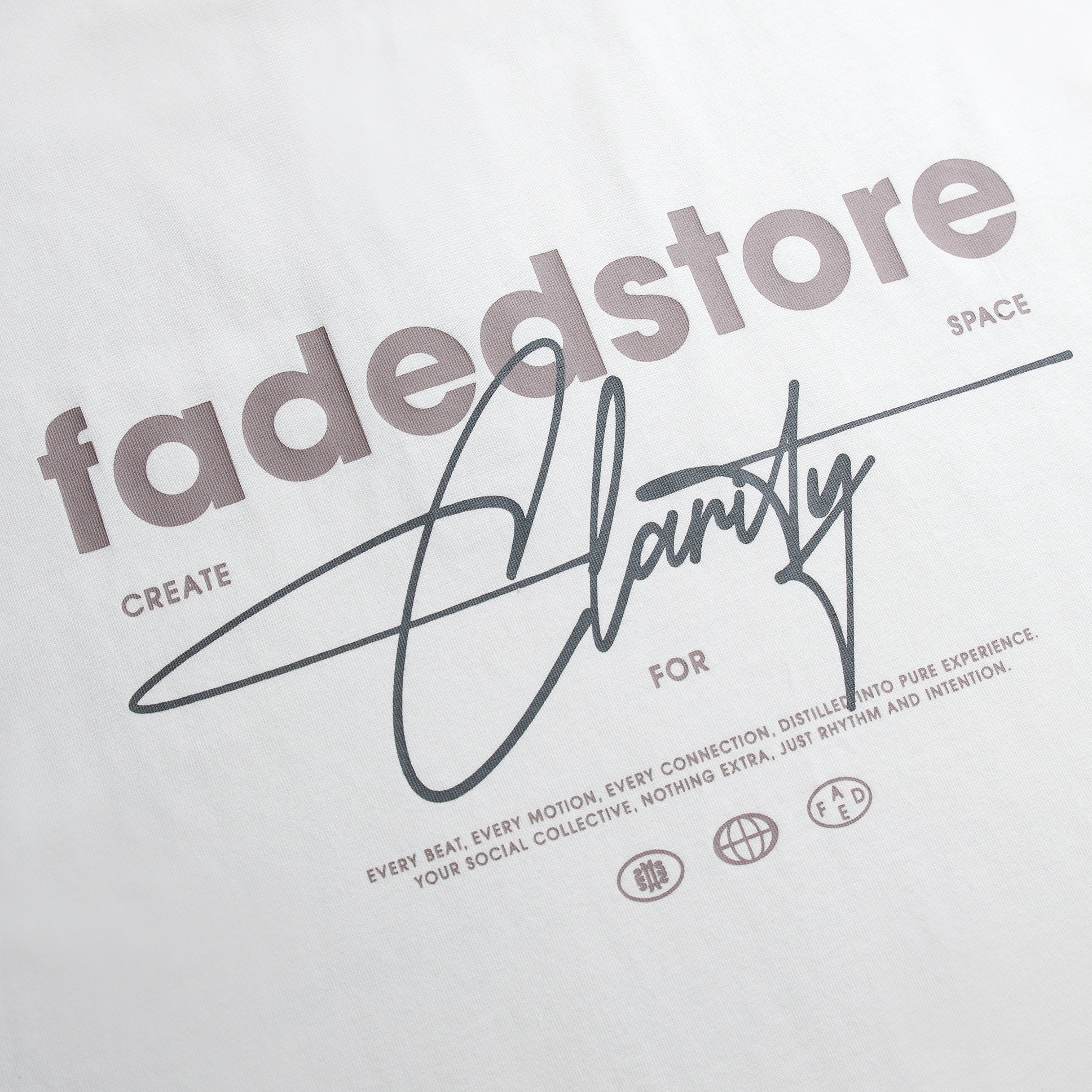Redefine your core wardrobe with the Space For Clarity Graphic Tee in Chalk, a crisp and versatile staple with an understated streetwear aesthetic. This piece is defined by its intentional cropped boxy silhouette, engineered to provide a structural drape that deviates from the standard fit. Constructed for longevity, the tee features a heavy-duty ribbed crew neck and flatlock stitching, ensuring a clean, reinforced finish. Minimalist branding is achieved through a discreet logo on the lower chest, contrasted by the bold, high-impact "Fadedstore Clarity" graphic on the reverse. For a cohesive statement, pair this Chalk edition with the coordinating Space For Clarity hoodie and joggers, or style it alongside our signature denim shorts for a polished, off-duty look.