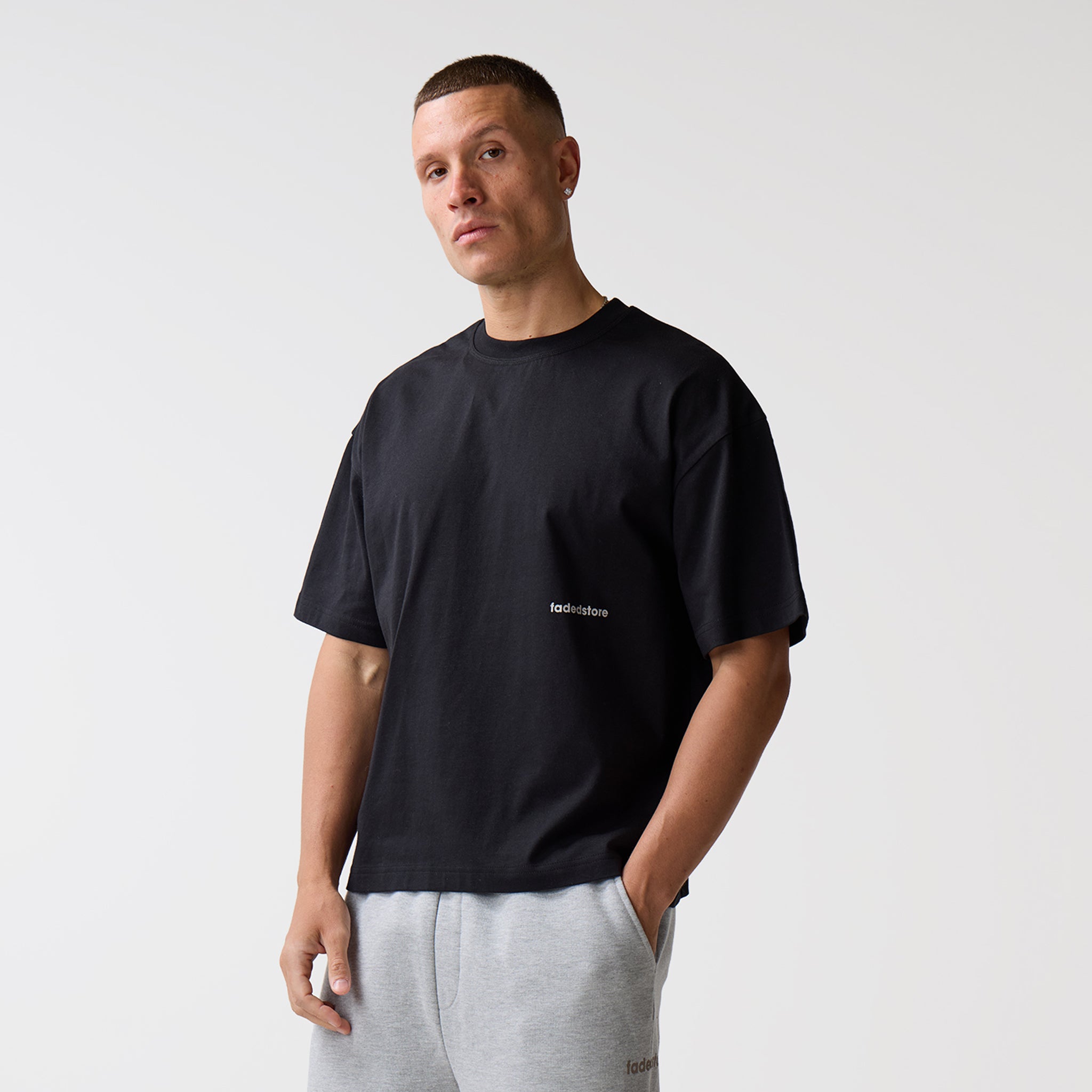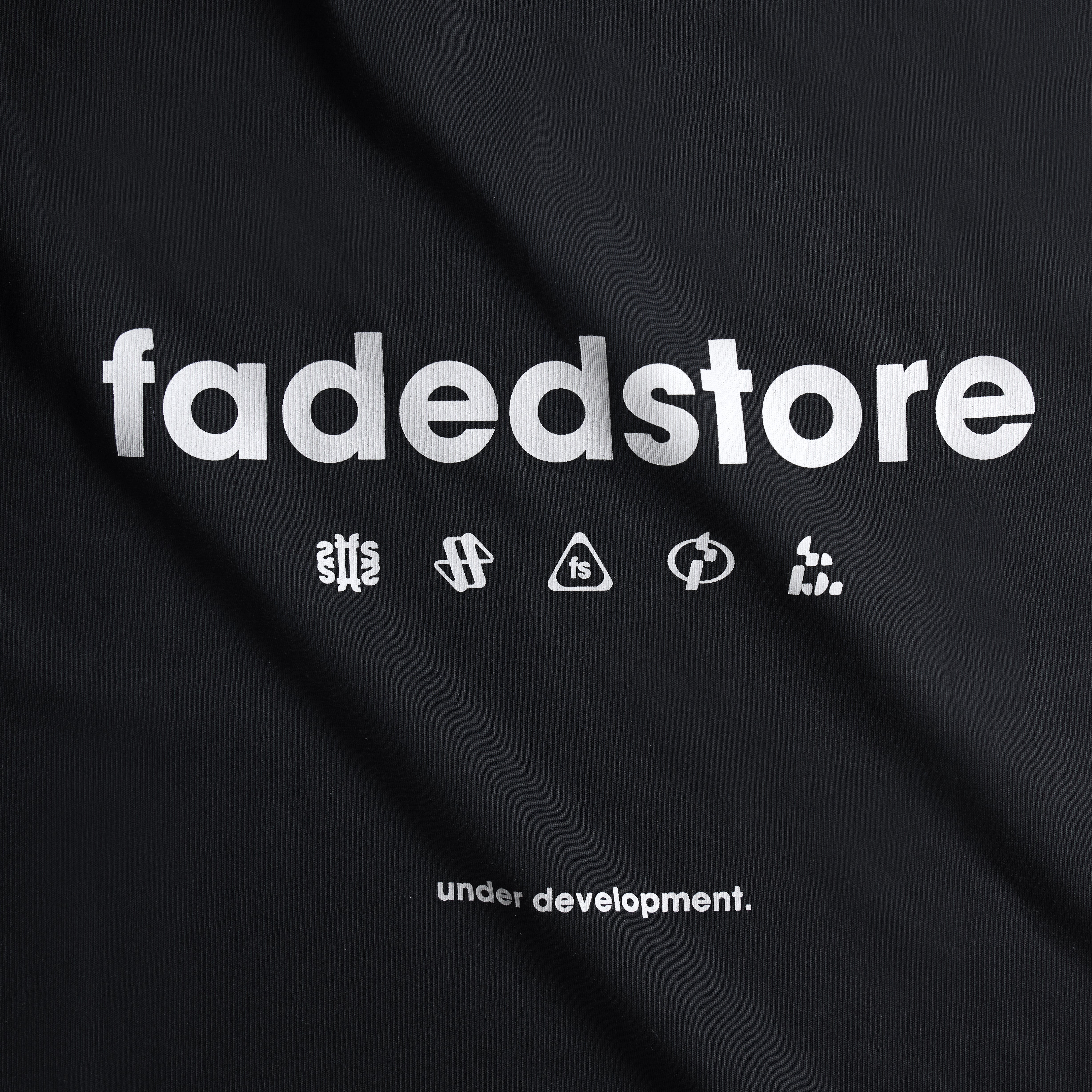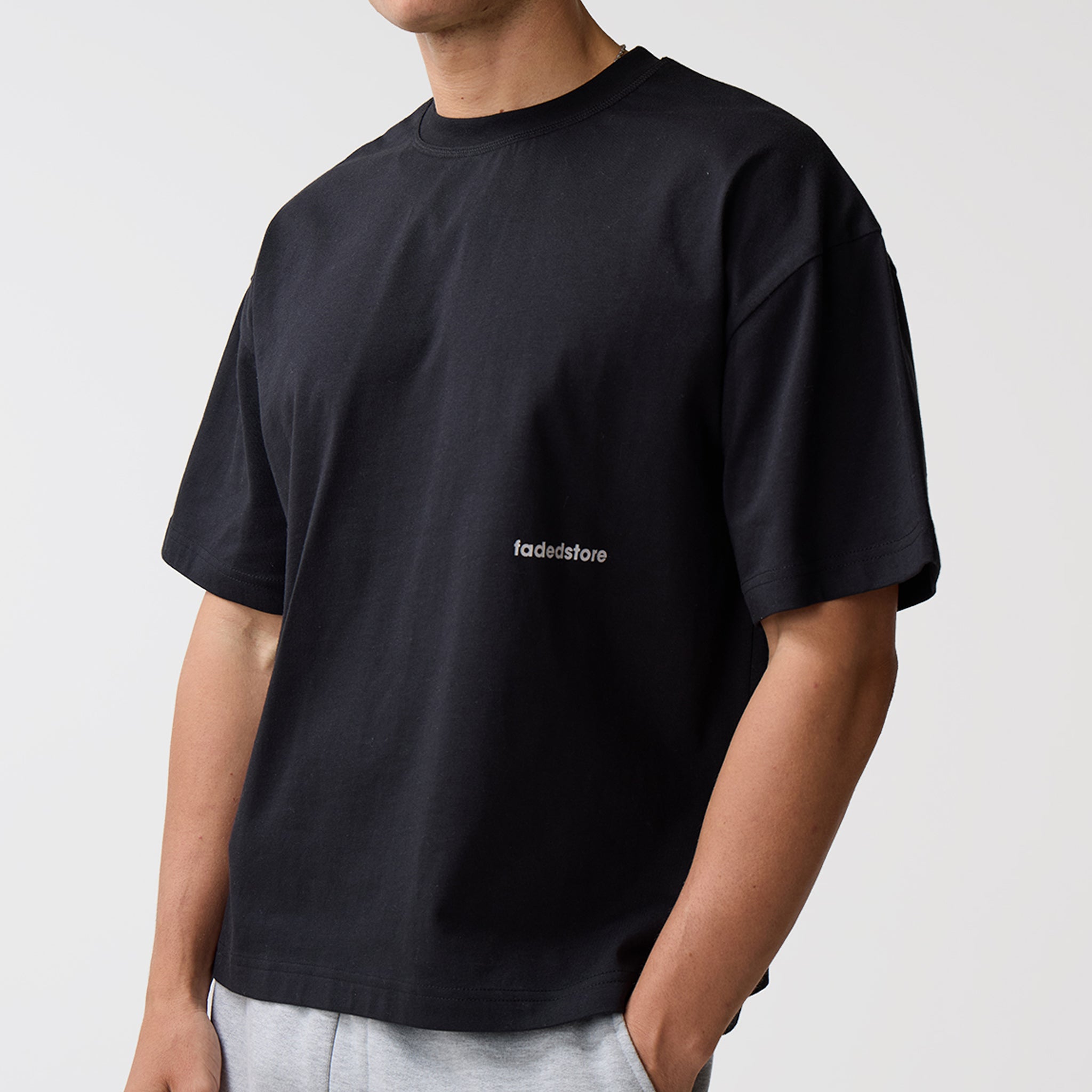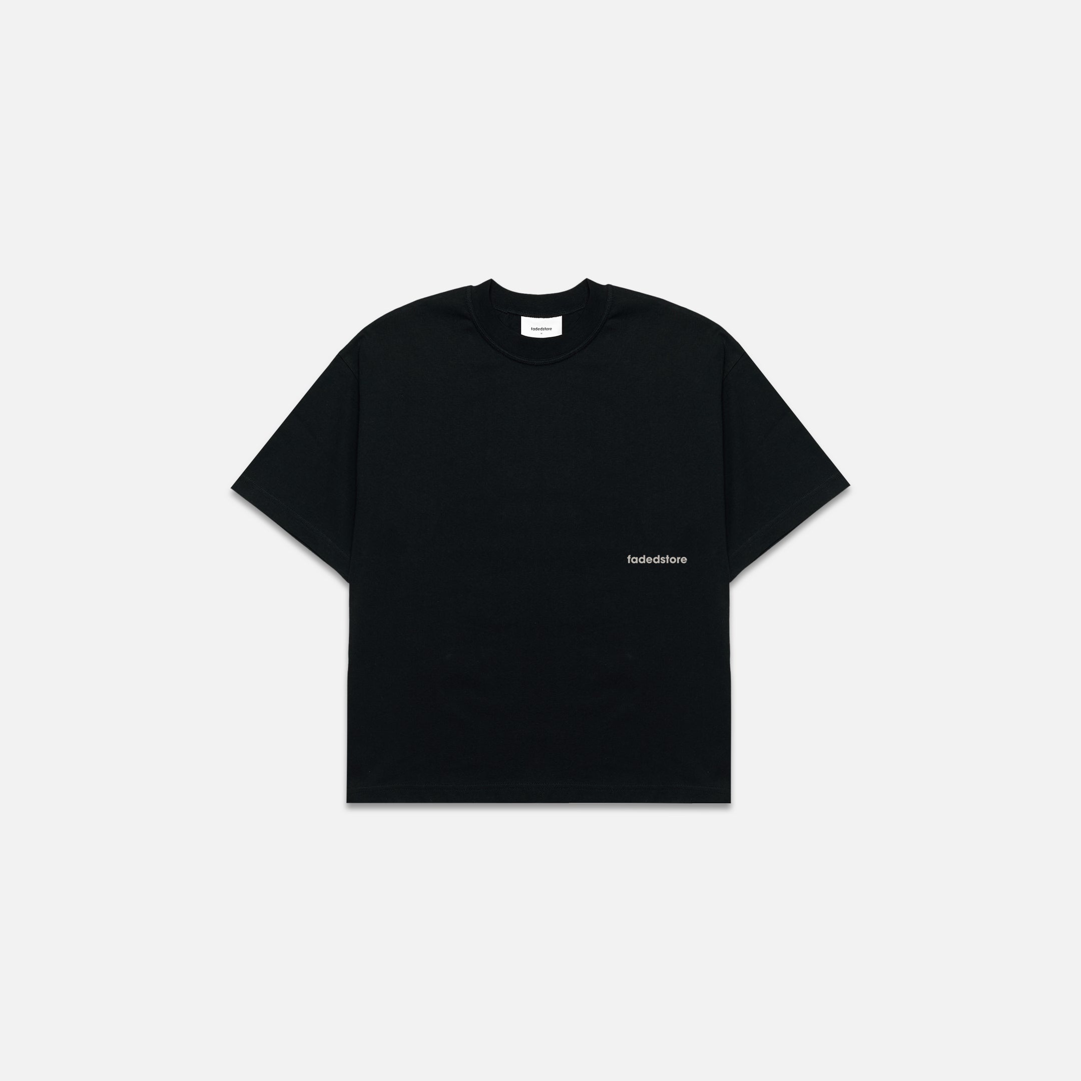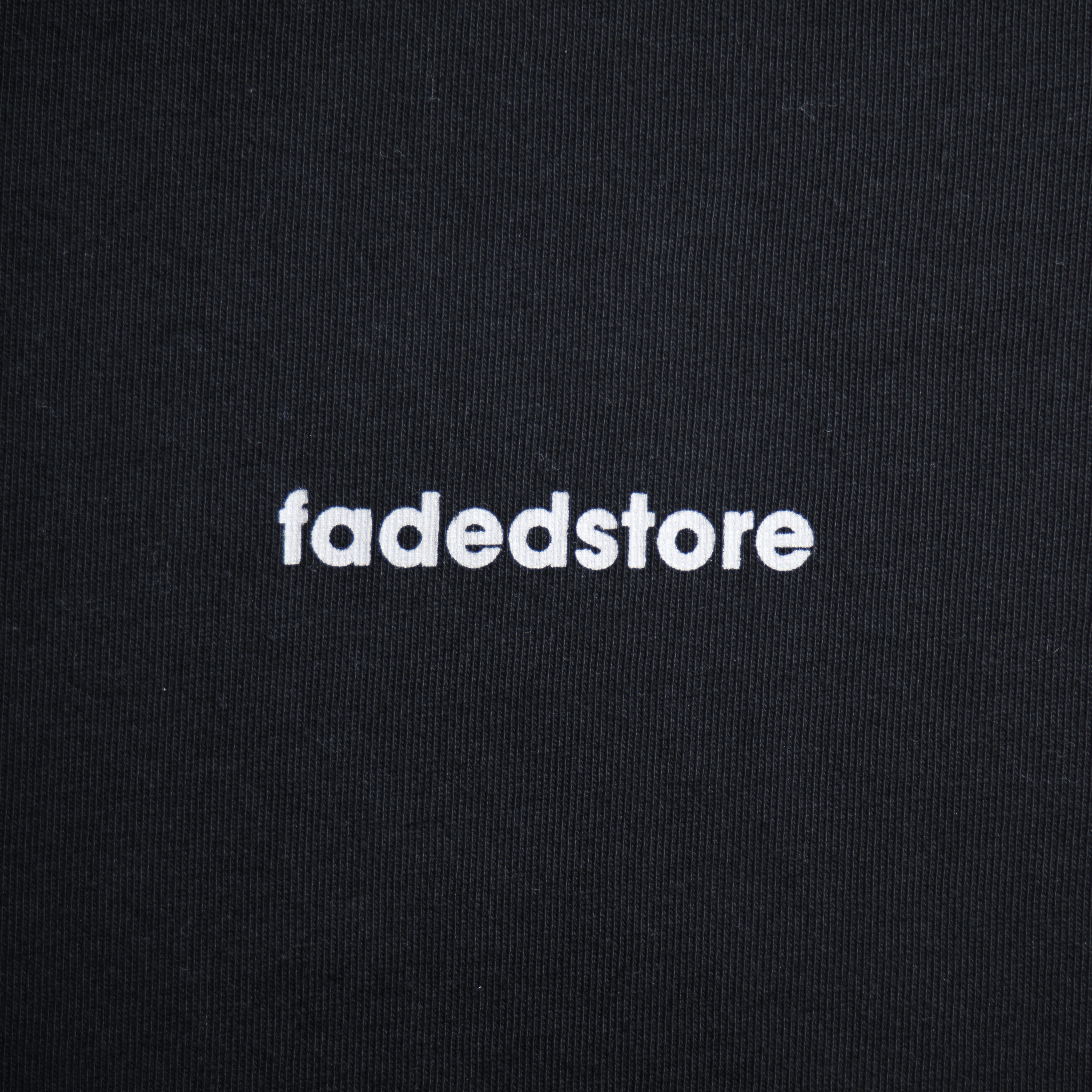 - fadedstore branding to lower chest
