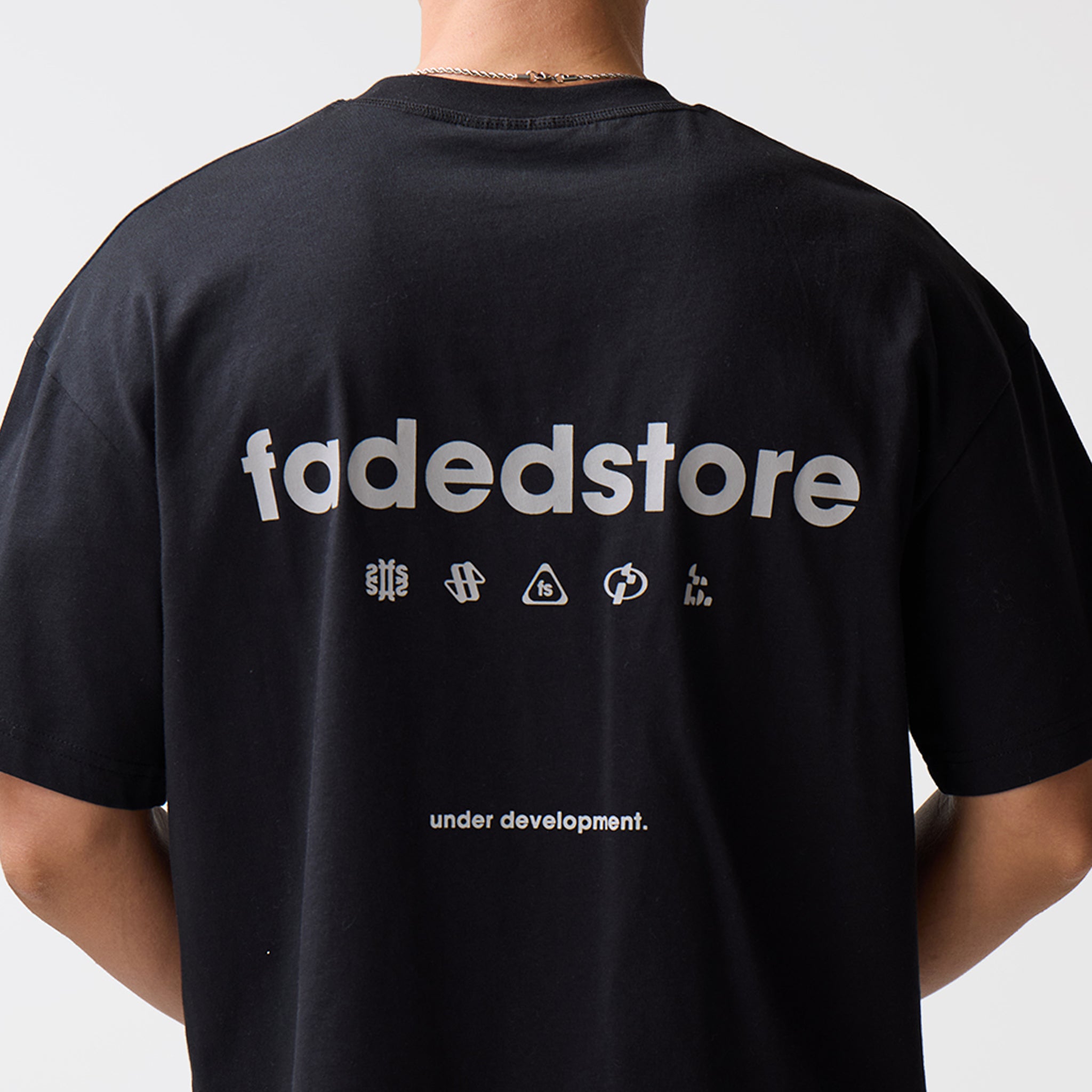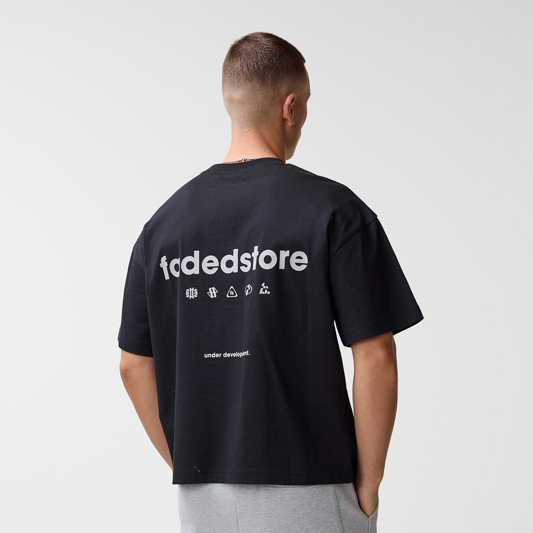 Discover the Under Development T-Shirt in Black is a foundational piece that merges versatile monochromatic tones with a sharp, industrial aesthetic. Defined by the Screenprint Fadedstore Logo centered on the chest and a bold, oversized version anchored across the back, this piece is cut in our signature cropped and boxy silhouette for a structured, architectural drape. Crafted from heavy-weight fabric and built to endure, it features a reinforced heavy-duty ribbed collar and premium flatlock stitching, making it a versatile staple that pairs effortlessly with our signature carpenter shorts or best-selling wide leg joggers.