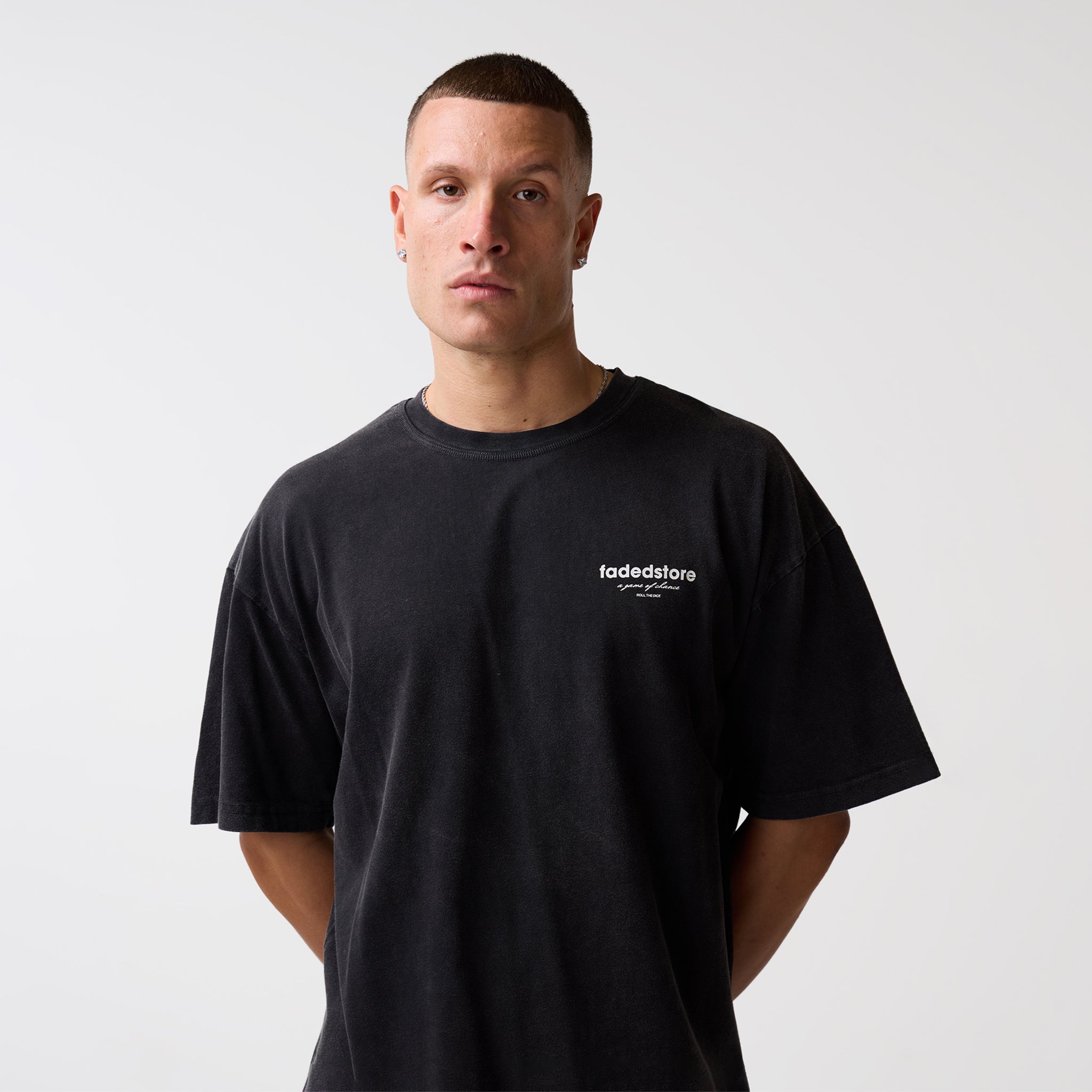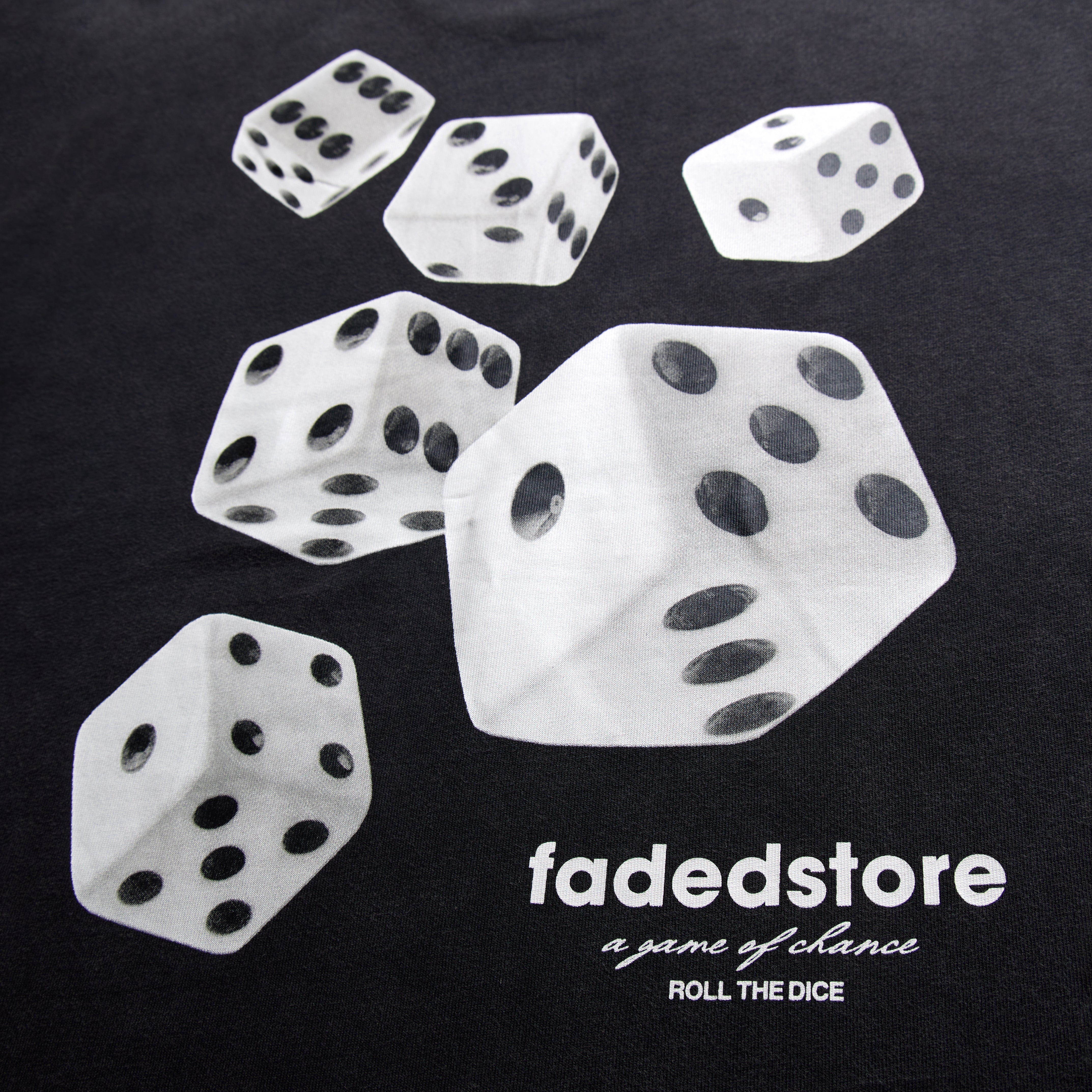 Elevate your essential t-shirt collection with the Rolling Dice T-Shirt in washed black, designed to deliver a statement silhouette with a relaxed, dropped-shoulder aesthetic. The construction features a premium flatlock stitched neckline complemented by twin-needle stitching at the cuffs and hem for maximum durability. While the front remains clean with a subtle FadedStore screen-printed logo on the lower chest, the back makes a high-stakes statement with a bold digital print of rolling dice. It’s a seamless blend of technical craftsmanship and bold graphic energy, finished with a classic crewneck that anchors the modern fit.