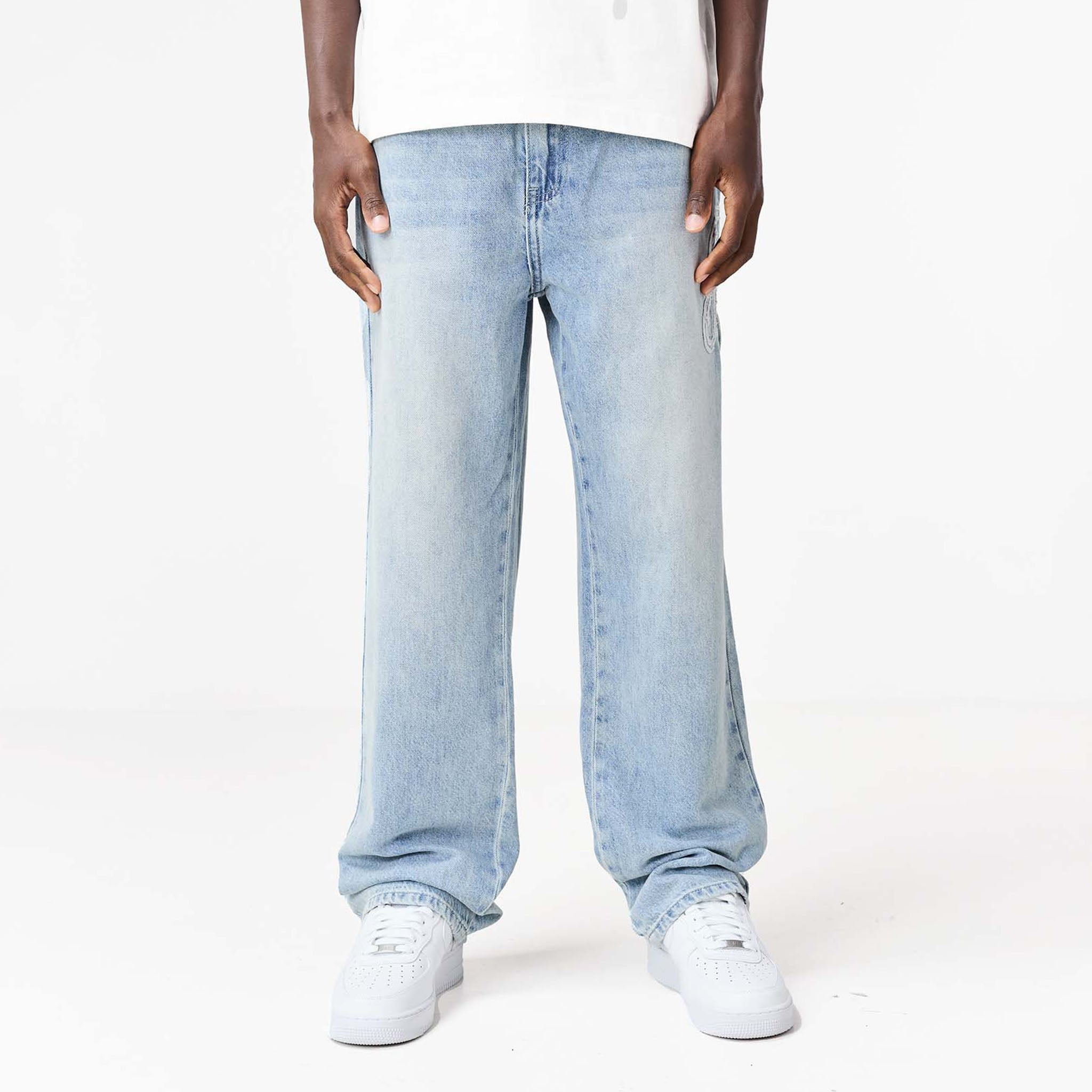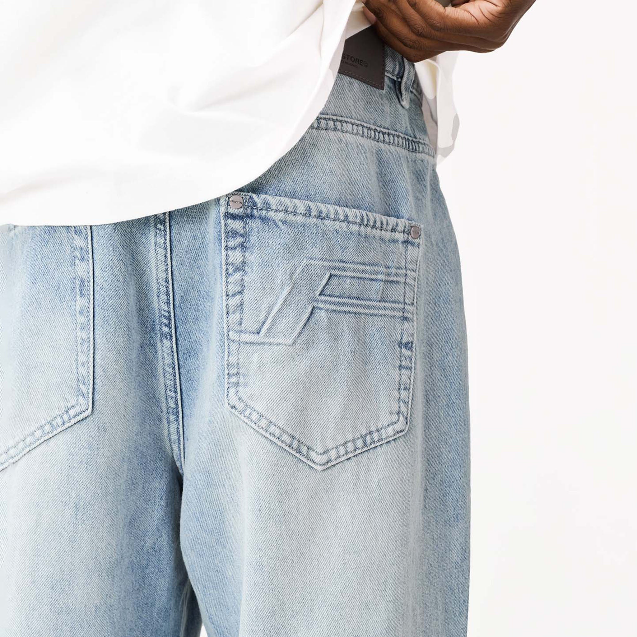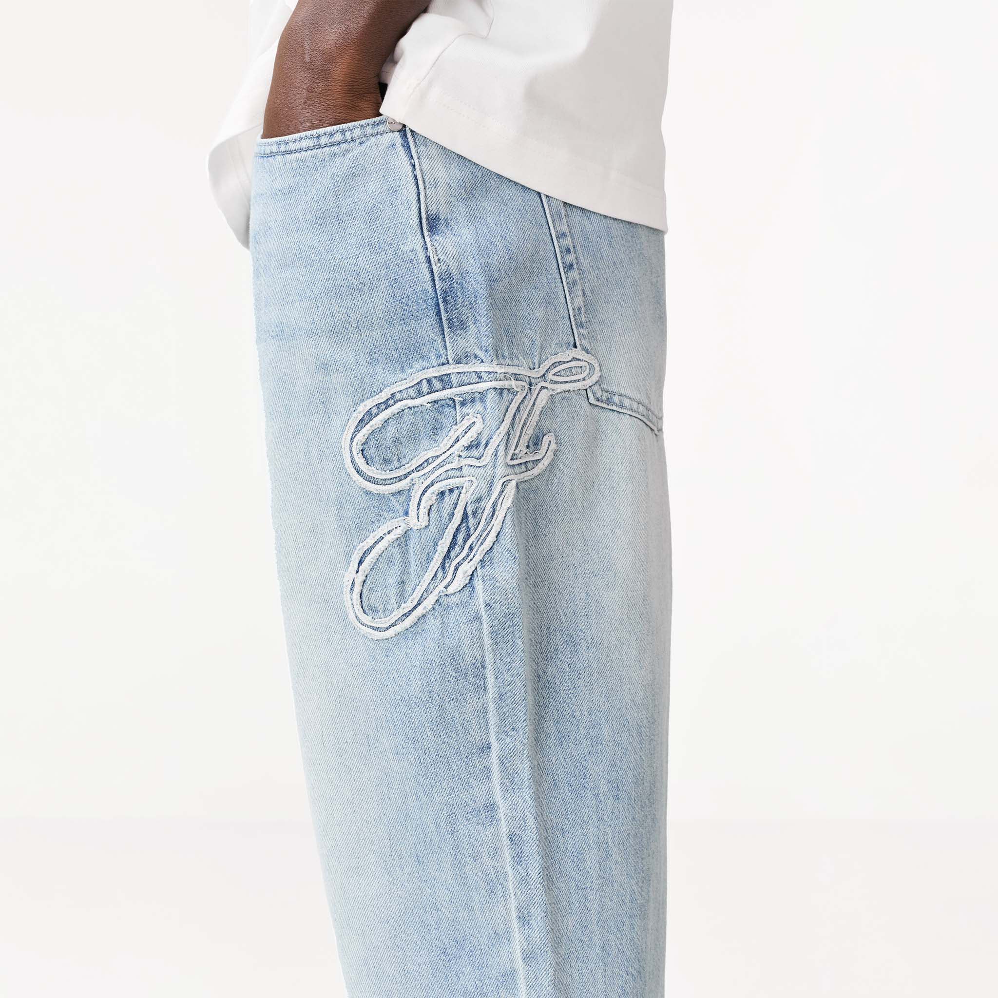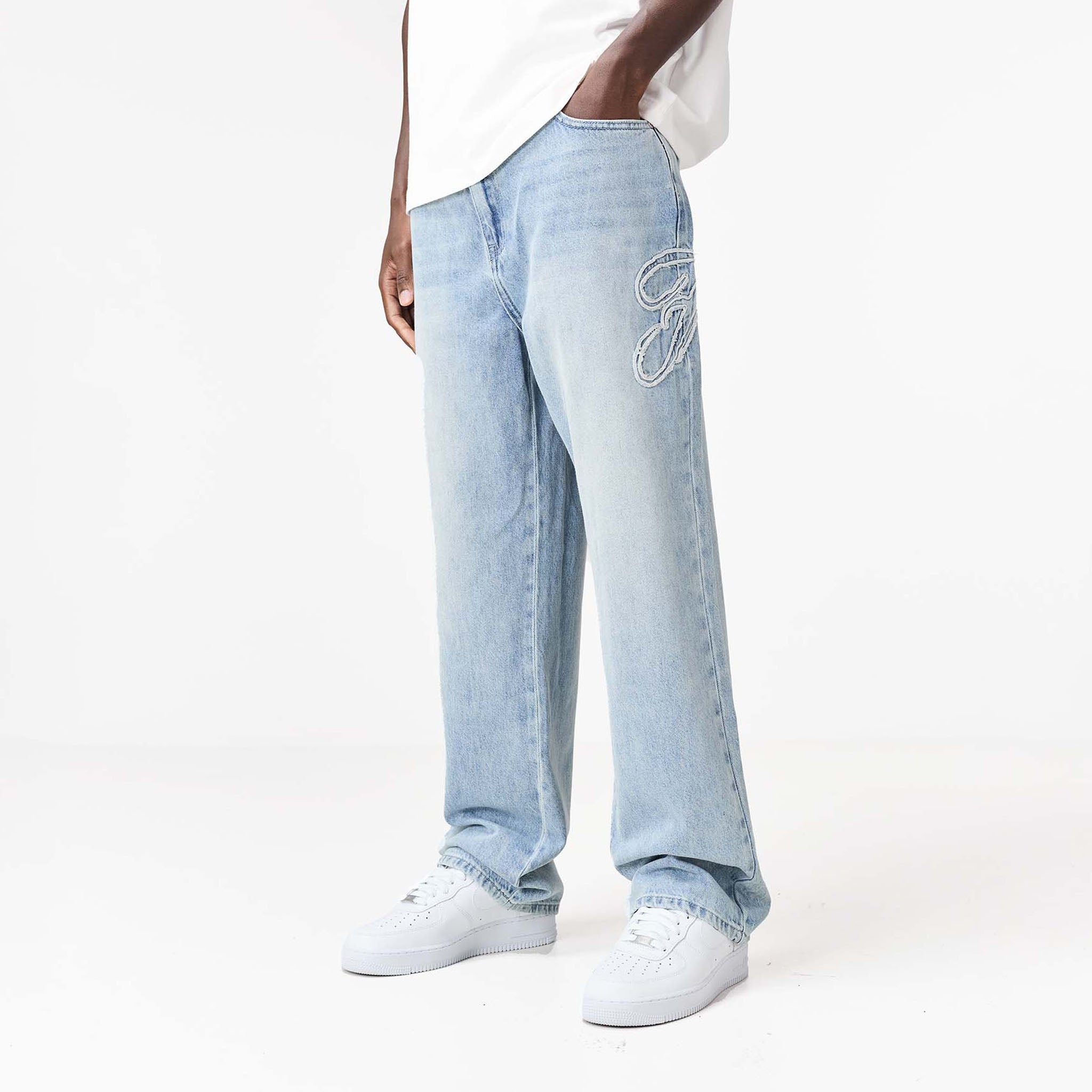 Redefine your everyday look with the latest signature style, the Faded Applique Jeans in blue wash. Designed to seamlessly blend practicality with contemporary details. They feature a secure zipper fly with twin needle stitch and a branded button closure, complemented by practical belt loops. Featuring functional front pockets with branded rivets and a unique wide coin pocket showcasing an embossed logo. A striking 'F' branding logo across the seam ensures these jeans have a streetwear edge. The self-turn hem provides a clean finish, while the cut and sew waistband and rear pockets with embossed 'F' branding complete their iconic appeal.