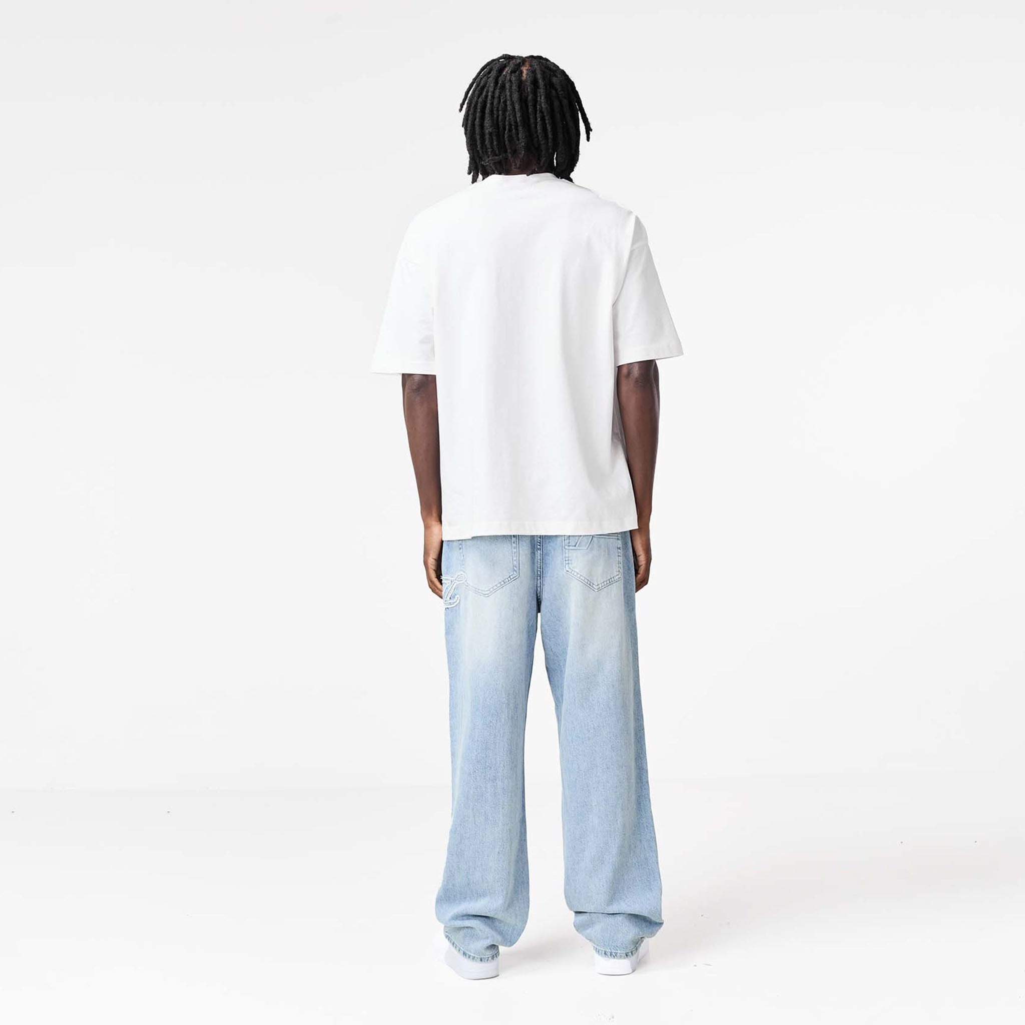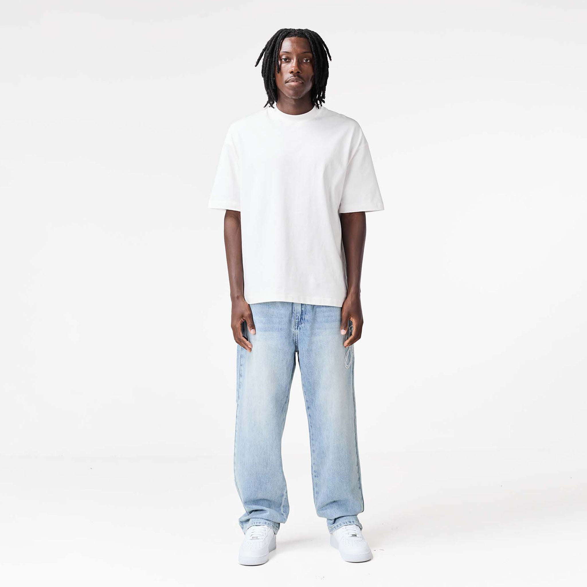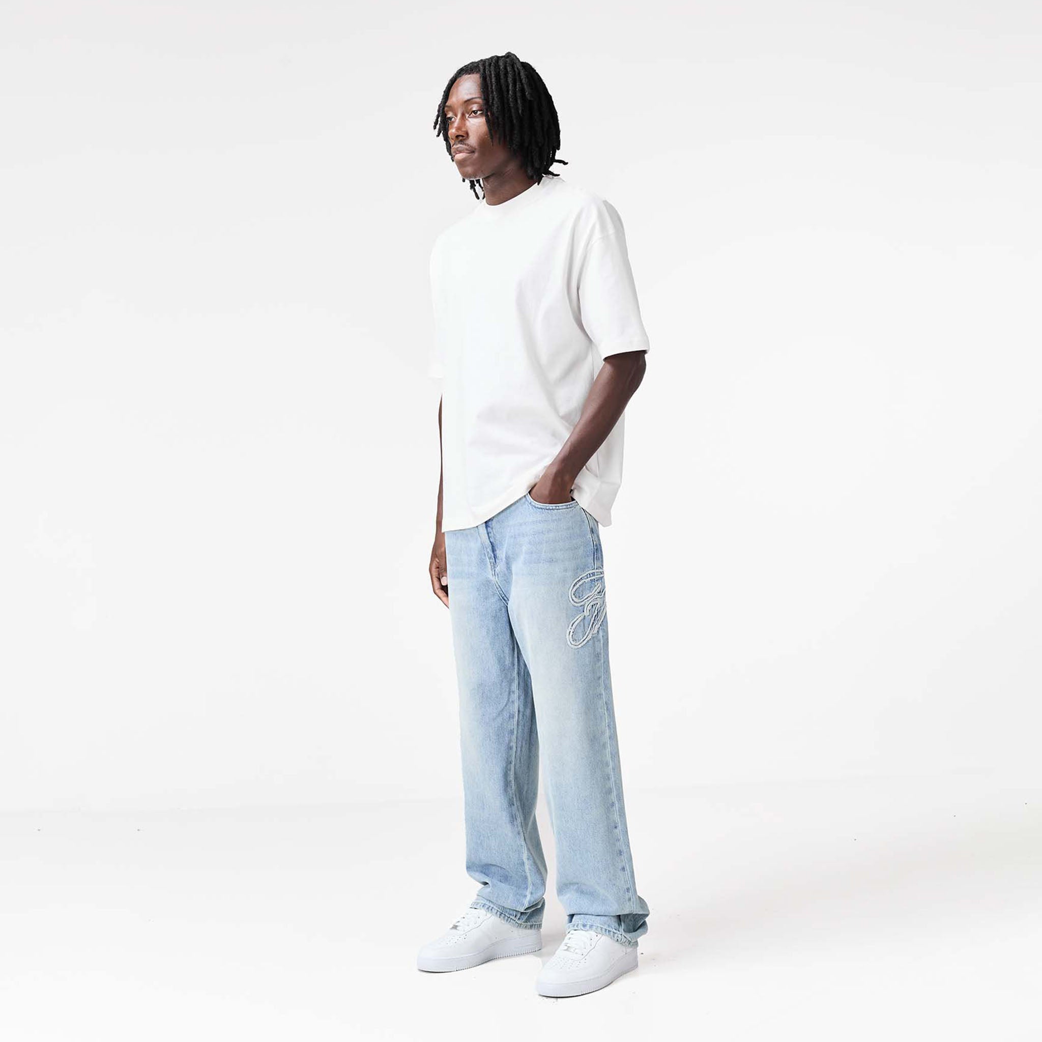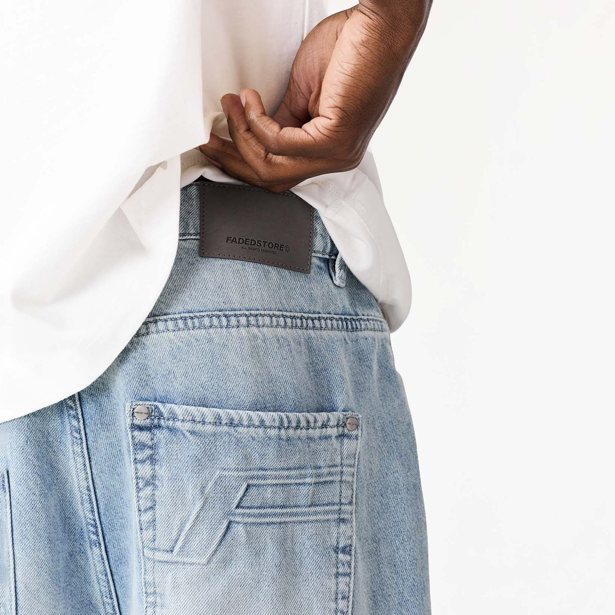 Redefine your everyday look with the latest signature style, the Faded Applique Jeans in blue wash. Designed to seamlessly blend practicality with contemporary details. They feature a secure zipper fly with twin needle stitch and a branded button closure, complemented by practical belt loops. Featuring functional front pockets with branded rivets and a unique wide coin pocket showcasing an embossed logo. A striking 'F' branding logo across the seam ensures these jeans have a streetwear edge. The self-turn hem provides a clean finish, while the cut and sew waistband and rear pockets with embossed 'F' branding complete their iconic appeal.