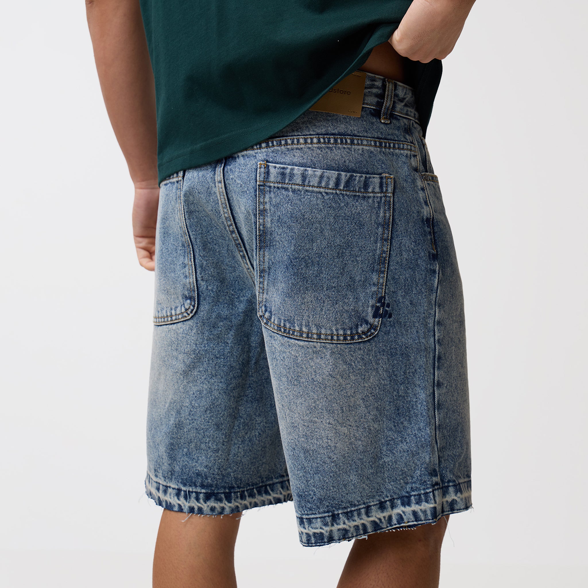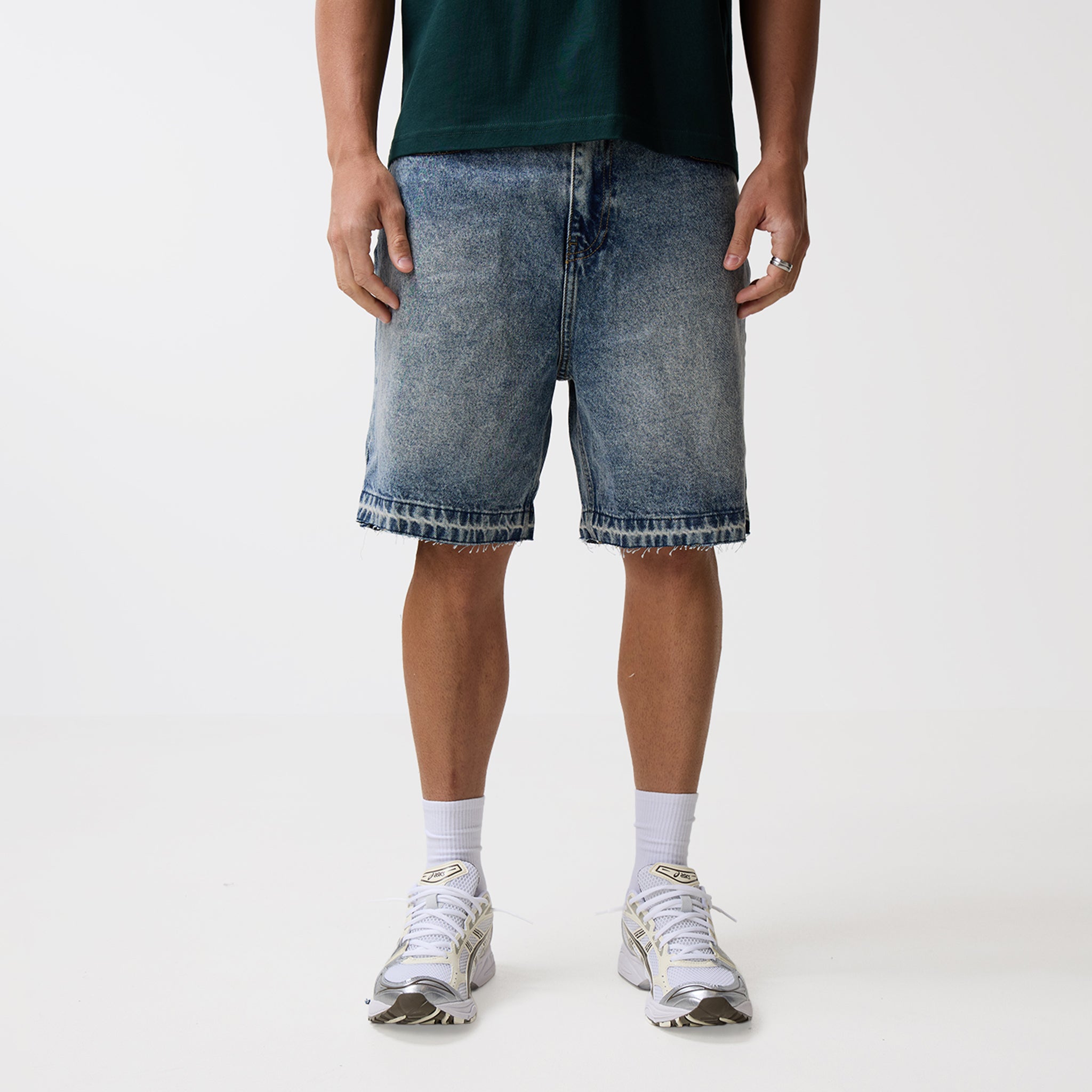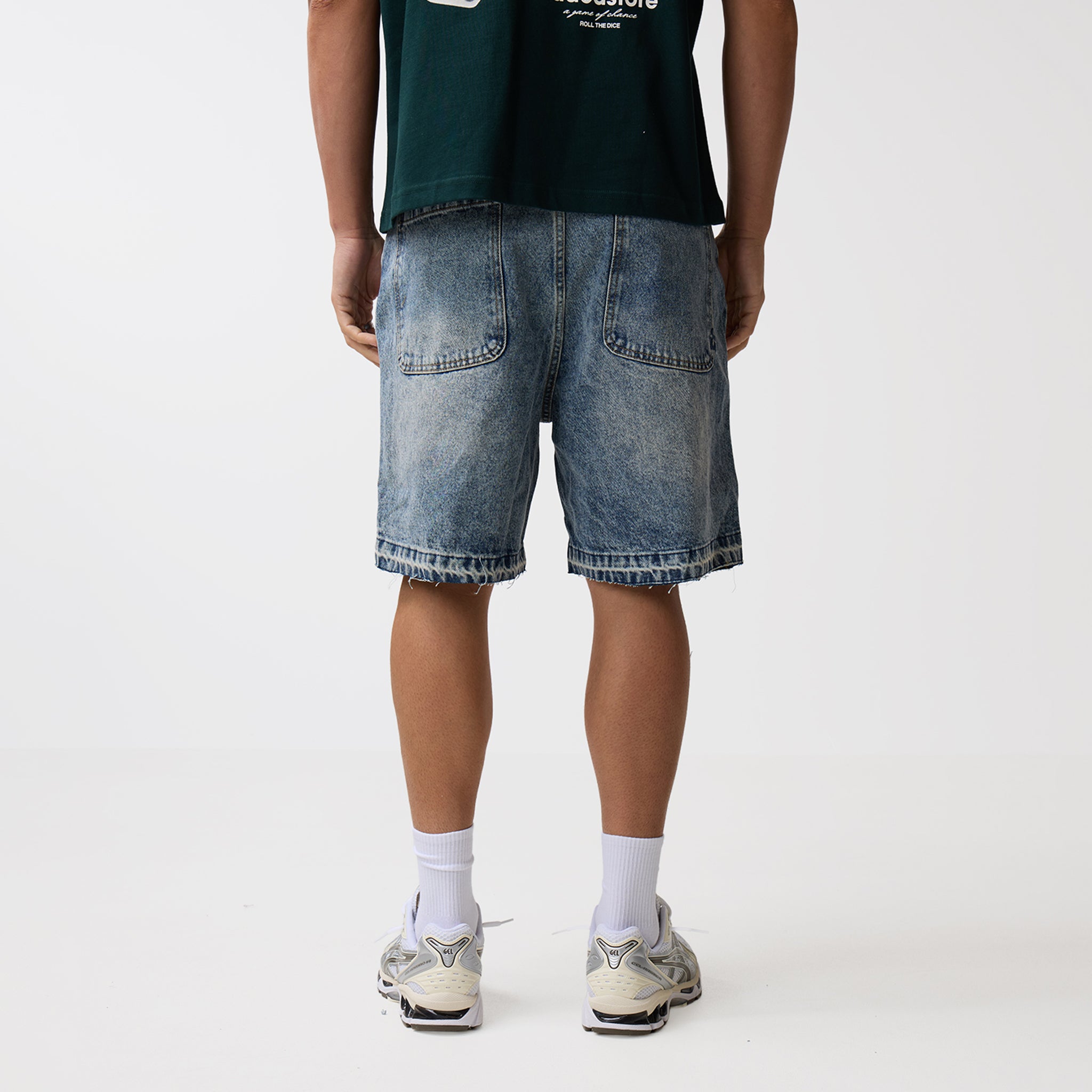 Discover the new season Unpicked Denim Shorts in Washed Blue . Crafted for the modern street aesthetic, these shorts define rugged sophistication through a signature frayed unpicked hem and deliberate light distressing across the hem and all pocket openings. Features a traditional rear yoke with durable twin-needle top-stitching and a branded metal button and concealed metal zipper fastening for a streamlined look. Functional details including classic belt loops, a fly stitch, and reinforced rear patch pockets finished with a classic Faded Store embroidered logo. Premium hardware elevates the design, from the branded rivets on the coin pocket to the metal rivets securing the top of the patch pockets, all topped off with a rear branded leather patch bar-tacked onto the waistband for an unmistakable mark of quality.