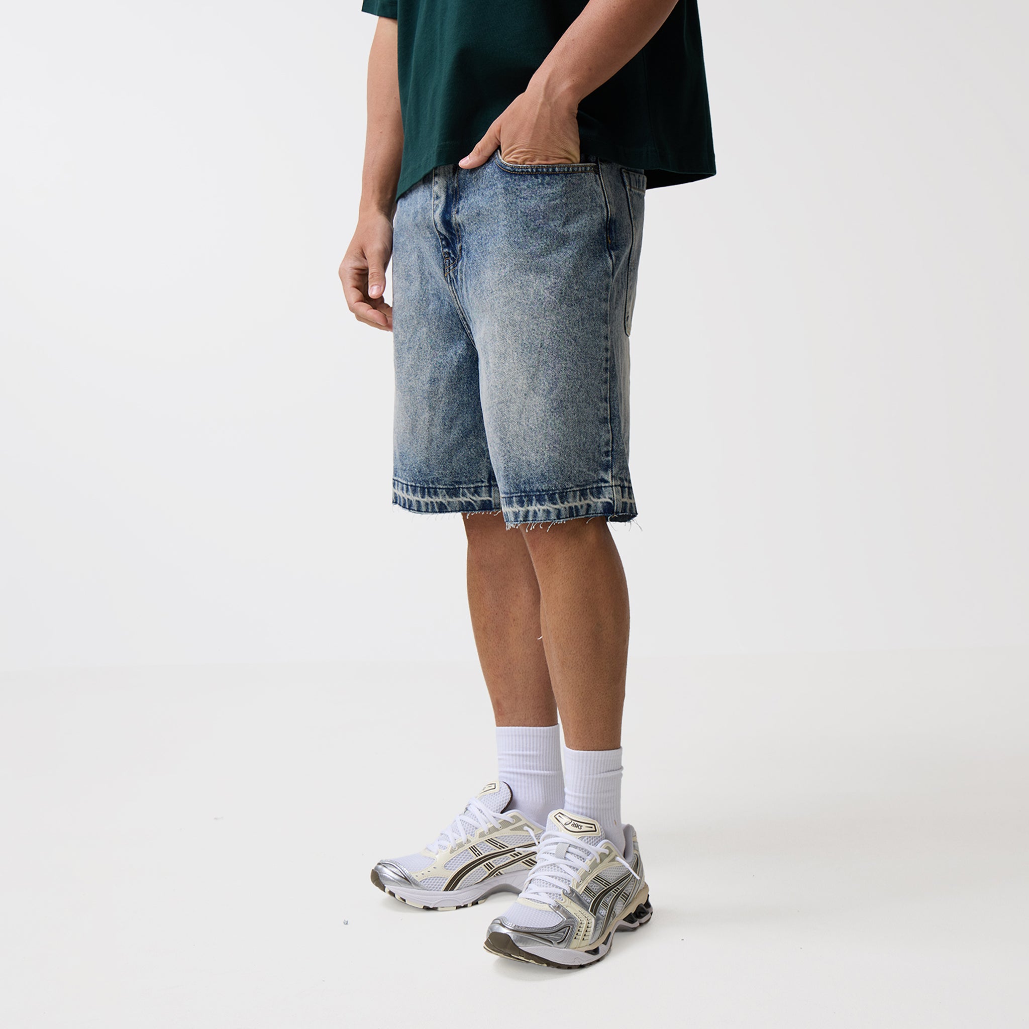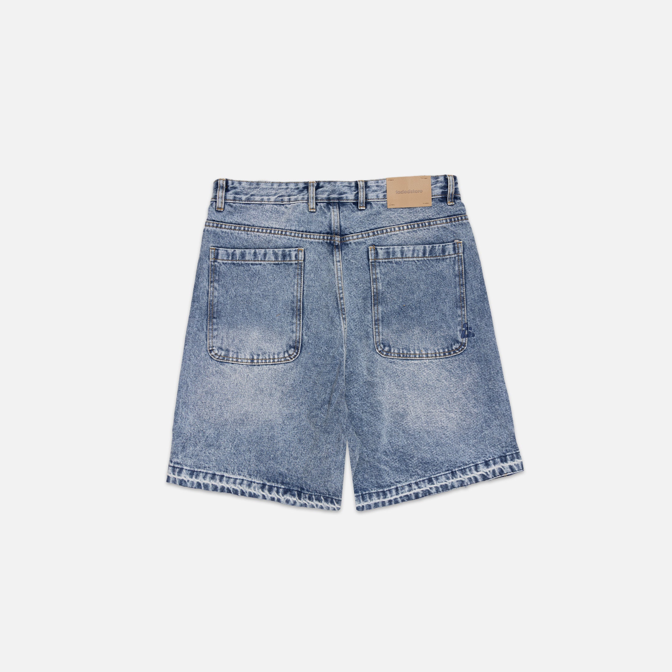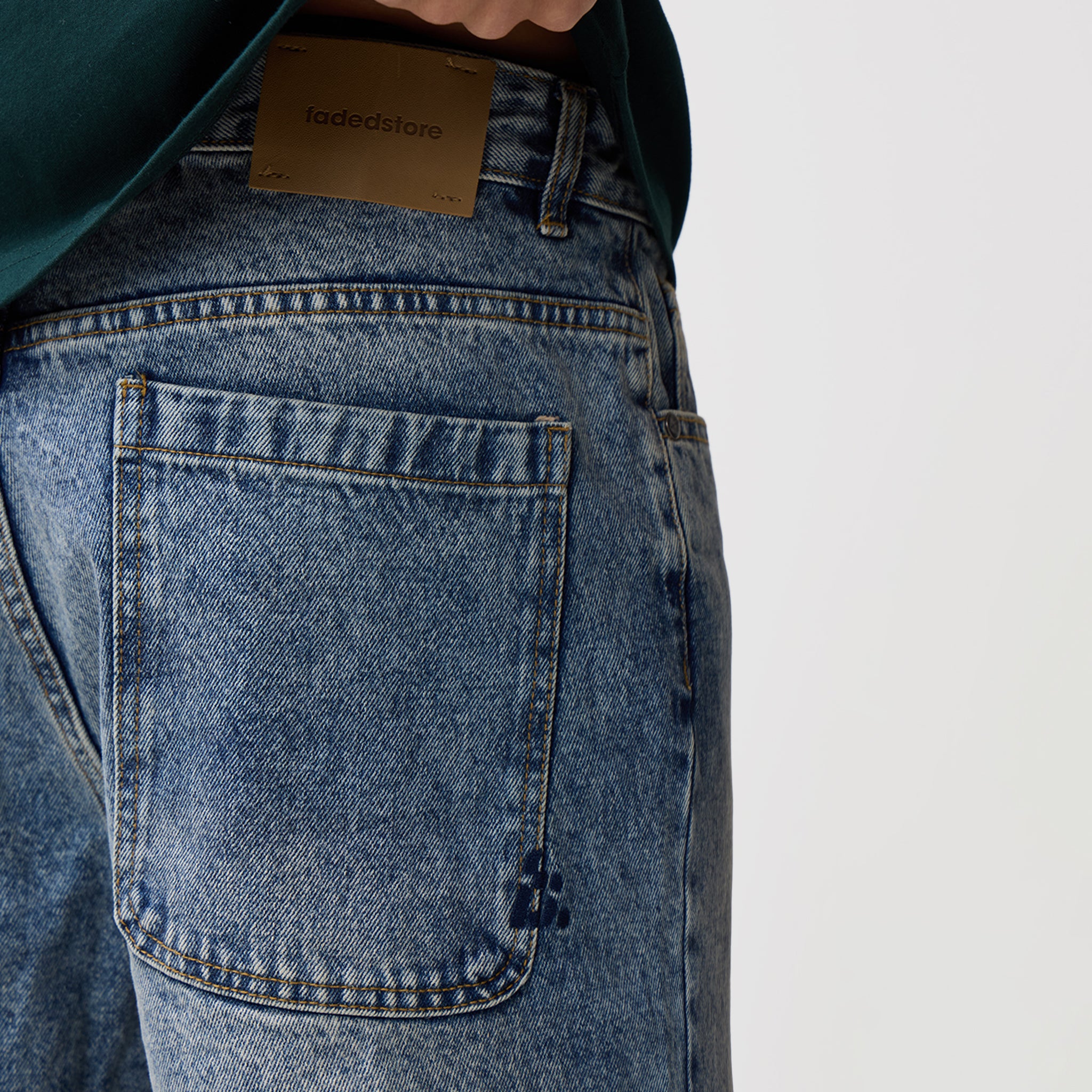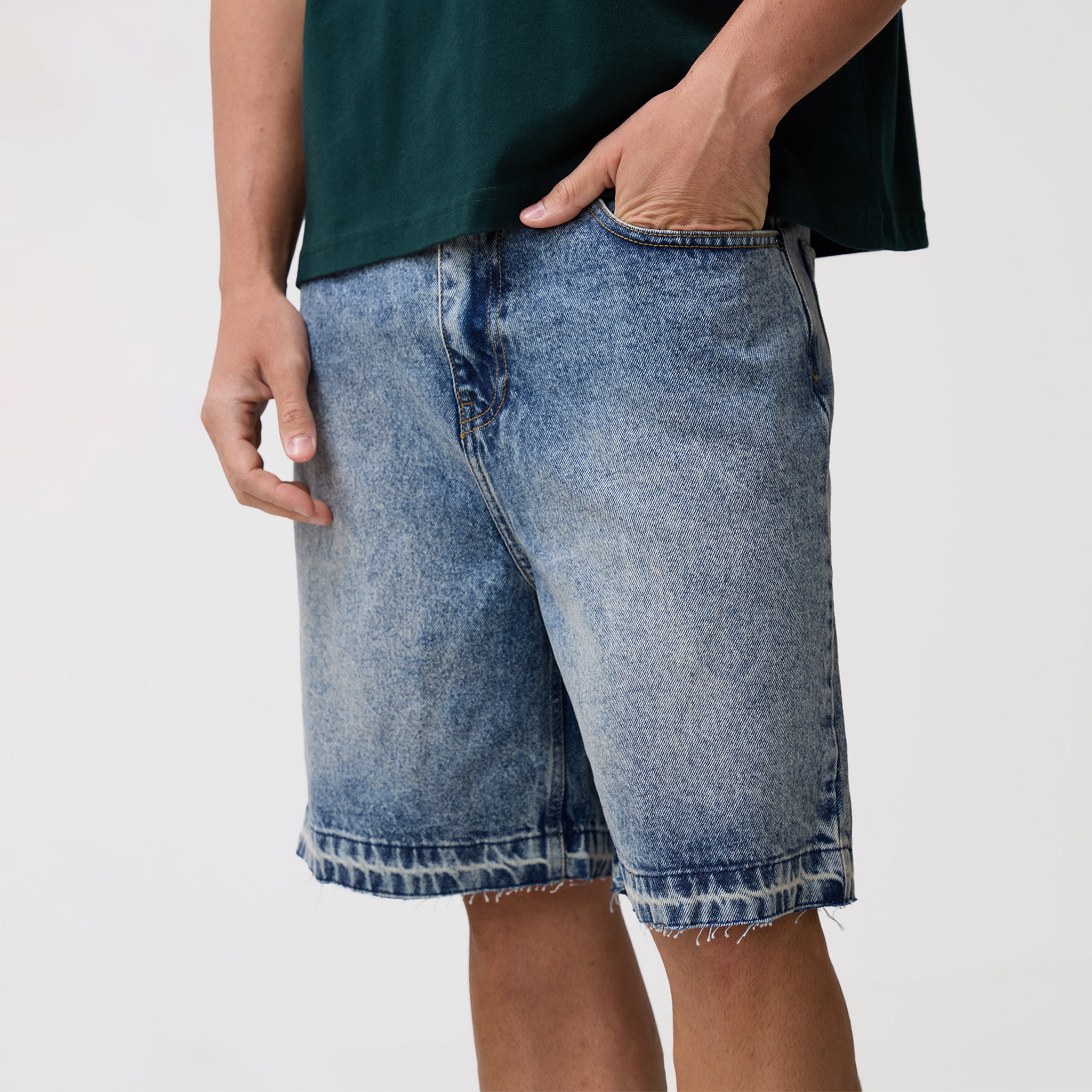 Discover the new season Unpicked Denim Shorts in Washed Blue . Crafted for the modern street aesthetic, these shorts define rugged sophistication through a signature frayed unpicked hem and deliberate light distressing across the hem and all pocket openings. Features a traditional rear yoke with durable twin-needle top-stitching and a branded metal button and concealed metal zipper fastening for a streamlined look. Functional details including classic belt loops, a fly stitch, and reinforced rear patch pockets finished with a classic Faded Store embroidered logo. Premium hardware elevates the design, from the branded rivets on the coin pocket to the metal rivets securing the top of the patch pockets, all topped off with a rear branded leather patch bar-tacked onto the waistband for an unmistakable mark of quality.