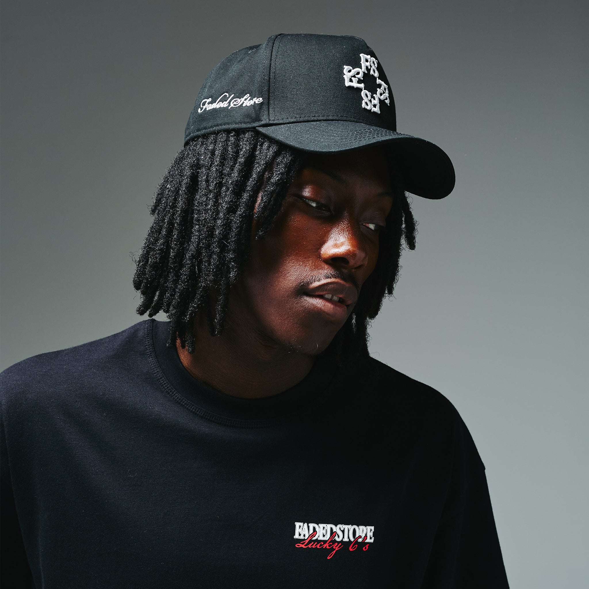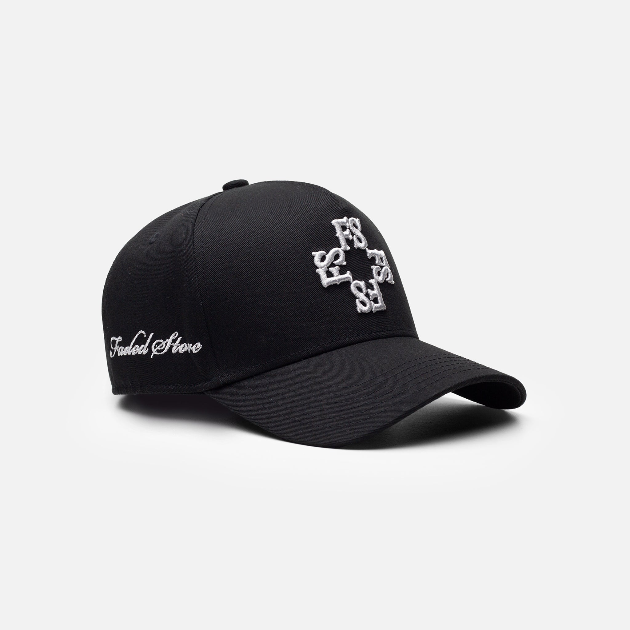 Discover the FadedStore Monogram Cap in black, the essential accessory of the season. The iconic front monogram logo takes center stage on this essential piece. It's built with a classic curved peak and durable single stitch. Stay cool thanks to the ventilation eyelets, and find your ideal fit with the practical snap back adjuster. Key details including the FadedStore woven label and the carefully placed side embroidery, set this unique hat apart.
