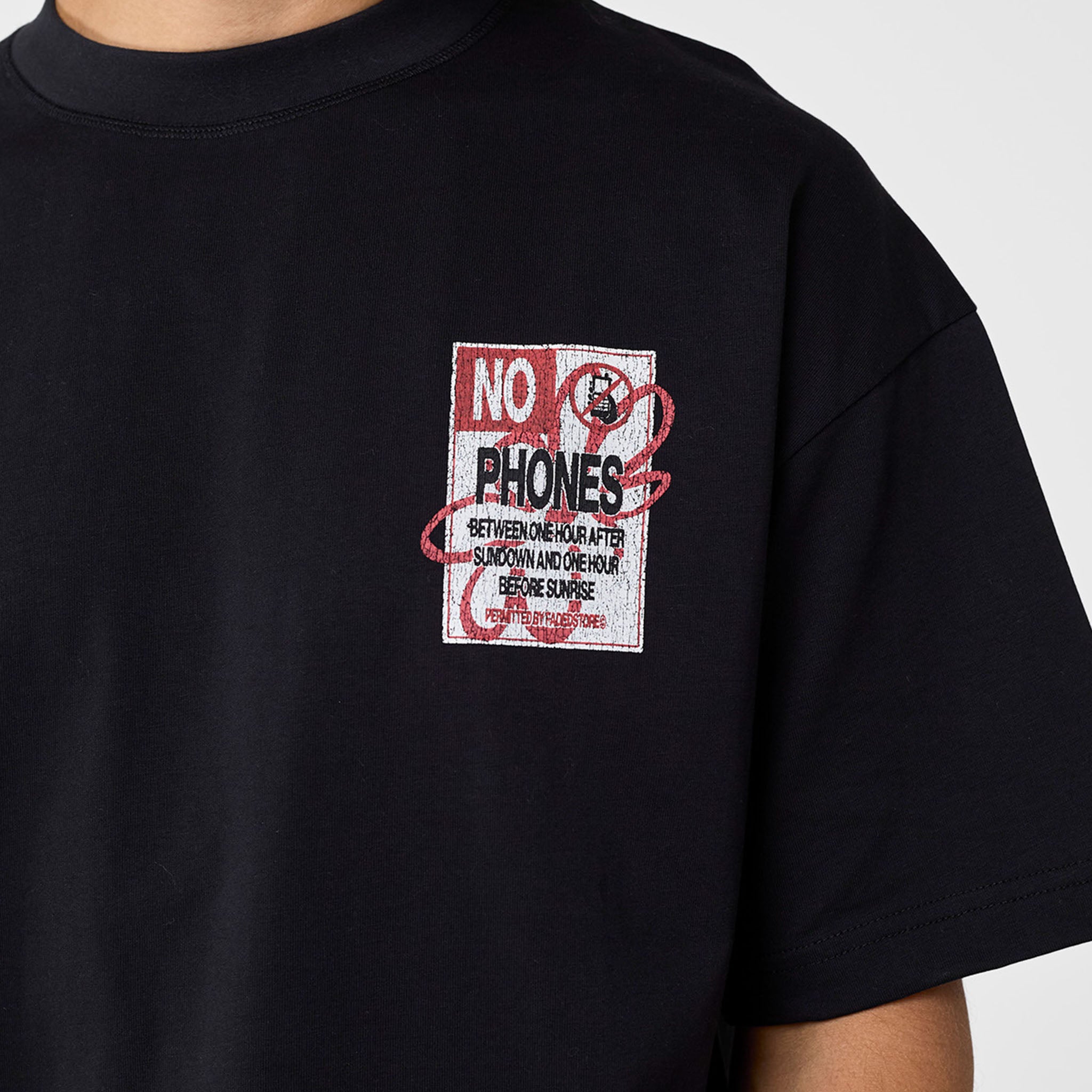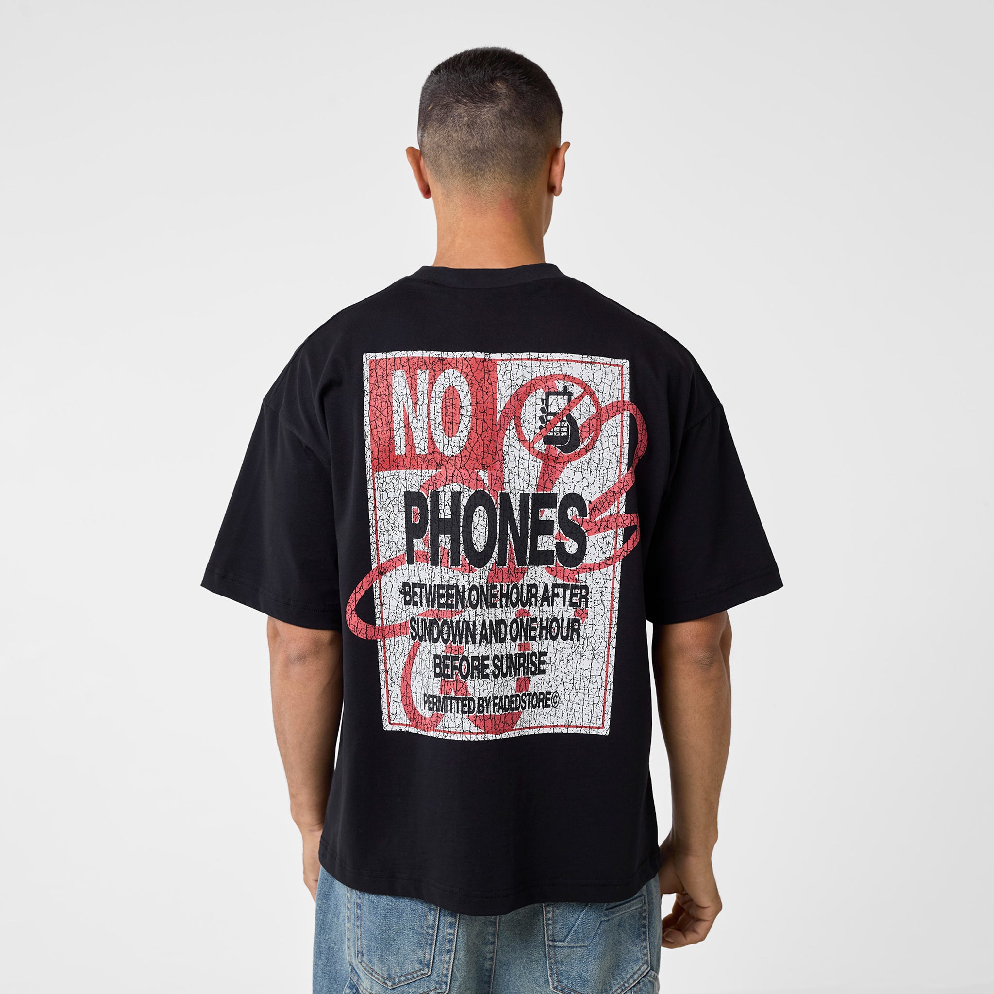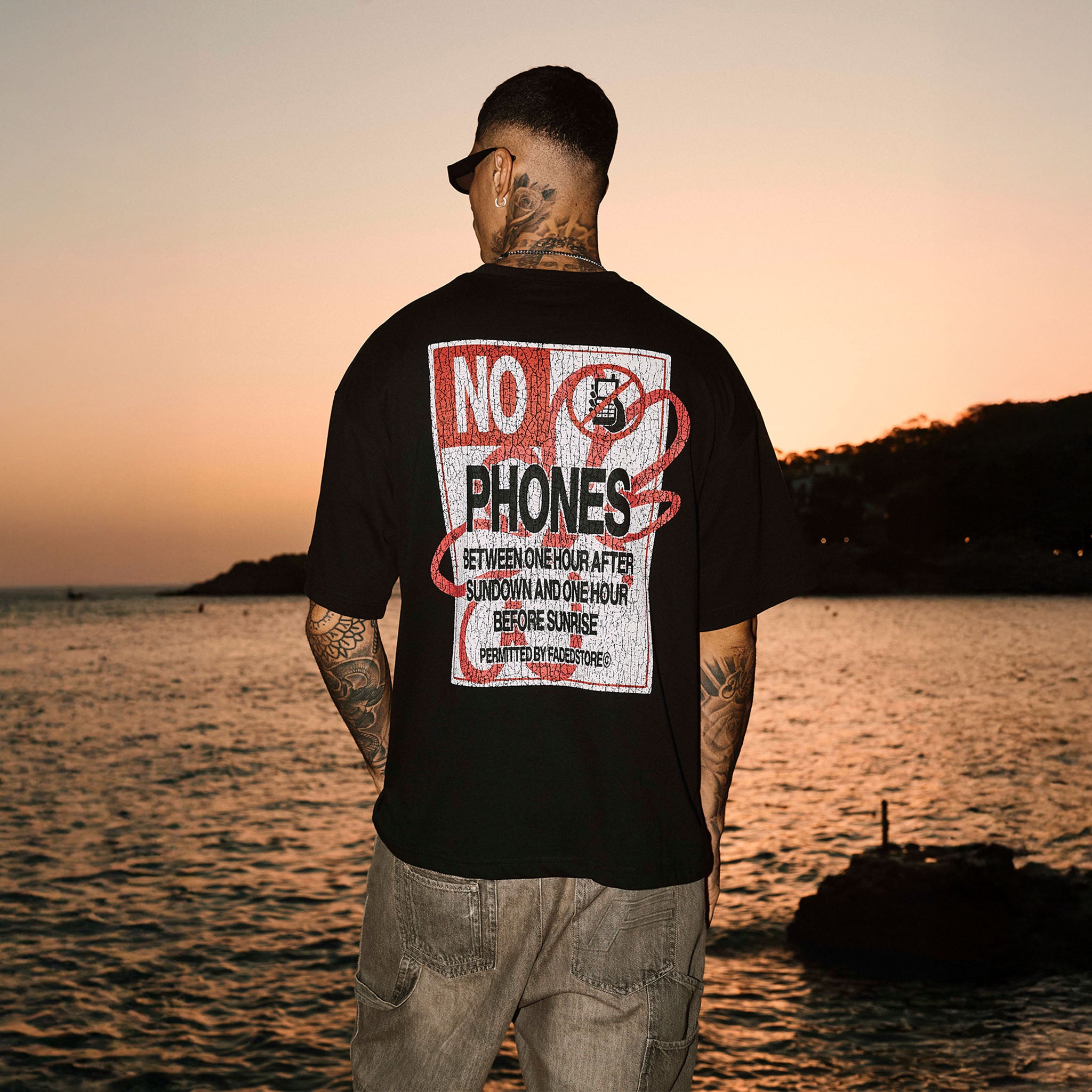 Elevate your casual look with the bold No Phones Tee in black . Designed with a classic crew neck and short sleeves, this tee provides a comfortable foundation for any outfit. The dynamic front and back graphics add a unique touch, making it ideal for layering or wearing solo. Crafted from a breathable cotton blend, it's perfect for everything from weekend outings worn with carpenter jeans to laid-back errands teamed with shorts.