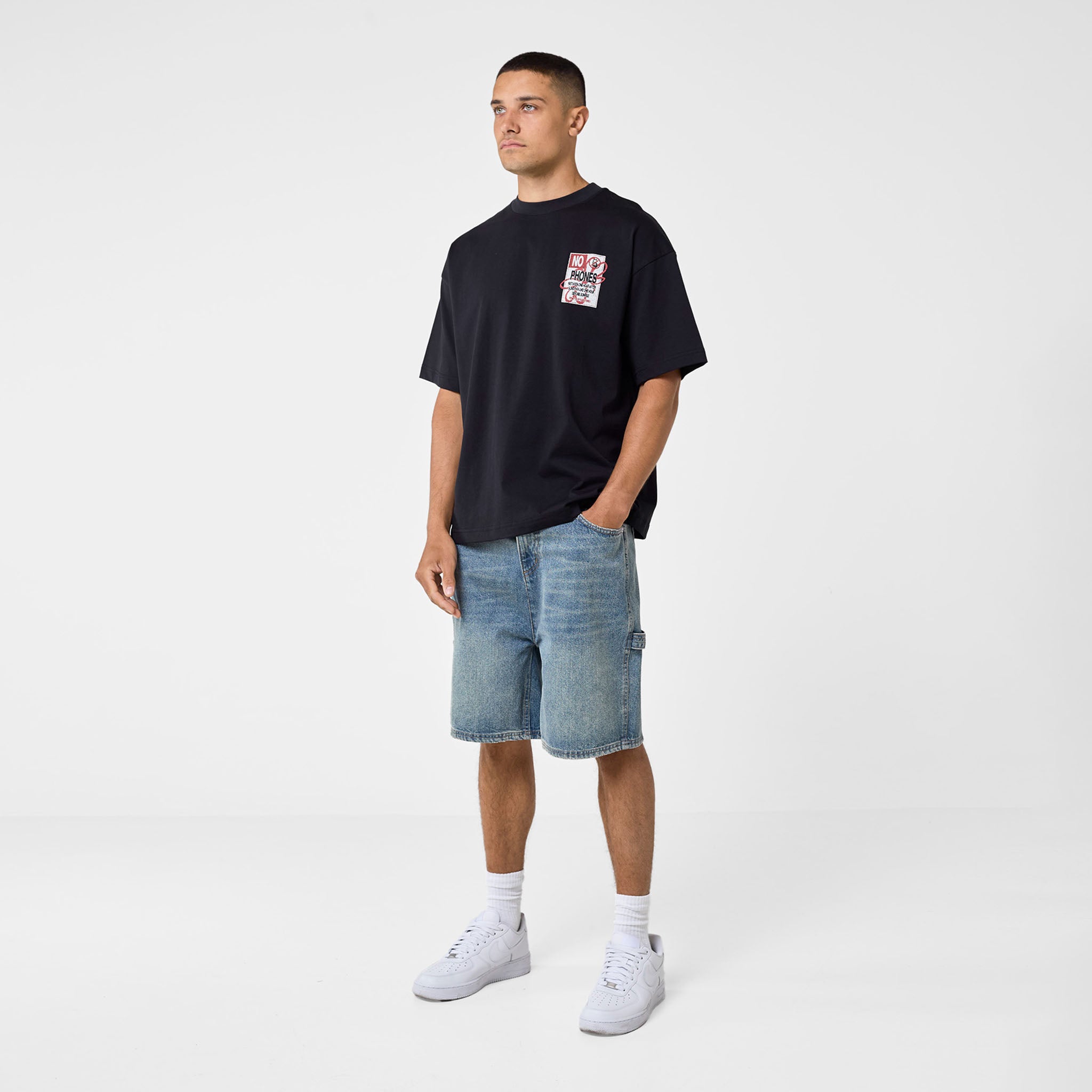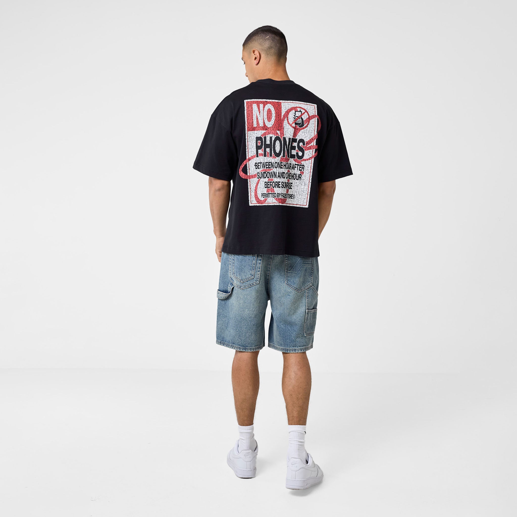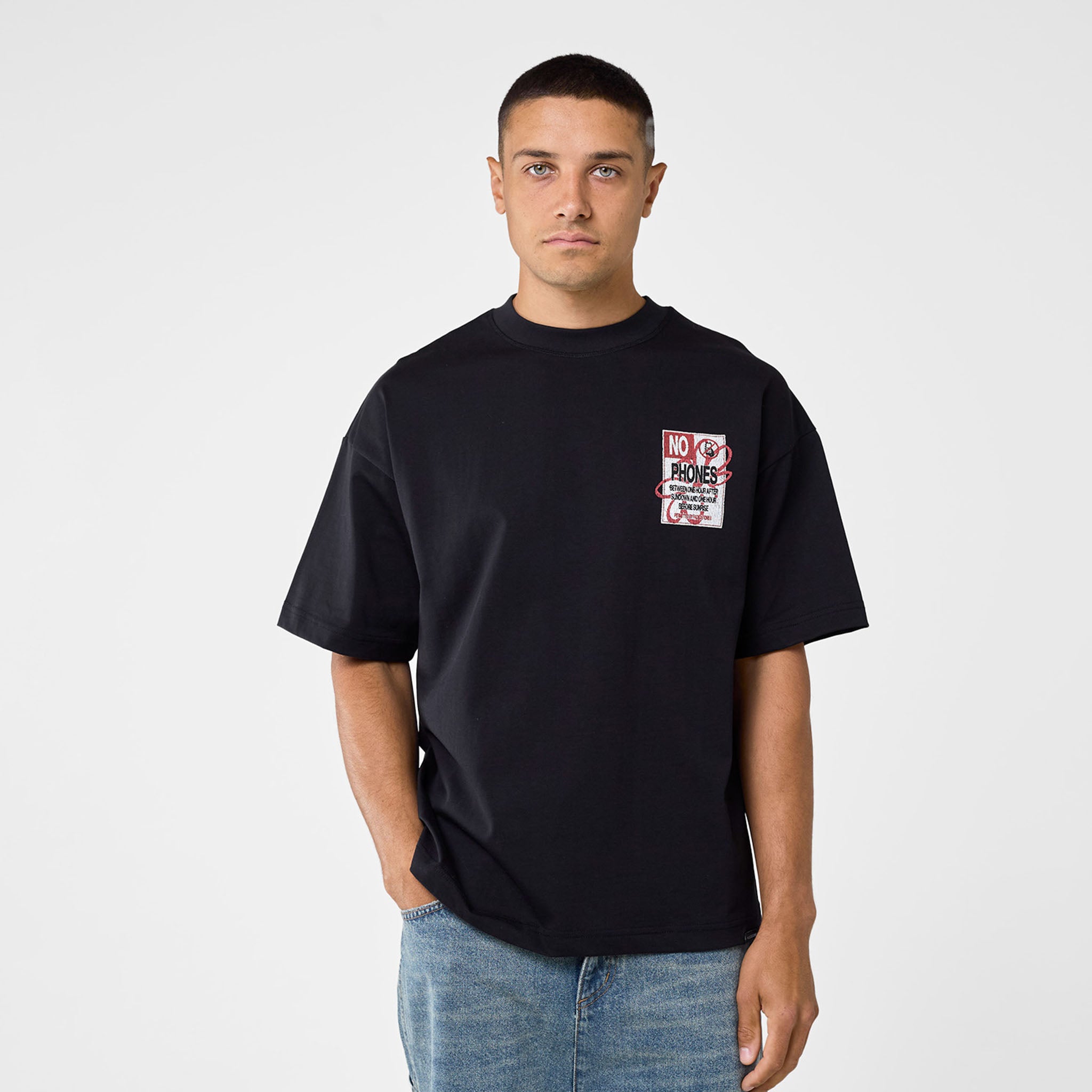 Elevate your casual look with the bold No Phones Tee in black . Designed with a classic crew neck and short sleeves, this tee provides a comfortable foundation for any outfit. The dynamic front and back graphics add a unique touch, making it ideal for layering or wearing solo. Crafted from a breathable cotton blend, it's perfect for everything from weekend outings worn with carpenter jeans to laid-back errands teamed with shorts.