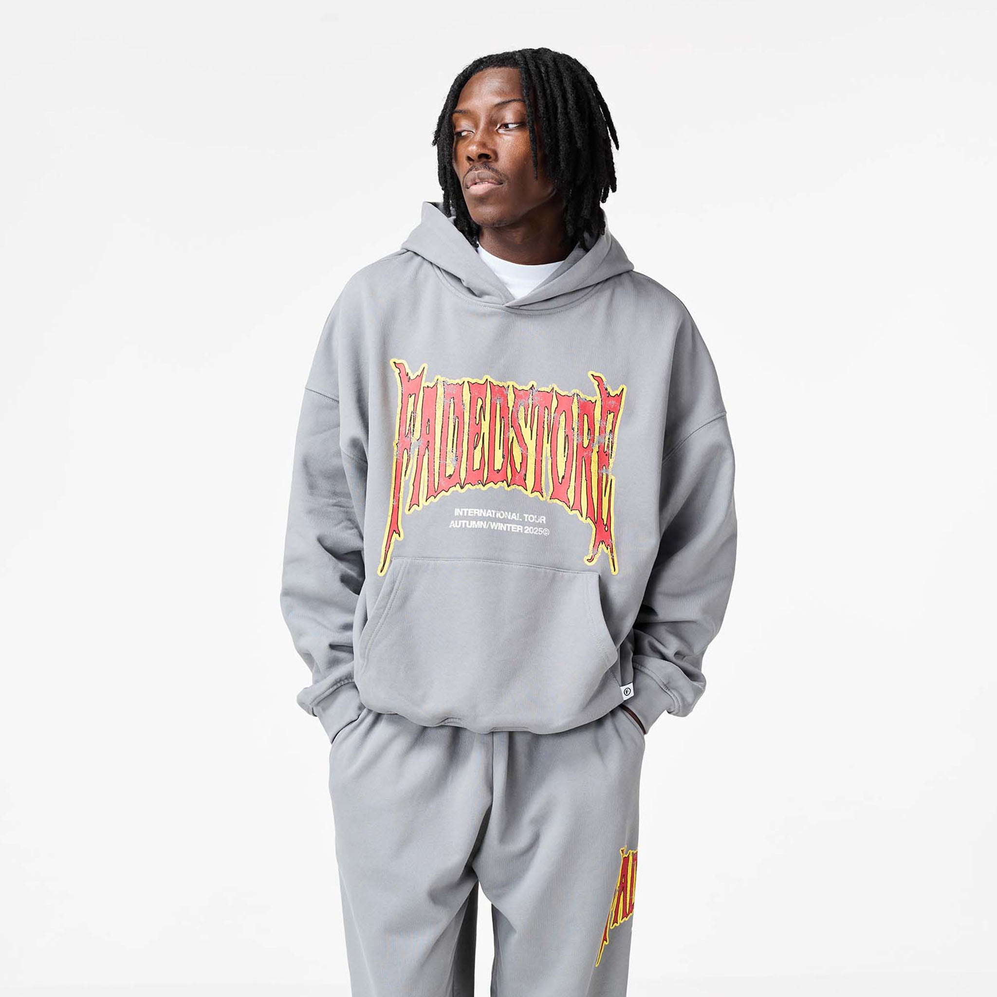 Elevate your casual rotation with the new season FadedStore Blackletter Hoodie in sophisticated mid grey. A statement piece designed for ultimate streetwear style. Experience superior warmth and distinctive design with its plush, single-piece lined hood featuring an elegant cross-over front. The prominent FadedStore logo graphic across the chest creates an effortless edge. Finished with a front kangaroo pocket, this premium hoodie seamlessly combines elevated design with everyday utility. Perfect for layering with a box fit t-shirt and the matching joggers to complete the look.
