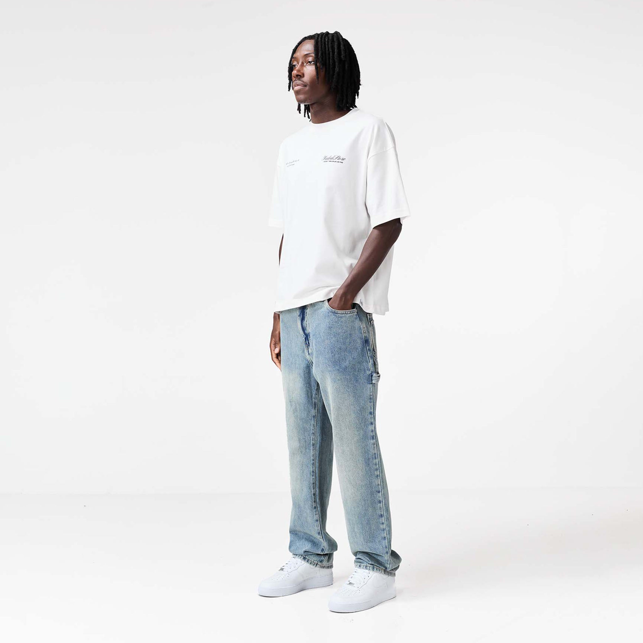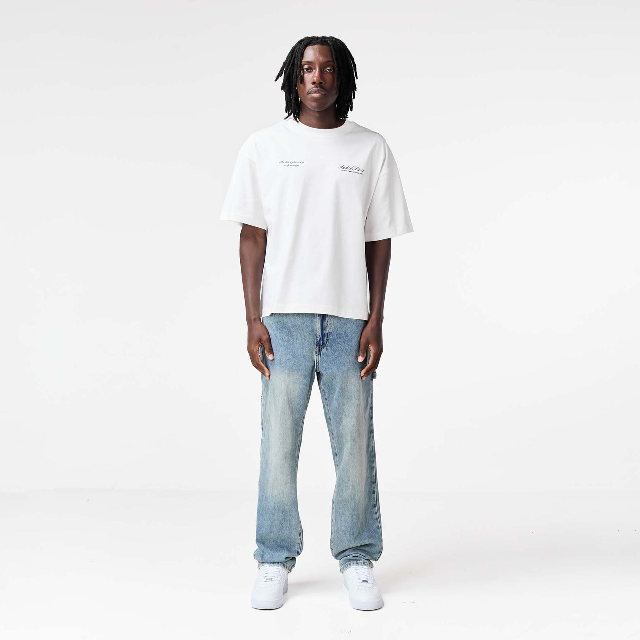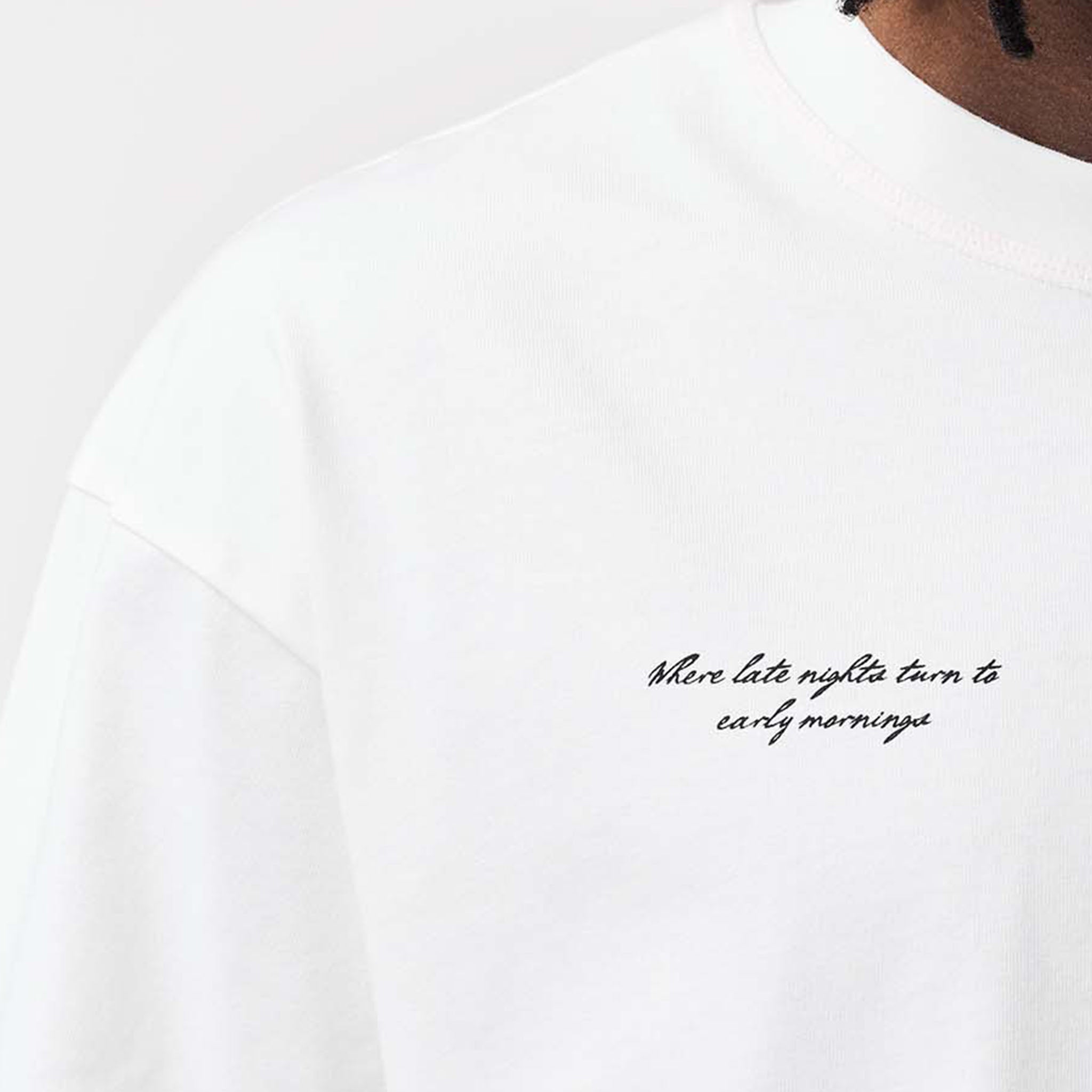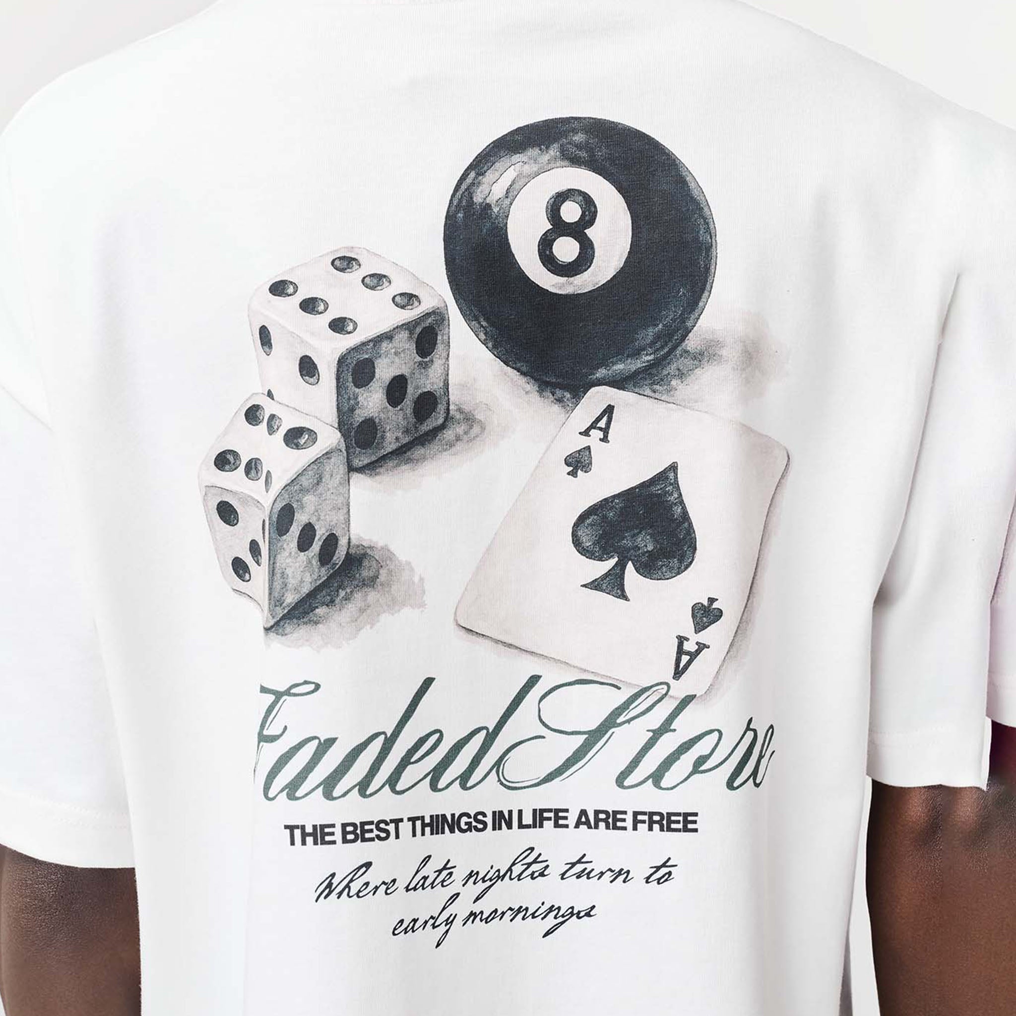 It's game on for style with our new season Late Nights Graphic T-Shirt in washed off-white. This tee combines a comfortable crew neck and flatlock-stitched neckline for a clean, modern fit. Designed with short sleeves for ultimate ease, it sports a distinct chest logo and accompanying text print for a bold front. The back of this premium tee truly delivers with an impressive, dynamic poker-inspired logo and printed design, making a powerful statement. Expertly finished with self-turn hem and cuffs and our signature 'F' logo woven label, this off-white men's essential ensures you're always in style, team with signature carpenter jeans for an unmatched look.