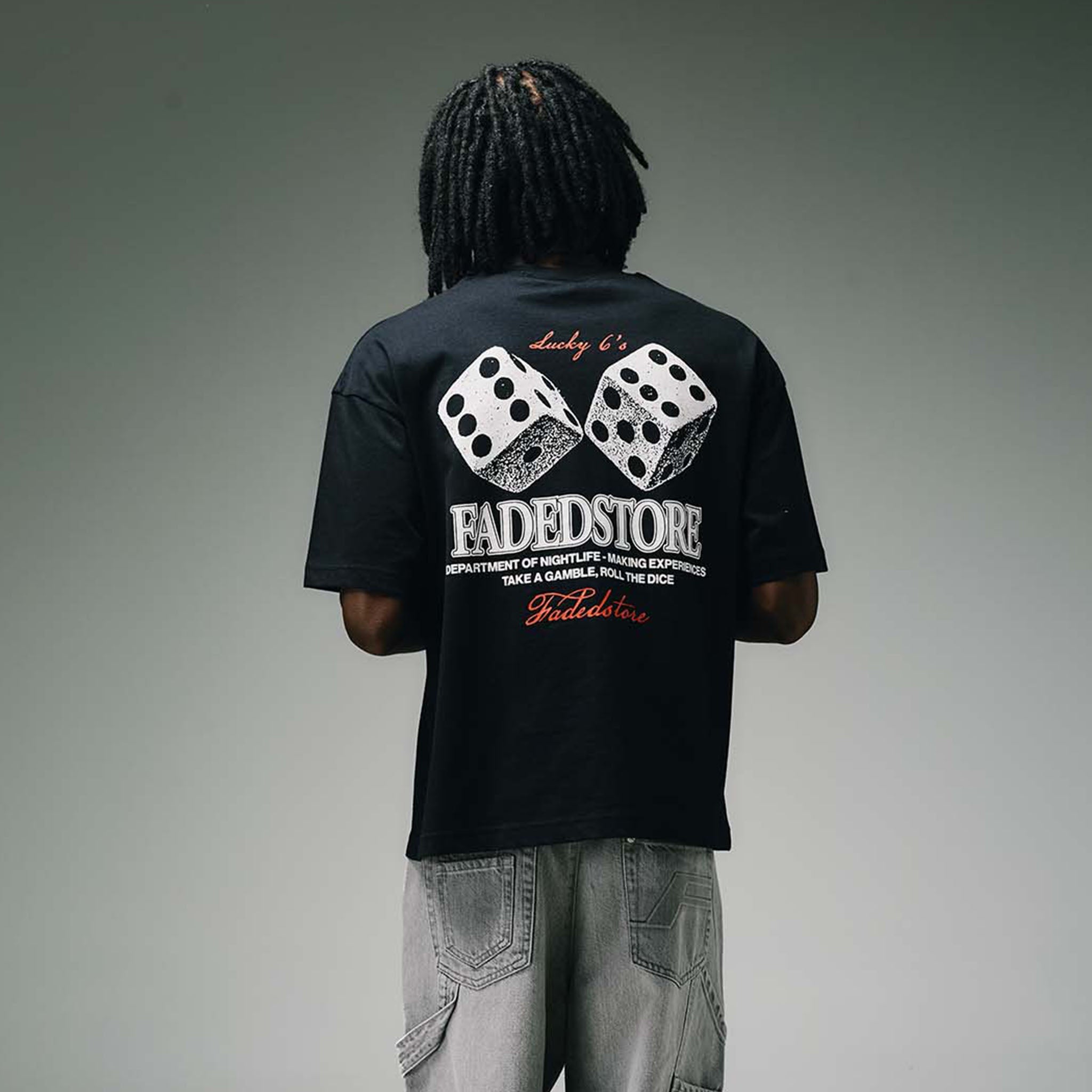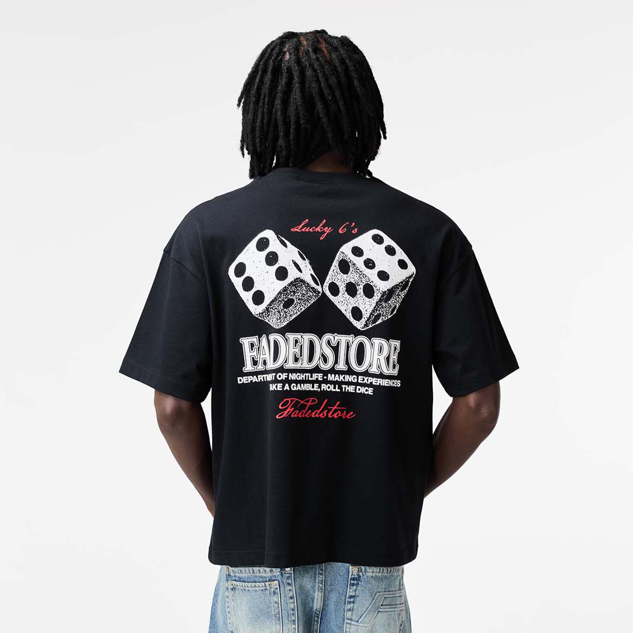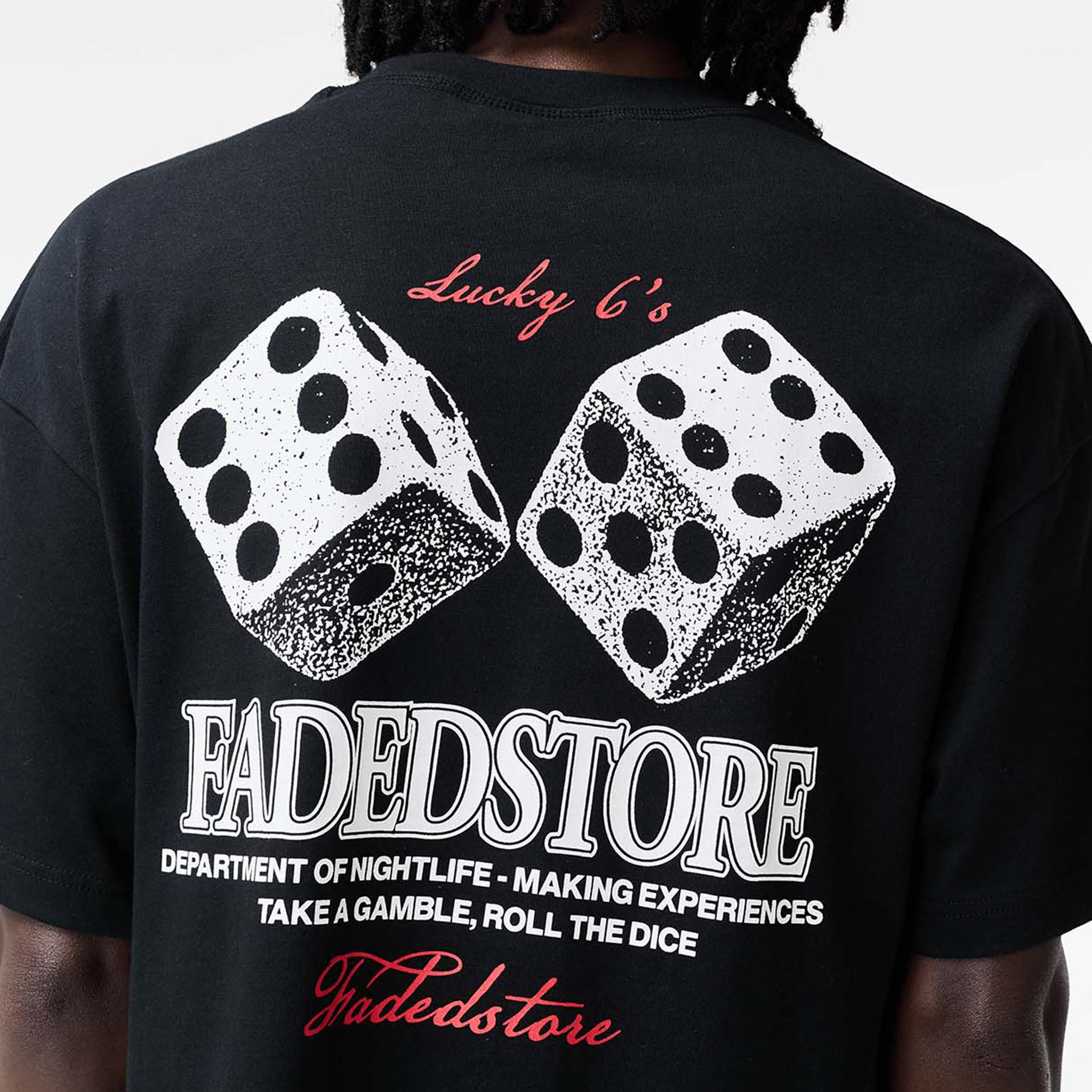 Your winning style essential has arrived: the new season Lucky 6's Graphic T-Shirt in black. This meticulously crafted tee features a comfortable crew neck collar with flatlock detailing, ensuring a smooth and modern fit. Its short sleeves guarantee effortless wearability for any occasion. A discreet chest logo adds a touch of signature FadedStore class upfront, while an impactful dice graphic on the rear makes a powerful, undeniable statement. Completed with a clean self-turn hem and cuffs and our iconic 'F' logo woven label at the hem, this black tee is the perfect match for your signature FadedStore denim.