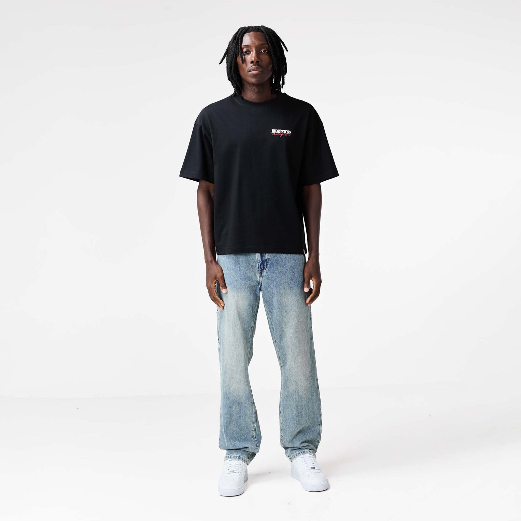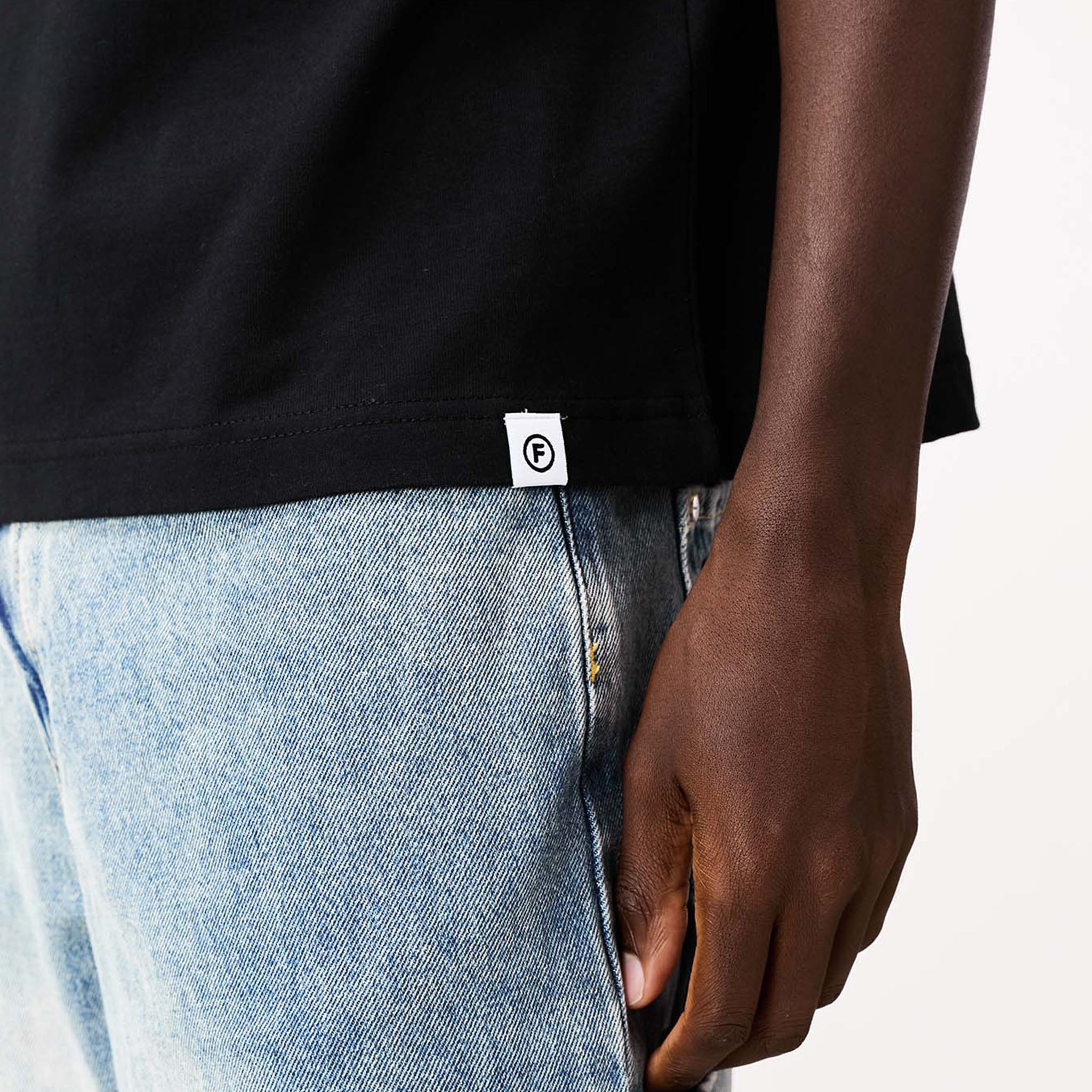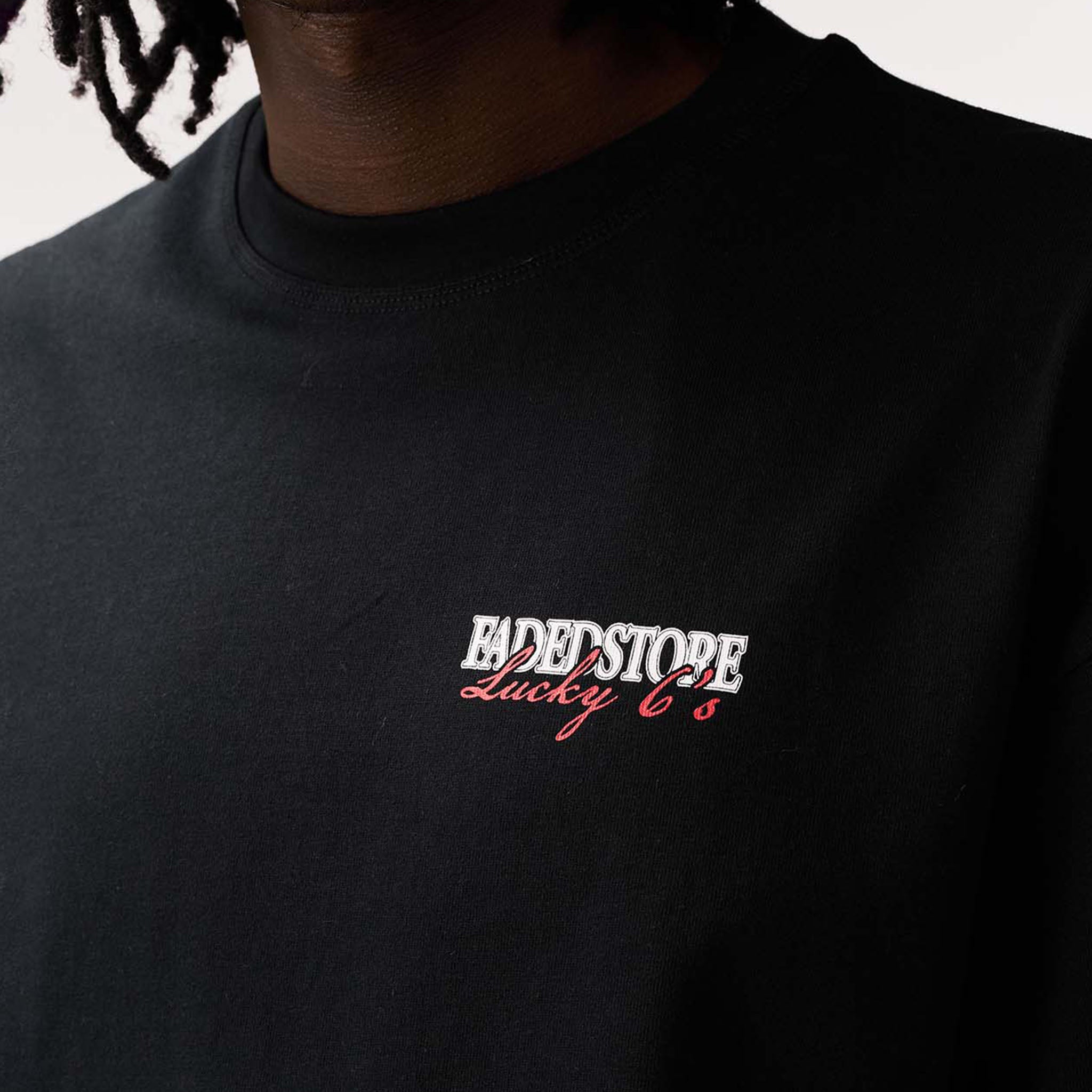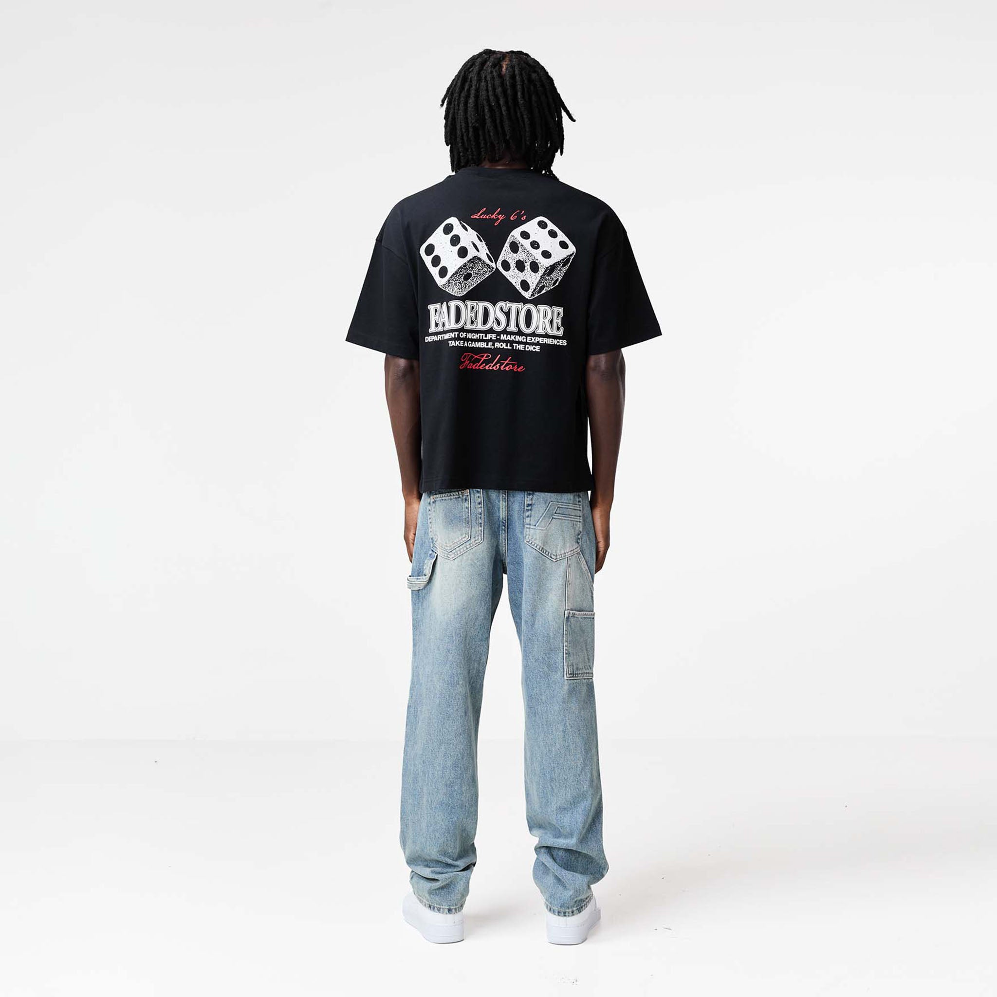 Your winning style essential has arrived: the new season Lucky 6's Graphic T-Shirt in black. This meticulously crafted tee features a comfortable crew neck collar with flatlock detailing, ensuring a smooth and modern fit. Its short sleeves guarantee effortless wearability for any occasion. A discreet chest logo adds a touch of signature FadedStore class upfront, while an impactful dice graphic on the rear makes a powerful, undeniable statement. Completed with a clean self-turn hem and cuffs and our iconic 'F' logo woven label at the hem, this black tee is the perfect match for your signature FadedStore denim.