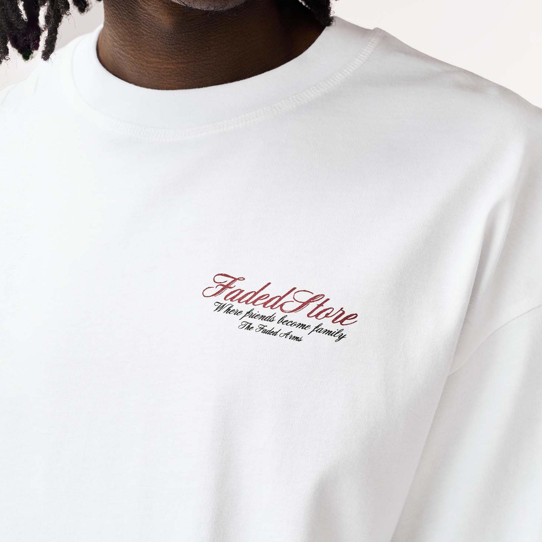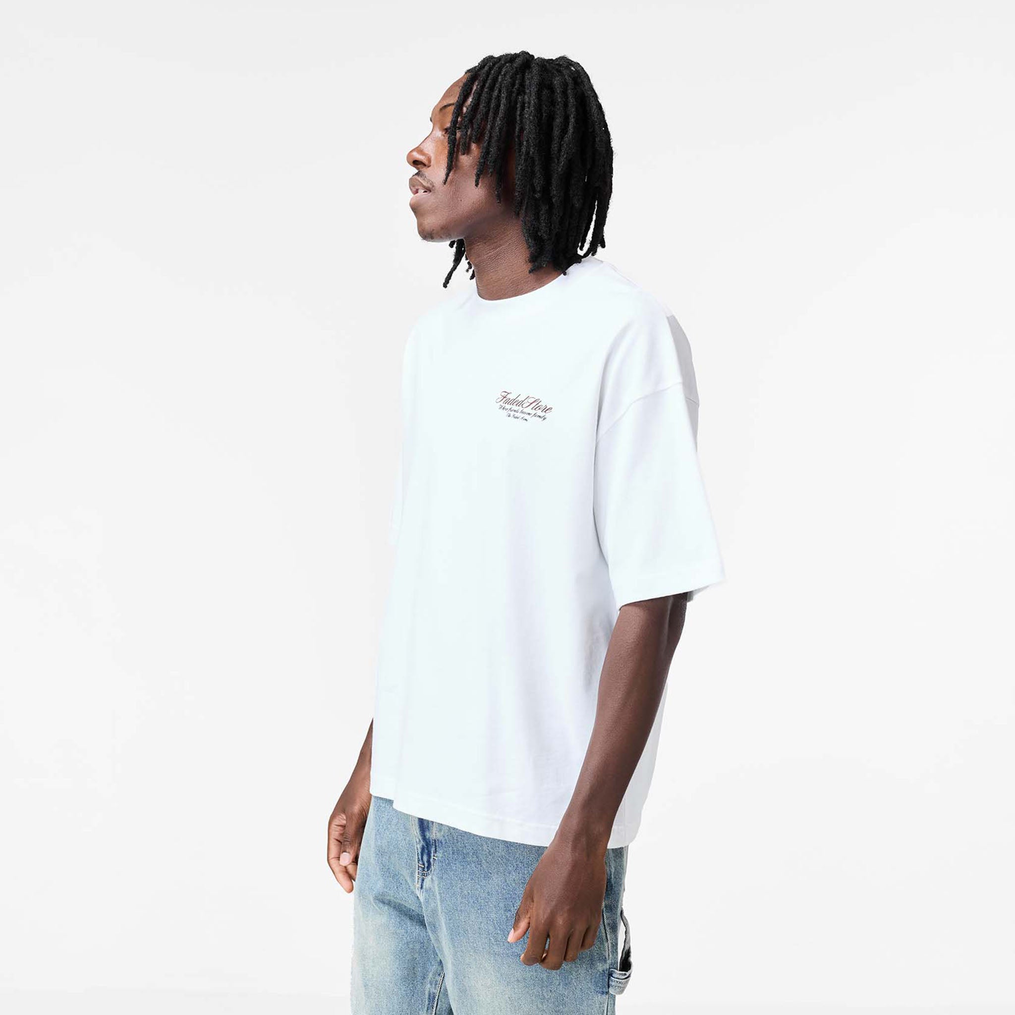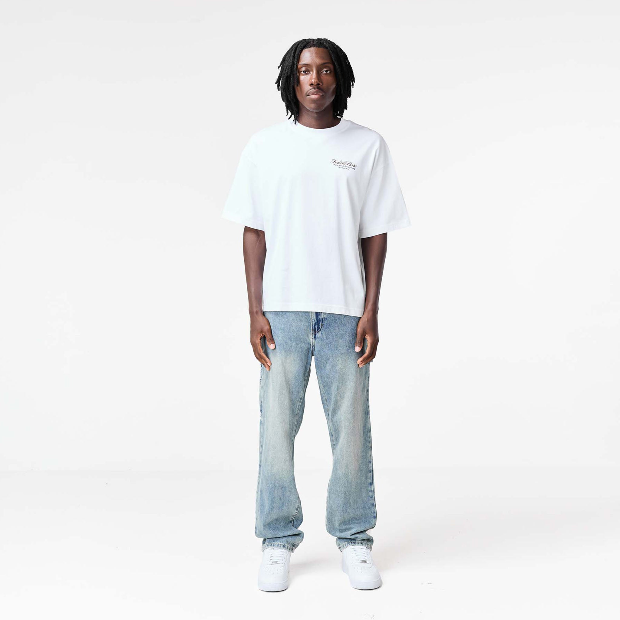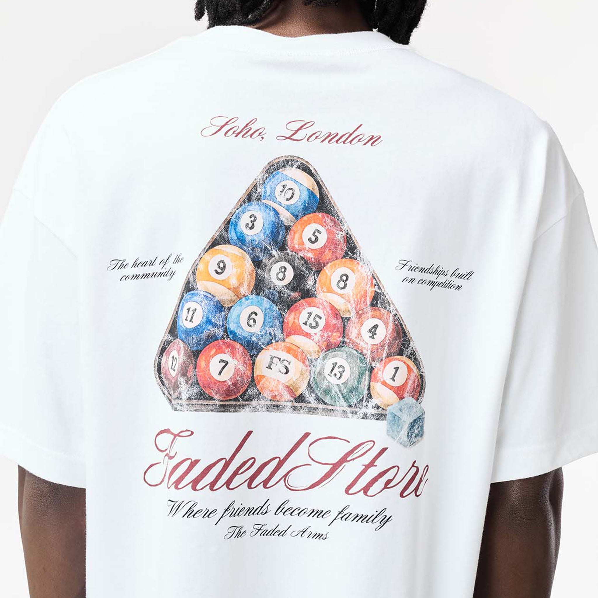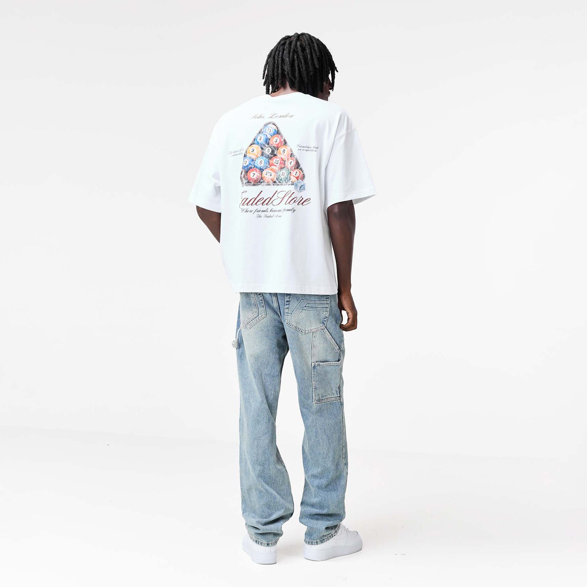 Make a statement with the new season Pool Table Graphic T-Shirt in crisp white, a unique style to effortlessly elevate your look. It's crafted with a classic crew neck and perfectly tailored short sleeves, ensuring both ultimate comfort and a sharp streetwear edge. A subtly refined printed logo graces the front, while a bold, distressed-style pool table graphic commands attention on the rear. Every stitch and detail, including the graphic's texture and the authentic woven label hem, speaks volumes about its superior design.