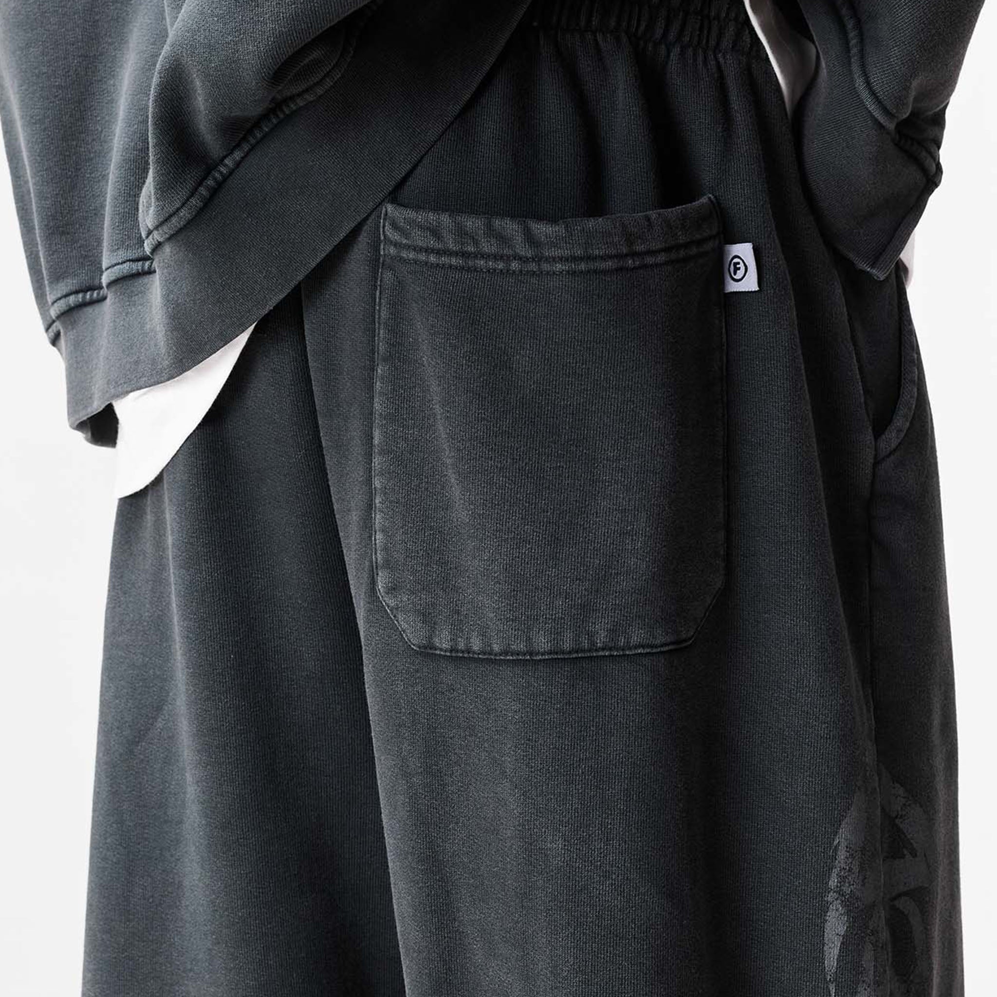 Introducing the new season Shadow Loose Fit Open Hem Jogger in washed black. These joggers are a modern and elevated take on casual comfort. Constructed from a premium, heavyweight 422 GSM cotton for a substantial feel and superior durability. The design features a relaxed open hem and a detailed cut and sew waistband with internal drawcords, ensuring a personalised and secure fit. Functional and stylish, they are equipped with distinctive curved side pockets and additional rear pockets for your essentials. A bold FadedStore graphic logo runs down the side seam, while our signature 'F' logo label on the back pocket adds a subtle touch of signature Fadedstore detailing. These joggers seamlessly blend quality craftsmanship with a modern streetwear aesthetic, making them a versatile staple for any wardrobe.