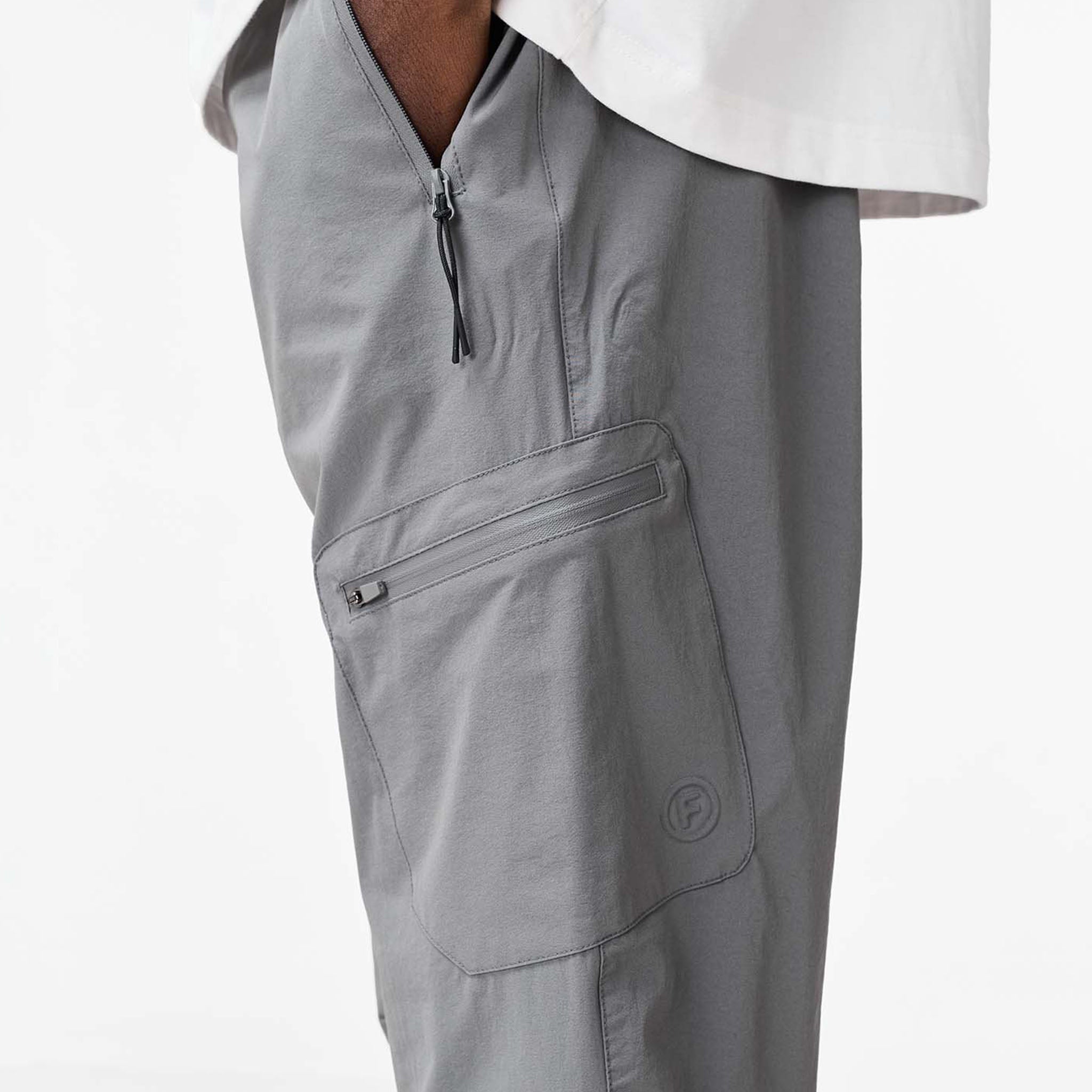 Introducing the Stretch Tech Open Hem Cargo Pant in mid grey, a style staple that's equally practical and on-trend. These cargos offer a contemporary open hem fit and feature a comfortable cut and sew waistband with internal flat drawcords for an adaptive fit. Designed with forward-facing zipped pockets and durable zipper pulls, along with spacious front cargo pockets, also equipped with zipper pulls, for all your essentials. A subtle 'F' logo detail on the pocket adds a mark of distinction. The design is completed by a refined rear yoke with single stitch and a prominent cut and sew panel at the knee. An internal bungee cord and adjuster at the hem allows for versatile styling, ensuring these trousers adapt to your every need.