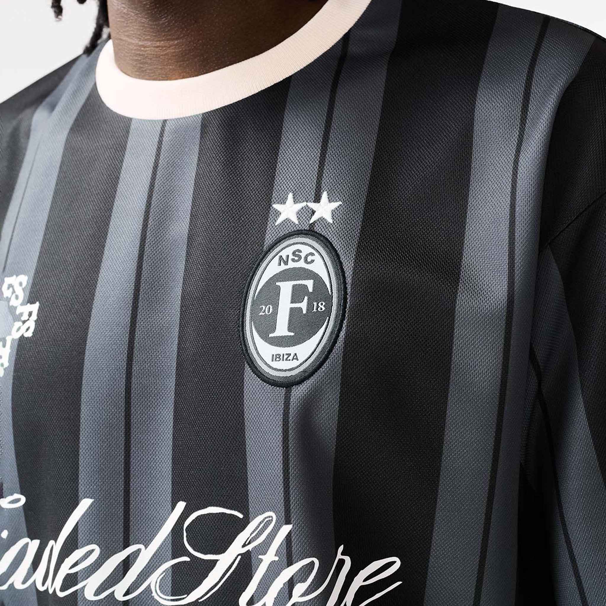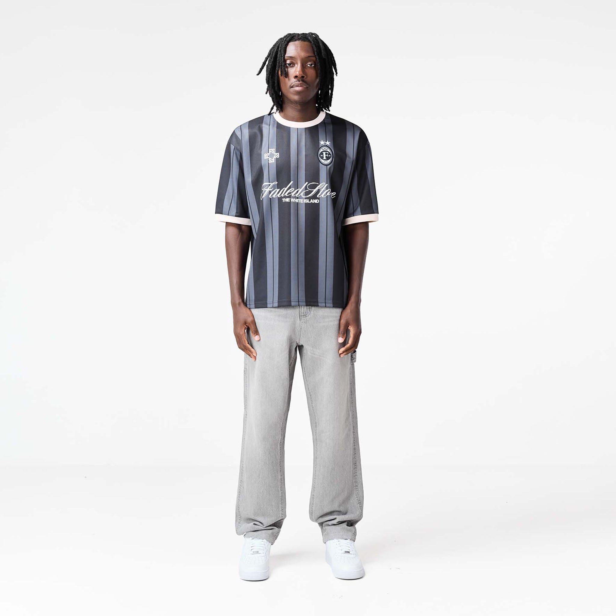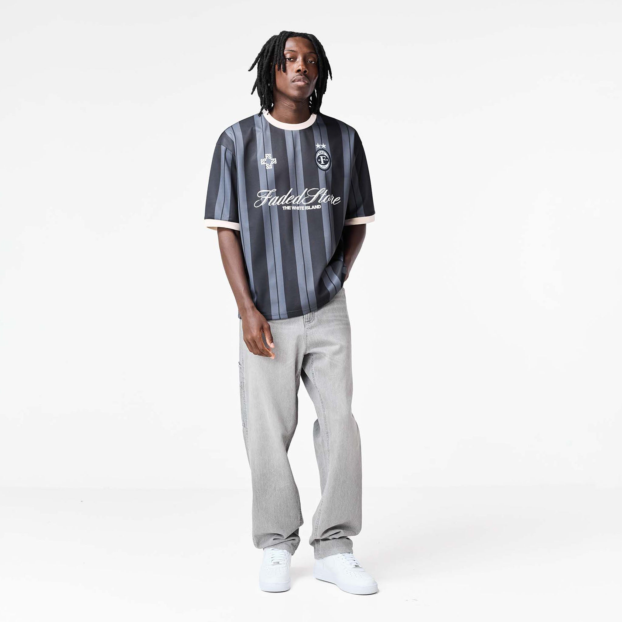 Introducing the Striker Football Tee, now reinvented in a minimalist black/off-white shade. This short-sleeve crew neck provides a contemporary revamp to a classic style. You'll find it boasts meticulously tailored neck and cuff finishes, along with a crisp, self-edge hem for an effortlessly clean profile. A subtle, integrated stripe pattern lends that unmistakable FadedStore character. Signature details include refined chest monogram, a prominent badge motif, and the classic FadedStore script elegantly positioned across the front—seamlessly blending a nostalgic and modern vibe.