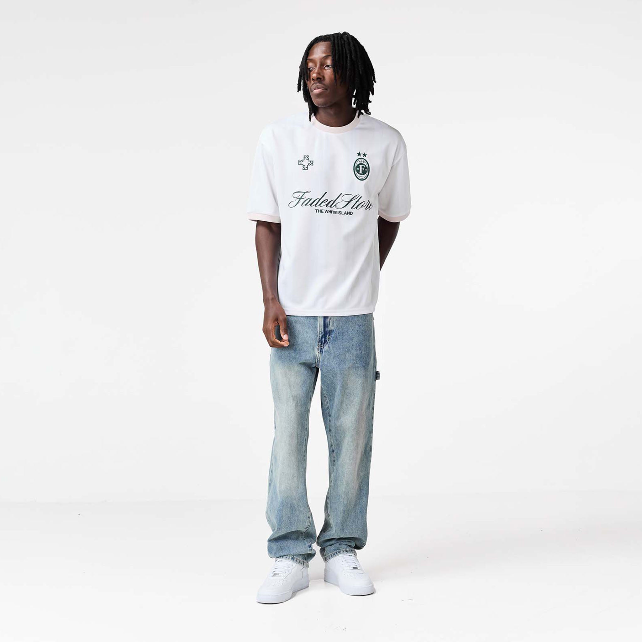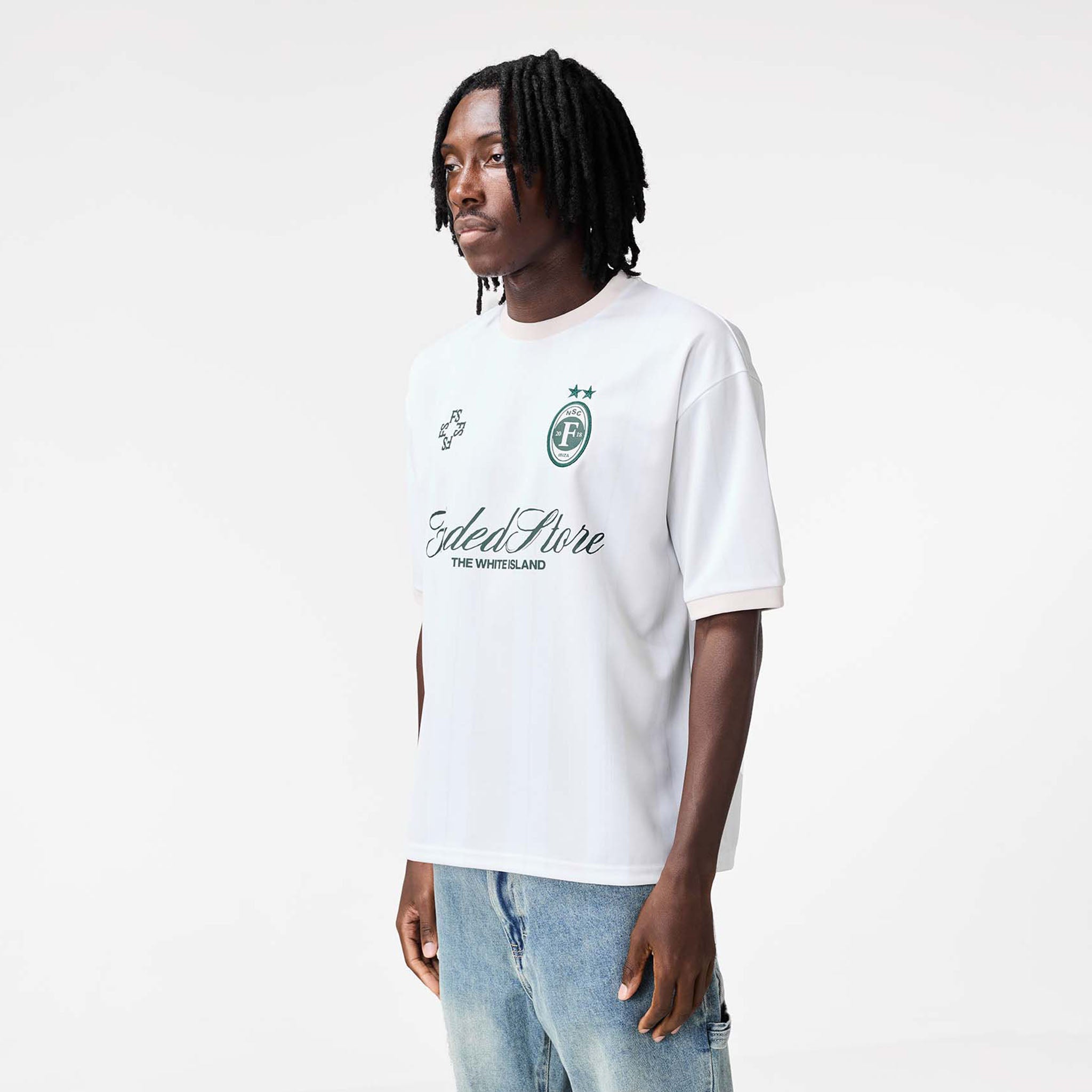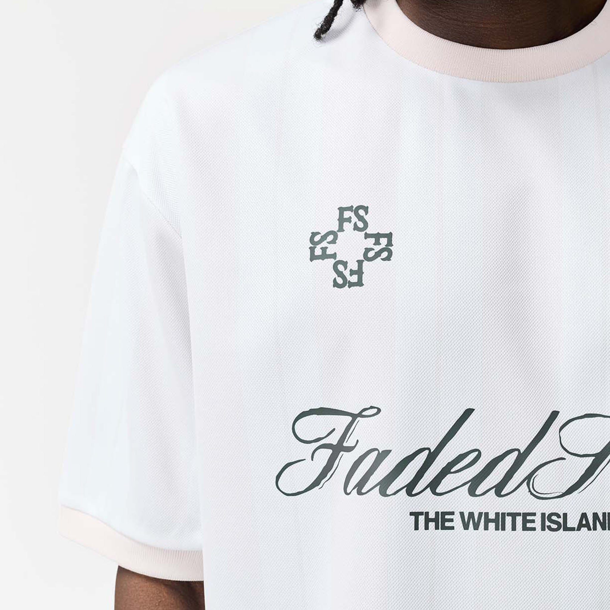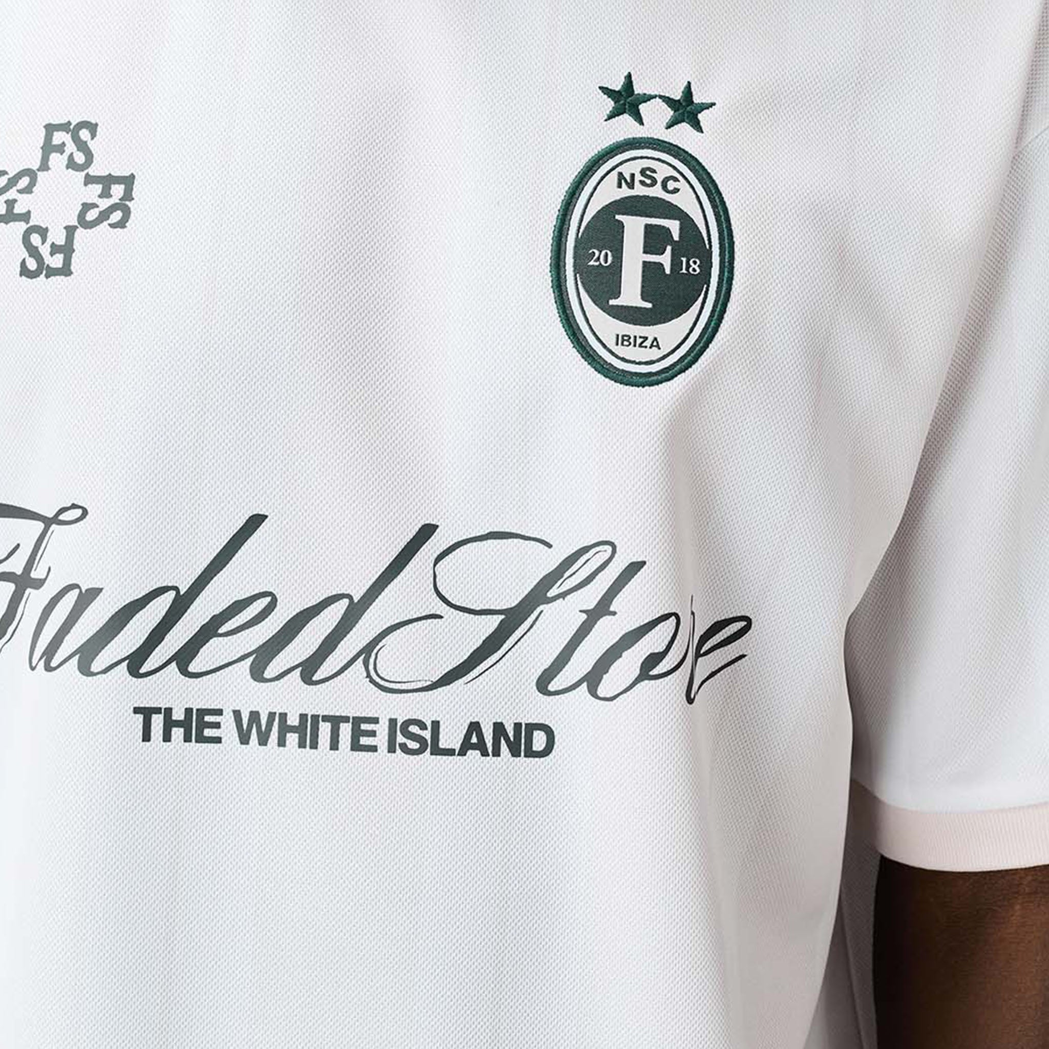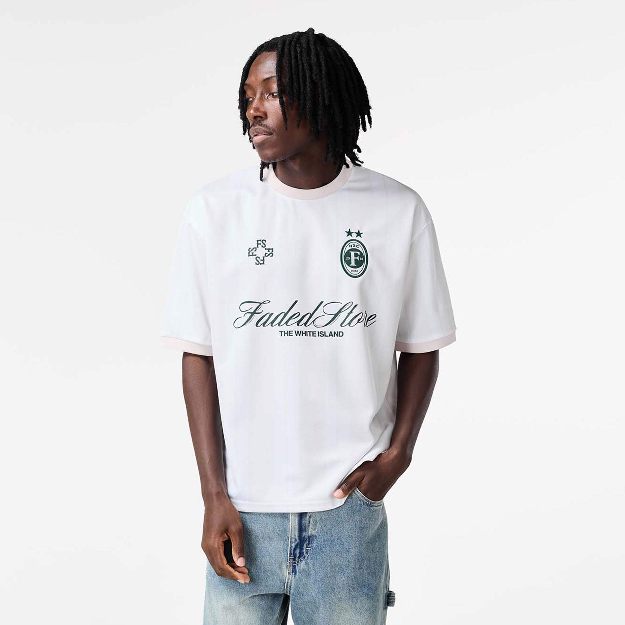Rediscover the Striker Football Tee, reimagined in an iconic off-white and vintage green combination. This standout short-sleeve crew neck offers a contemporary update to a timeless style, featuring meticulously crafted neck and cuff trims and a sharp self-turn hem for a clean silhouette. The subtle stripe design adds an authentic FadedStore touch. Detailed with our signature branding—including a refined chest monogram, a distinctive badge logo, and a classic FadedStore script across the front, seamlessly blending retro cool and a modern edge.