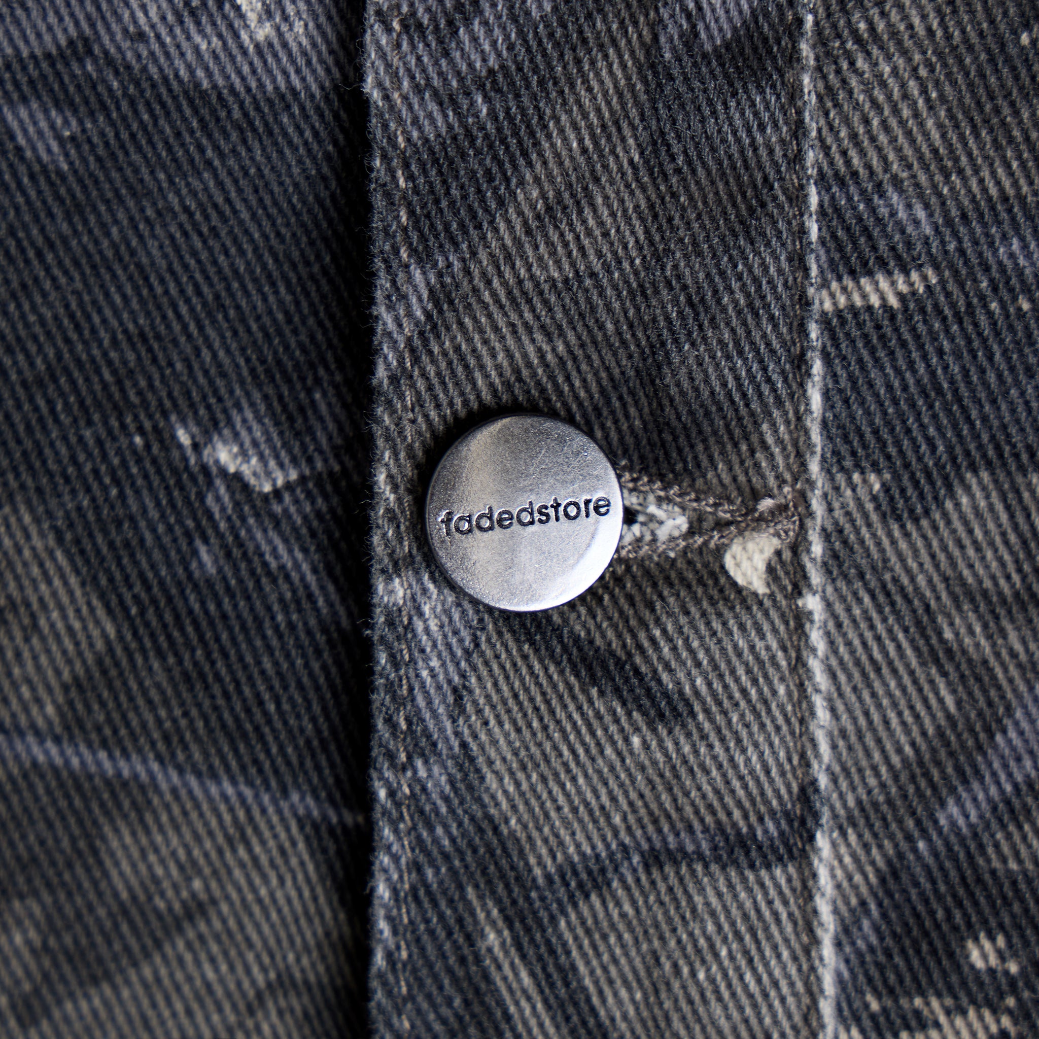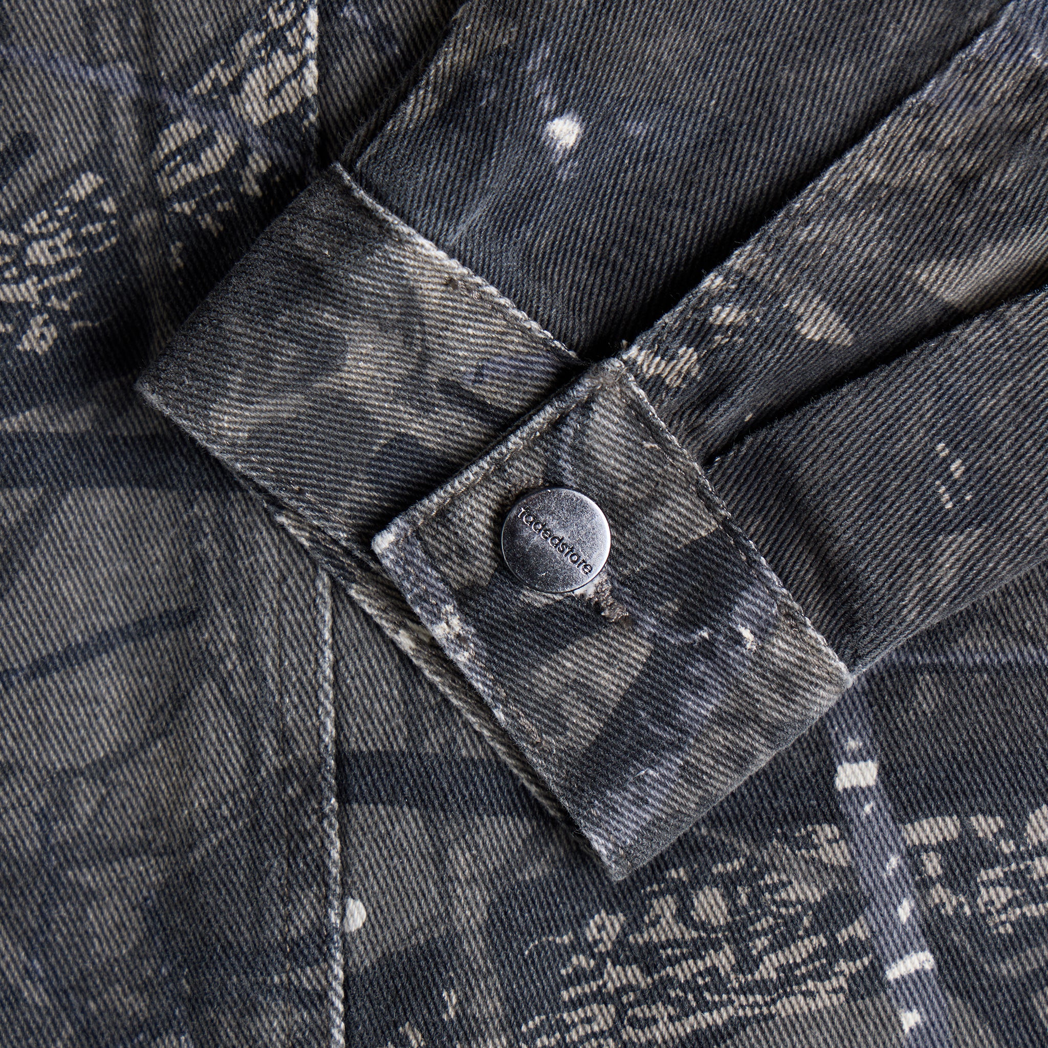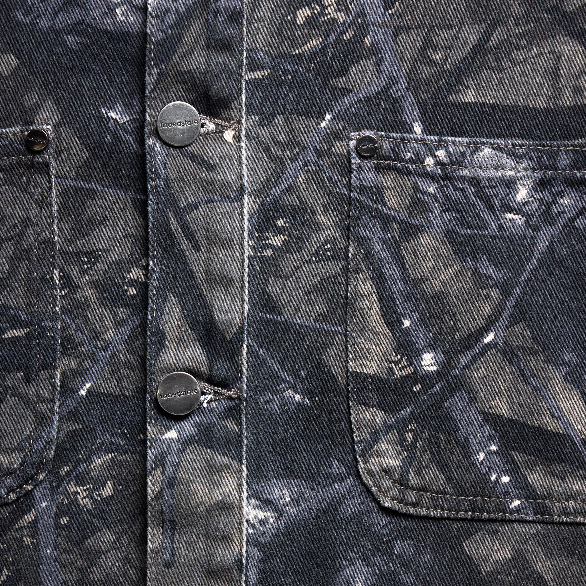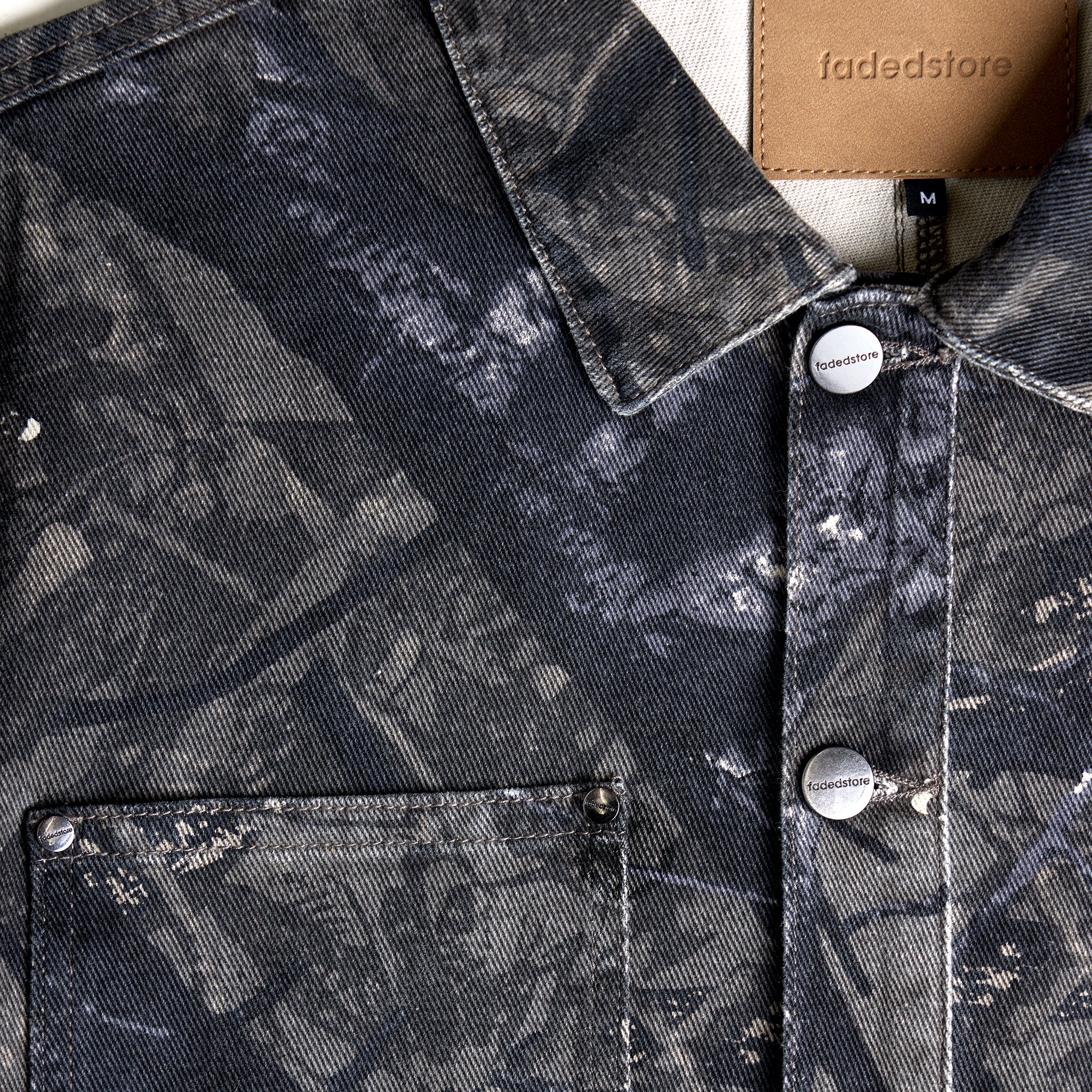 Discover the Tree Camo Print Jacket in grey, a true statement-making piece designed to elevate your wardrobe. It features a smart collar with twin needle stitch and a timeless button-down fastening. Practicality is key with two chest pockets detailed with a Fadedstore leather tab, plus convenient front welt pockets. Authentic rivets on top of the pockets add character. The cuffs are secured by button fastenings, and a clean rear cut and sew seam on the centre provides a refined aesthetic. Make this jacket the centrepiece of your look, or amplify your style by pairing it with the matching jeans for an undeniable statement.